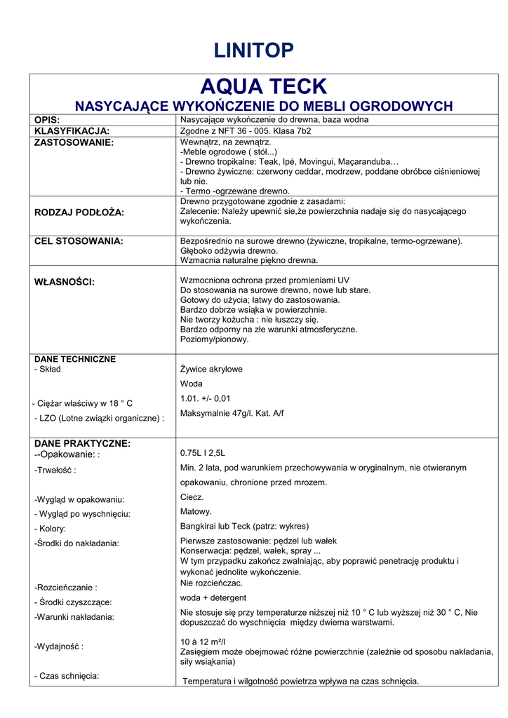 LINITOP AQUA TECK NASYCAJĄCE WYKOŃCZENIE DO MEBLI OGRODOWYCH OPIS: KLASYFIKACJA: ZASTOSOWANIE: RODZAJ PODŁOŻA: Nasycające wykończenie do drewna, baza wodna Zgodne z NFT 36 - 005. Klasa 7b2 Wewnątrz, na zewnątrz. -Meble ogrodowe ( stół...) - Drewno tropikalne: Teak, Ipé, Movingui, Maçaranduba… - Drewno żywiczne: czerwony ceddar, modrzew, poddane obróbce ciśnieniowej lub nie. - Termo -ogrzewane drewno. Drewno przygotowane zgodnie z zasadami: Zalecenie: Należy upewnić sie,że powierzchnia nadaje się do nasycającego wykończenia. CEL STOSOWANIA: Bezpośrednio na surowe drewno (żywiczne, tropikalne, termo-ogrzewane). Głęboko odżywia drewno. Wzmacnia naturalne piękno drewna. WŁASNOŚCI: Wzmocniona ochrona przed promieniami UV Do stosowania na surowe drewno, nowe lub stare. Gotowy do użycia; łatwy do zastosowania. Bardzo dobrze wsiąka w powierzchnie. Nie tworzy kożucha : nie łuszczy się. Bardzo odporny na złe warunki atmosferyczne. Poziomy/pionowy. DANE TECHNICZNE - Skład Żywice akrylowe Woda - Ciężar właściwy w 18 ° C - LZO (Lotne związki organiczne) : 1.01. +/- 0,01 Maksymalnie 47g/l. Kat. A/f DANE PRAKTYCZNE: --Opakowanie: : 0.75L I 2,5L -Trwałość : Min. 2 lata, pod warunkiem przechowywania w oryginalnym, nie otwieranym opakowaniu, chronione przed mrozem. -Wygląd w opakowaniu: Ciecz. - Wygląd po wyschnięciu: Matowy. - Kolory: Bangkirai lub Teck (patrz: wykres) -Środki do nakładania: Pierwsze zastosowanie: pędzel lub wałek Konserwacja: pędzel, wałek, spray ... W tym przypadku zakończ zwalniając, aby poprawić penetrację produktu i wykonać jednolite wykończenie. Nie rozcieńczac. -Rozcieńczanie : - Środki czyszczące: -Warunki nakładania: -Wydajność : - Czas schnięcia: woda + detergent Nie stosuje się przy temperaturze niższej niż 10 ° C lub wyższej niż 30 ° C, Nie dopuszczać do wyschnięcia między dwiema warstwami. 10 à 12 m²/l Zasięgiem może obejmować różne powierzchnie (zależnie od sposobu nakładania, siły wsiąkania) Temperatura i wilgotność powietrza wpływa na czas schnięcia. nie suszy się pomiędzy dwiema warstwami wyciera się pozostały produkt podczas gdy powierzchnia jet nasycana. -Środki ostrożności: Do wiadomości: temperatura drewna na zewnątrz może osiągnąć 60°C nawet, jeśli temperatura na dworze wynosi+30°C - Bezpieczeństwo Sprawdź obecną kartę bezpieczeństwa informację na opakowaniu. Zgodne z obowiązującymi przepisami. PRZYGOTOWANIE PODŁOŻA Stare, zszarzałe, barwione drewna czyści się środkiem do czyszczenia drewna Wood Cleaner. Drewna z wykończeniem, lakierem lub barwione: czyści się lub poleruje przy użyciu środka do czyszczenia drewna Wood Cleaner. Drewna natłuszczone: stosuje się środek odtłuszczający Wood oil cleaner, a następnie środek czyszczący do drewna Wood cleaner. - Wskazania; • Upewnij się, że stolarka jest czysta i sucha. • Tłuste i łuszczące się powłoki muszą być całkowicie usunięte. • Nie nakłada się żadnego bezbarwnego wykończenia dopóki powierzchnia nie jest bardzo starannie przygotowana (szlifowanie, odtłuszczanie,usunięcie kurzu). • Nie nakłada się w temperaturze niższej niż 10°C,w słońcu lub deszczu. - Nakładanie 1. Gotowy do użytku bez rozcieńczania. Usuwać przed i podczas wykonania. 2. Na świeże drewna, jedna warstwa Aqua Teck na powierzchnię nie przekraczającą 30 mm pracy. 3. Nałóż drugą warstwęWyczyść i usuń nadmierną ilość, by uniknąć połysku. 4. Ochrona musi być w drewnie, a nie na powierzchni. - Konserwacja Podczas nakładania sprayem należy zwolnić pod koniec pracy w celu optymalizacji wsiąkania produktów i uzyskania jednolitego wykończenia. Nie dopuszczać do wyschnięcia pomiędzy warstwami.. • Powierzchnię barwioną lub brudną należy wczesniej wyczyścic przy pomocy Wood Cleaner i pozostawic do wyschnięcia (co najmniej 3 dni przy suchej pogodzie). • Jeśli drewno staje sie jaśniejsze,należy położyć warstwę d'Aqua Tech * na całej powierzchni. Nalezy przestrzegać procedury. Nasz dział techniczny jest do Państwa dyspozycji. Zadzwoń do: Belgii: 010 42 00 90 Francji: 01 60 86 48 70 (na rynku francuskim) Albo zajrzyj na naszą stronę www.linitop.com LINITOP to znak firmowy: : Wersja z 15/03/2010