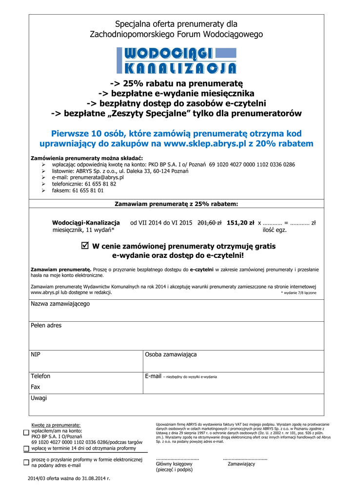 Specjalna oferta prenumeraty dla Zachodniopomorskiego Forum Wodociągowego -> 25% rabatu na prenumeratę -> bezpłatne e-wydanie miesięcznika -> bezpłatny dostęp do zasobów e-czytelni -> bezpłatne „Zeszyty Specjalne” tylko dla prenumeratorów Pierwsze 10 osób, które zamówią prenumeratę otrzyma kod uprawniający do zakupów na www.sklep.abrys.pl z 20% rabatem Zamówienia prenumeraty można składać: wpłacając odpowiednią kwotę na konto: PKO BP S.A. I o/ Poznań 69 1020 4027 0000 1102 0336 0286 listownie: ABRYS Sp. z o.o., ul. Daleka 33, 60-124 Poznań e-mail: [email protected] telefonicznie: 61 655 81 82 faksem: 61 655 81 01 Zamawiam prenumeratę z 25% rabatem: Wodociągi-Kanalizacja miesięcznik, 11 wydań* od VII 2014 do VI 2015 201,60 zł 151,20 zł x ………… = ………… zł ilość egz. W cenie zamówionej prenumeraty otrzymuję gratis e-wydanie oraz dostęp do e-czytelni! Zamawiam prenumeratę. Proszę o przyznanie bezpłatnego dostępu do e-czytelni w zakresie zamówionej prenumeraty i przesłanie hasła na moje konto elektroniczne. Zamawiam prenumeratę Wydawnictw Komunalnych na rok 2014 i akceptuję warunki prenumeraty zamieszczone na stronie internetowej www.abrys.pl lub dostępne w redakcji. * wydanie 7/8 łączone Nazwa zamawiającego Pełen adres NIP Osoba zamawiająca Telefon E-mail – niezbędny do wysyłki e-wydania Fax Uwagi Kwotę za prenumeratę: wpłaciłem/am na konto: PKO BP S.A. I O/Poznań 69 1020 4027 0000 1102 0336 0286/podczas targów wpłacę w terminie 14 dni od otrzymania proformy Upoważniam firmę ABRYS do wystawienia faktury VAT bez mojego podpisu. Wyrażam zgodę na przetwarzanie danych osobowych w celach marketingowych i promocyjnych przez ABRYS Sp. z o.o. w Poznaniu zgodnie z Ustawą z dnia 29 sierpnia 1997 r. o ochronie danych osobowych (Dz. U. z 2002 r. nr 101, poz. 926 z późn. zm.). Wyrażamy zgodę na otrzymywanie drogą elektroniczną ofert oraz innych informacji handlowych od Abrys Sp. z o.o. na podany powyżej adres e-mail. proszę o przysłanie proformy w formie elektronicznej na podany adres e-mail .............................. Główny księgowy (pieczęć i podpis) 2014/03 oferta ważna do 31.08.2014 r. ............................... Zamawiający