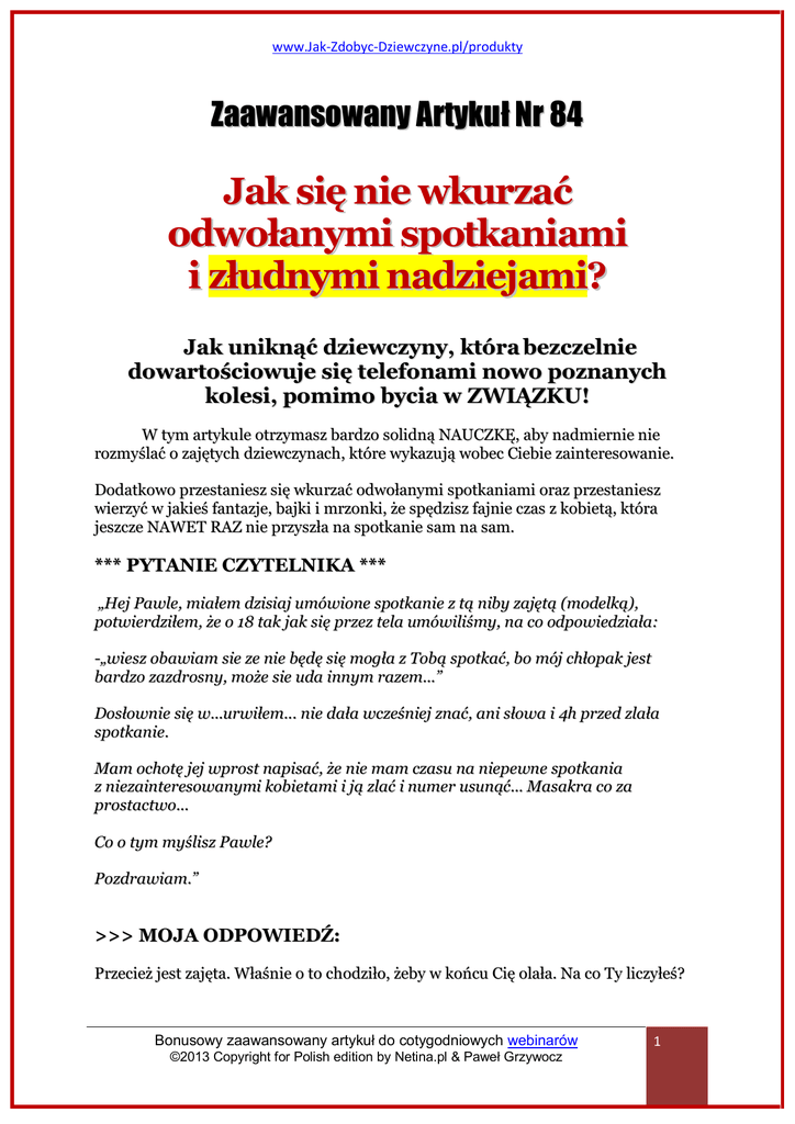 www.Jak-Zdobyc-Dziewczyne.pl/produkty Zaawansowany Artykuł Nr 84 Jak się nie wkurzać odwołanymi spotkaniami i złudnymi nadziejami? Jak uniknąć dziewczyny, która bezczelnie dowartościowuje się telefonami nowo poznanych kolesi, pomimo bycia w ZWIĄZKU! W tym artykule otrzymasz bardzo solidną NAUCZKĘ, aby nadmiernie nie rozmyślać o zajętych dziewczynach, które wykazują wobec Ciebie zainteresowanie. Dodatkowo przestaniesz się wkurzać odwołanymi spotkaniami oraz przestaniesz wierzyć w jakieś fantazje, bajki i mrzonki, że spędzisz fajnie czas z kobietą, która jeszcze NAWET RAZ nie przyszła na spotkanie sam na sam. *** PYTANIE CZYTELNIKA *** „Hej Pawle, miałem dzisiaj umówione spotkanie z tą niby zajętą (modelką), potwierdziłem, że o 18 tak jak się przez tela umówiliśmy, na co odpowiedziała: -„wiesz obawiam sie ze nie będę się mogła z Tobą spotkać, bo mój chłopak jest bardzo zazdrosny, może sie uda innym razem...” Dosłownie się w...urwiłem... nie dała wcześniej znać, ani słowa i 4h przed zlała spotkanie. Mam ochotę jej wprost napisać, że nie mam czasu na niepewne spotkania z niezainteresowanymi kobietami i ją zlać i numer usunąć... Masakra co za prostactwo... Co o tym myślisz Pawle? Pozdrawiam.” >>> MOJA ODPOWIEDŹ: Przecież jest zajęta. Właśnie o to chodziło, żeby w końcu Cię olała. Na co Ty liczyłeś? Bonusowy zaawansowany artykuł do cotygodniowych webinarów ©2013 Copyright for Polish edition by Netina.pl & Paweł Grzywocz 1 www.Jak-Zdobyc-Dziewczyne.pl/produkty *** ODPOWIEDŹ CZYTELNIKA *** „Ale chwile..popierasz jej gówniane zachowanie? Owszem ma do tego prawo, ale to sie mówi przy pytaniu o numer, ewentualnie w rozmowie przez telefon jak proponuje spotkanie i sie umówiliśmy, a nie kilka godzin przed spotkaniem w tym samym dniu... zgadzam się, że skoro zajęta, to nie wypada sie z innymi teoretycznie widywać, ale takie prymitywne zachowanie już na pochwałę nie zasługuje... Myślisz, że zajęta kobieta nie może jakoś tego problemu inaczej rozwiązać, bardziej kulturalnie? Sam zachęcasz do spotkań z zajętymi na odpowiednich zasadach... Plany mi sie przez nią posrały... i szkoda nerwów, bo sam widzisz, że mnie to ruszyło...” >>> MOJA ODPOWIEDŹ: Ta dziewczyna nie jest Ci nic winna. Pełno dziewczyn olewa spotkania. To normalne. Oczywiście, że jest to brak szacunku, ale nie zmienisz tego. Kasuję wtedy numer, a jeśli ją spotkam, to jestem miły, pokazując, że nic się nie stało, zamiast obrażać się jak dziecko. W ten sposób pokazuję klasę, pewność siebie, zrozumienie kobiecych gierek, samokontrolę i jestem dla nich pozytywną niespodzianką, że nie robię jej z tego powodu wyrzutów i rozumiem to, że przecież jesteśmy dla siebie nikim oraz rozumiem to, że nie potrafiła mi ODMÓWIĆ, więc tym bardziej nie powinienem jej krępować moim dopytywaniem się, dlaczego nie przyszła na spotkanie lub je odwołała. To się mówi przy pytaniu o numer, że ona nie chce się spotkać??? Hej, nie wiem, skąd Ty się urwałeś? Myślałem, że masz moje kursy o doprowadzaniu do związku i wysłałem Ci bonus, jak traktować zajętą dziewczynę. Wszędzie powtarzam, że: • kobiety znikają po 8 spotkaniu czasem bez powodu • mają różne intencje przychodzenia na spotkania, jak zabijanie nudy itp., • randkują pomimo posiadania chłopaka Bonusowy zaawansowany artykuł do cotygodniowych webinarów ©2013 Copyright for Polish edition by Netina.pl & Paweł Grzywocz 2 www.Jak-Zdobyc-Dziewczyne.pl/produkty • albo randkują z wieloma potencjalnymi chłopakami i masz nie wierzyć W NIC DO 10 SPOTKAŃ SAM NA SAM. A dopiero po 6 miesiącach TROCHĘ zaufać. A Ty masz jakiś problem z odwołanym spotkaniem z zajętą dziewczyną? Proszę Cię. Chyba pierwszy raz Ci dziewczyna odwołała spotkanie, że taki zdziwiony. Witaj w realnym świecie. • Ona jest dla Ciebie nikim, a Ty jesteś dla niej nikim. • Okazała brak szacunku i brak zainteresowania. • Narobiła nadziei. • Jak wiele dziewczyn, które randkują dla sportu i rozdają numer każdemu, kto o niego zapyta. A Ty byś chciał klarownej sytuacji przy zapytaniu o numer? Niezły żart. To jest TWÓJ PROBLEM, że to ruszyło. Pewnie spotka Cię to jeszcze wiele razy, więc się przygotuj. Takie życie. Kobiety zazwyczaj, gdy nie chcą się spotkać, to odwołują spotkanie. Taki mają sposób. "Boję się odmówić, więc coś wymyślę przed spotkaniem." *** ODPOWIEDŹ CZYTELNIKA *** „Wyluzuj troszkę, tak mam Twoje kursy wraz z tym bonusem i go doskonale znam i tamta strategia jest b.dobra i ją popieram. Ruszył mnie ten brak szacunku do mnie i mojego czasu, a to, że kręci, to wcale jakoś nie dziwi, mam na myśli, że można to inaczej rozwiązać, np. podczas rozmowy i umawiania spotkania odmówić, a nie z wielką chęcią nawet podawać godzinę i się cieszyć na wspólne spotkanie... to wyczujesz automatyczne, stąd o niebo lepsze jest dzwonienie niż pisanie smsów. Nie obrażam się na nią, nic dla mnie nie znaczy. Spotykam się z innymi, próbuję poznać prawdziwe zainteresowanie, jednak jak mi pisze "może kiedyś indziej..." to jej odpisuje - aha, spoko... i że jestem dość zajęty i nie mam czasu na niepewne spotkania, olewam i kasuje numer. Bonusowy zaawansowany artykuł do cotygodniowych webinarów ©2013 Copyright for Polish edition by Netina.pl & Paweł Grzywocz 3 www.Jak-Zdobyc-Dziewczyne.pl/produkty Ona generalnie była chętna do poznania się, od razu to przecież wyczułem, jednak cały czas boi się swojego kolesia, bo ten jest chorobliwie zazdrosny i ją kontroluje... Słuchaj chodzi mi o jakieś normalne zasady z szacunkiem... nie chcesz sie spotkać, masz do tego prawo, ale o tym się powiadamia (tym bardziej teraz przed świętami jak ludzie zabiegani...) Poza tym mam ją... nie powiem gdzie i się z Tobą zgadzam... A Ty myślisz, że ona jest swoim kolesiem prawdziwie zaintereso