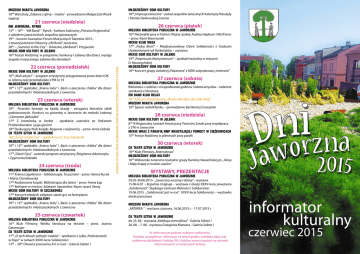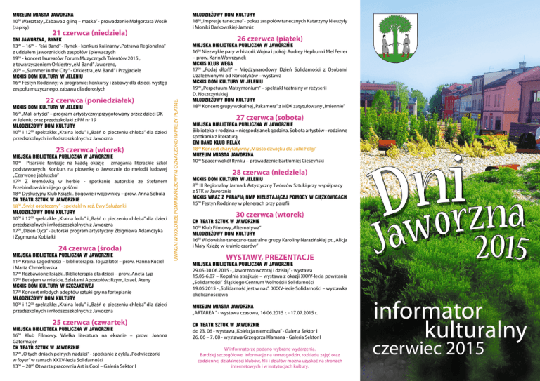 Młodzieżowy Dom Kultury 1800 „Impresje taneczne” - pokaz zespołów tanecznych Katarzyny Nieużyły i Moniki Darkowskiej-Jamróz Muzeum Miasta Jaworzna 1000 Warsztaty „Zabawa z gliną – maska” - prowadzenie Małgorzata Wosik (zapisy) 21 czerwca (niedziela) 26 czerwca (piątek) 22 czerwca (poniedziałek) MCKiS Dom Kultury w Jeleniu 1600 „Mali artyści” – program artystyczny przygotowany przez dzieci DK w Jeleniu oraz przedszkolaki z PM nr 19 Młodzieżowy Dom Kultury 1000 i 1200 spektakle: „Kraina lodu” i „Baśń o pieczeniu chleba” dla dzieci przedszkolnych i młodszoszkolnych z Jaworzna 23 czerwca (wtorek) Miejska Biblioteka Publiczna w Jaworznie 1000 Pisarskie fantazje na każdą okazję - zmagania literackie szkół podstawowych. Konkurs na piosenkę o Jaworznie do melodii ludowej „Czerwone jabłuszko” 1700 Z kremówką w herbie - spotkanie autorskie ze Stefanem Przebindowskim i jego gośćmi 1800 Dyskusyjny Klub Książki. Bogowie i wojownicy – prow. Anna Sobula CK Teatr Sztuk w Jaworznie 1800 „Świst ostateczny” - spektakl w reż. Ewy Sałużanki Młodzieżowy Dom Kultury 1000 i 1200 spektakle: „Kraina lodu” i „Baśń o pieczeniu chleba” dla dzieci przedszkolnych i młodszoszkolnych z Jaworzna 1700 „Dzień Ojca” - autorski program artystyczny Zbigniewa Adamczyka i Zygmunta Kobiałki 24 czerwca (środa) Miejska Biblioteka Publiczna w Jaworznie 1100 Kraina Łagodności – biblioterapia. To już lato! – prow. Hanna Kuciel i Marta Chmielowska 1700 Rozbawione książki. Biblioterapia dla dzieci – prow. Aneta Łyp 1700 Betlejem w mieście. Szlakami Apostołów: Rzym, Izrael, Ateny MCKiS Dom Kultury w Szczakowej 1700 Koncert młodych adeptów sztuki gry na fortepianie Młodzieżowy Dom Kultury 1000 i 1200 spektakle: „Kraina lodu” i „Baśń o pieczeniu chleba” dla dzieci przedszkolnych i młodszoszkolnych z Jaworzna 25 czerwca (czwartek) Miejska Biblioteka Publiczna w Jaworznie 1630 Klub Filmowy. Wielka literatura na ekranie – prow. Joanna Gatermajer CK Teatr Sztuk w Jaworznie 1700 „O tych dniach pełnych nadziei” - spotkanie z cyklu „Podwieczorki w foyer” w ramach XXXV-lecia Solidarności 1300 – 2000 Otwarta pracownia Art is Cool – Galeria Sektor I UWAGA! W kolorze pomarańczowym oznaczono imprezy PŁATNE. Dni Jaworzna, Rynek 1300 – 1600 - ”eM Band” - Rynek - konkurs kulinarny „Potrawa Regionalna” z udziałem jaworznickich zespołów śpiewaczych 1930 - koncert laureatów Forum Muzycznych Talentów 2015., z towarzyszeniem Orkiestry „eM Band” Jaworzno, 2000 – „Summer in the City” - Orkiestra „eM Band” i Przyjaciele MCKiS Dom Kultury w Jeleniu 1600 Festyn Rodzinny; w programie: konkursy i zabawy dla dzieci, występ zespołu muzycznego, zabawa dla dorosłych Miejska Biblioteka Publiczna w Jaworznie 1600 Niezwykłe pary w historii. Wojna i pokój: Audrey Hepburn i Mel Ferrer – prow. Karin Wawrzynek MCKiS Klub Wega 1700 „Podaj dłoń!” – Międzynarodowy Dzień Solidarności z Osobami Uzależnionymi od Narkotyków – wystawa MCKiS Dom Kultury w Jeleniu 1900 „Perpetuum Matrymonium” – spektakl teatralny w reżyserii D. Noszczyńskiej Młodzieżowy Dom Kultury 1800 Koncert grupy wokalnej „Pakamera” z MDK zatytułowany „Imiennie” 27 czerwca (sobota) Miejska Biblioteka Publiczna w Jaworznie Biblioteka + rodzina = niespodzianek godzina. Sobota artystów – rodzinne spotkania z literaturą eM Band Klub Relax 1800 Koncert charytatywny „Miasto dźwięku dla Julki Folgi” Muzeum Miasta Jaworzna 1000 Spacer wokół Rynku – prowadzenie Bartłomiej Cieszyński 28 czerwca (niedziela) MCKiS Dom Kultury w Jeleniu 800 III Regionalny Jarmark Artystyczny Twórców Sztuki przy współpracy z STK w Jaworznie MCKiS wraz z Parafią NMP Nieustającej Pomocy w Ciężkowicach 1500 Festyn Rodzinny w plenerach przy parafii 30 czerwca (wtorek) CK Teatr Sztuk w Jaworznie 1000 Klub Filmowy „Alternatywa” Młodzieżowy Dom Kultury 1600 Widowisko taneczno-teatralne grupy Karoliny Narazińskiej pt. „Alicja i Mały Książę w krainie czarów” Wystawy, prezentacje Miejska Biblioteka Publiczna w Jaworznie 29.05-30.06.2015 - „Jaworzno wczoraj i dzisiaj” - wystawa 15.06-6.07 – Kopalnia strajkuje – wystawa z okazji XXXV-lecia powstania „Solidarności” Śląskiego Centrum Wolności i Solidarności 19.06.2015 - „Solidarność jest w nas”. XXXV-lecie Solidarności – wystawka okolicznościowa Muzeum Miasta Jaworzna „ARTAREA ” - wystawa czasowa, 16.06.2015 r. - 17.07.2015 r. CK Teatr Sztuk w Jaworznie do 23. 06 - wystawa „Kolekcja niemożliwa” - Galeria Sektor I 26. 06 – 7. 08 - wystawa Grzegorza Klamana - Galeria Sektor I W informatorze podano wybrane wydarzenia. Bardziej szczegółowe informacje na temat godzin, rozkładu zajęć oraz codziennej działalności klubów, filii i działów można uzyskać na stronach internetowych i w instytucjach kultury. czerwiec 2015 1 czerwca (poniedziałek) 10 czerwca (środa) Miejska Biblioteka Publiczna w Jaworznie 1700 Kondycja ludzka. Teoria i praktyka. Jednorożec (chiński) – prow. dr hab. Jakub Byrczek 1700 Poznaj świat z Biblioteką. Wirtualne podróże po świecie. Disneyland. Spotkanie dla dzieci i młodzieży – prow. Izabela Wróbel MCKiS Dom Kultury w Jeleniu 1100 Dzień Dziecka na wesoło – zabawy, konkursy i wiele innych atrakcji MCKiS Klub Podłęże 1600 Dzień Dziecka na wesoło – zabawy w plenerze 2 czerwca (wtorek) Miejska Biblioteka Publiczna w Jaworznie 1600 Bobas w Bibliotece – warsztaty dla rodziców małych dzieci 1700 Kondycja ludzka. Teoria i praktyka. Formowanie ósemki – prow. dr hab. Jak ub Byrczek MCKiS Dom Kultury w Jeleniu 1000 „Bal w smerfowym ogrodzie” – spektakl teatralny w wykonaniu Teatrzyku „PoRożek” Młodzieżowy Dom Kultury 1000 „Herbertiada” w XXXV rocznicę powstania NSZZ „Solidarność” 6 czerwca (sobota) Muzeum Miasta Jaworzna 1000 Średniowieczne zamki Polski i ich 