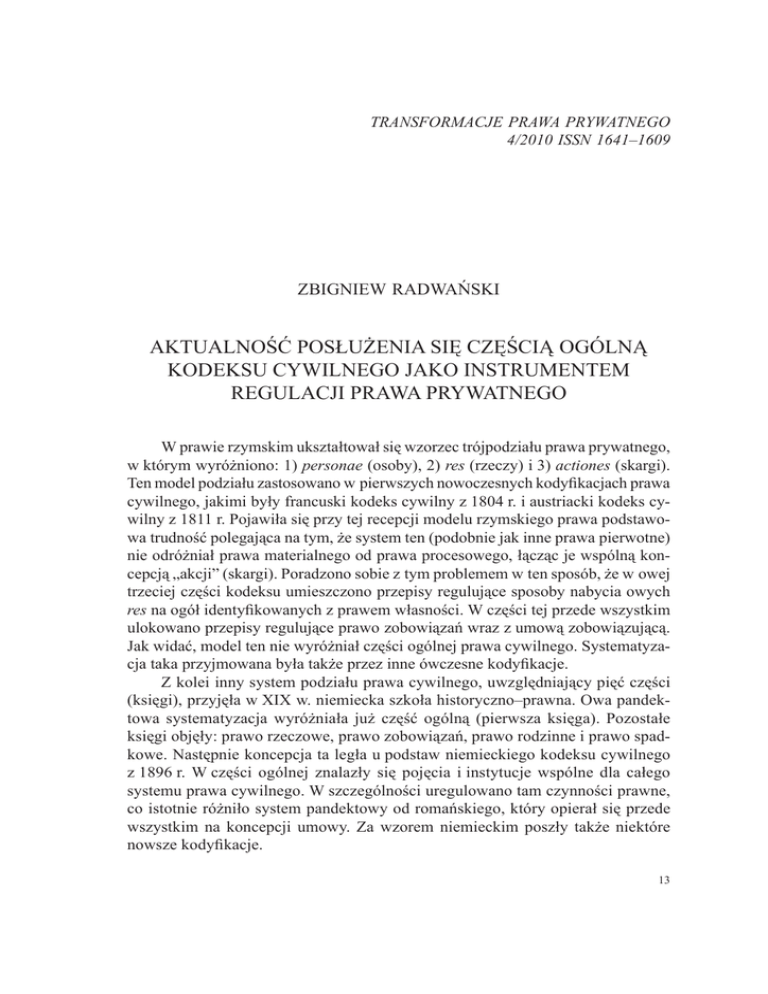 Transformacje Prawa Prywatnego 4/2010 ISSN 1641–1609 Zbigniew Radwański Aktualność posłużenia się częścią ogólną kodeksu cywilnego jako instrumentem regulacji prawa prywatnego W prawie rzymskim ukształtował się wzorzec trójpodziału prawa prywatnego, w którym wyróżniono: 1) personae (osoby), 2) res (rzeczy) i 3) actiones (skargi). Ten model podziału zastosowano w pierwszych nowoczesnych kodyfikacjach prawa cywilnego, jakimi były francuski kodeks cywilny z 1804 r. i austriacki kodeks cywilny z 1811 r. Pojawiła się przy tej recepcji modelu rzymskiego prawa podstawowa trudność polegająca na tym, że system ten (podobnie jak inne prawa pierwotne) nie odróżniał prawa materialnego od prawa procesowego, łącząc je wspólną koncepcją „akcji” (skargi). Poradzono sobie z tym problemem w ten sposób, że w owej trzeciej części kodeksu umieszczono przepisy regulujące sposoby nabycia owych res na ogół identyfikowanych z prawem własności. W części tej przede wszystkim ulokowano przepisy regulujące prawo zobowiązań wraz z umową zobowiązującą. Jak widać, model ten nie wyróżniał części ogólnej prawa cywilnego. Systematyzacja taka przyjmowana była także przez inne ówczesne kodyfikacje. Z kolei inny system podziału prawa cywilnego, uwzględniający pięć części (księgi), przyjęła w XIX w. niemiecka szkoła historyczno–prawna. Owa pandektowa systematyzacja wyróżniała już część ogólną (pierwsza księga). Pozostałe księgi objęły: prawo rzeczowe, prawo zobowiązań, prawo rodzinne i prawo spadkowe. Następnie koncepcja ta legła u podstaw niemieckiego kodeksu cywilnego z 1896 r. W części ogólnej znalazły się pojęcia i instytucje wspólne dla całego systemu prawa cywilnego. W szczególności uregulowano tam czynności prawne, co istotnie różniło system pandektowy od romańskiego, który opierał się przede wszystkim na koncepcji umowy. Za wzorem niemieckim poszły także niektóre nowsze kodyfikacje. 13 Transformacje Prawa Prywatnego 4/2010 Natomiast pośredni niejako kształt przybrało skodyfikowane prawo szwajcarskie. W istotnej mierze wiązało się to ze związkowym charakterem tego państwa, w którym szeroki zakres kompetencji prawodawczych przysługiwał kantonom. Z tego względu postulat unifikacji szwajcarskiego prawa cywilnego udało się pierwotnie przeprowadzić tylko w wąskim zakresie, a mianowicie w kodeksie zobowiązań w 1881 r. Był on w zasadzie tworzony wedle panującego wówczas wzoru francuskiego, gdzie centralną instytucją była umowa zobowiązująca. Jednakże dalszy tok procesu legislacyjnego, który doprowadził do pełnej kodyfikacji szwajcarskiego prawa cywilnego, opierał się już na koncepcji pandektowej. Znalazło to wyraz w uchwaleniu drugiego kodeksu z 1912 r., nazwanego kodeksem cywilnym. Zgodnie więc z koncepcją pandektową wyróżniono w nim jako odrębne części: prawo rodzinne, prawo spadkowe i prawo rzeczowe. Natomiast prawo zobowiązań pozostało w odrębnym, lecz znowelizowanym kodeksie. Znamienne jest jednak, że w podtytule oznaczono ten kodeks jako „Piątą część”. Ponadto kodeks cywilny szwajcarski zawiera wydzielony przed księgami zespół przepisów wstępnych, a art. 7 kodeksu zobowiązań stanowi, że ogólne postanowienia regulujące powstanie, wykonanie i uchylenie umów znajduje zastosowanie także do innych stosunków cywilnoprawnych. Również w Polsce — po odzyskaniu niepodległości — obowiązywało kilka (pięć) systemów prawa cywilnego. Podjęte prace kodyfikacyjne skoncentrowały się najpierw na prawie zobowiązań, doprowadzając do powstania kodeksu zobowiązań z 1933 r. Z oczywistych względów kodyfikacja ta nie mogła objąć swym zakresem problematyki części ogólnej prawa cywilnego. Przedwojenna Komisja Kodyfikacyjna nie rozstrzygnęła struktury przyszłego kodeksu cywilnego, a w nim roli części ogólnej. Wprawdzie zgłoszono w tym względzie różne indywidualne propozycje, to jednak nie były one rozważane przez Komisję Kodyfikacyjną, która zdołała przygotować projekty regulujące tylko niektóre, szczególne działy prawa cywilnego. Natomiast konieczność rozstrzygnięcia tej kwestii pojawiła się po unifikacji prawa cywilnego przeprowadzonej w latach 1945–1946, gdy podjęto prace nad stworzeniem pełnej kodyfikacji prawa cywilnego w 1947 r. Przyjęto wówczas pandektowy system podziału, wyróżniający część ogólną prawa cywilnego w postaci pierwszej księgi kodeksu. Główni referenci projektu kodeksu wyjaśnili zarazem, że: „Mimo pewnych zastrzeżeń, jakie może nasuwać (zwłaszcza zwolennikom myśli prawniczej romańskiej) metoda wielostopniowych abstrakcji, przeważyło zapatrywanie, że polski kodeks cywilny powinien mieć część ogólną. Odpowiada to tendencji do sformułowań oderwanych, która cechuje polską technikę ustawodawczą (…). Skłonność do sformułowań ogólnych, a więc z konieczności oderwanych, staje się coraz bardziej widoczna także w wielu innych prawodawstwach i tłumaczy się zapewne — między innymi — faktem, że reglamentacja ustawowa ogarnia coraz szerszy zakres stosunków społecznych”. W toku J. Wasilkowski, A. Wolter: Projekt kodeksu cywilnego. Część ogólna, Demokratyczny Przegląd Prawniczy 1948, nr 1, s. 10. 14 Zbigniew Radwański:Aktualność posłużenia się częścią ogólną kodeksu cywilnego… dalszych prac kodyfikacyjnych nie odstąpiono od koncepcji wyodrębnienia części ogólnej kodeksu. W uzasadnieniu do projektu kodeksu cywilnego wskazano, że: „W dyskusji publicznej układ projektu nie wywołał zastrzeżeń, jakkolwiek z punktu widzenia metody legislacyjnej wyodrębnienie tzw. części ogólnej może budzić wątpliwości, prowadzi ono bowiem do ujmowania wielu kwestii w sposób bardzo abstrakcyjny (dotyczy to zwłaszcza przepisów o czynnościach prawnych)”. Mimo to Komisja Kodyfikacyjna zdecydowała się na wyodrębnien