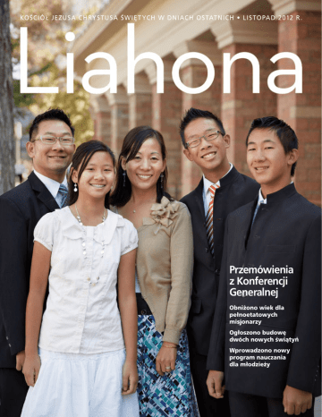KOŚCIÓ Ł JEZUSA CHRYS TUSA Ś W IĘ T YCH W DNIACH OS TATNICH • LIS TOPAD 2012 R . Przemówienia z Konferencji Generalnej Obniżono wiek dla pełnoetatowych misjonarzy Ogłoszono budowę dwóch nowych świątyń Wprowadzono nowy program nauczania dla młodzieży © WALTER RANE, NIE WOLNO KOPIOWAĆ I nasycili się — Walter Rane „A [ Jezus] wziął owe pięć chlebów i dwie ryby, spojrzał w niebo, pobłogosławił, łamał chleby i dawał uczniom, aby kładli przed nimi; i owe dwie ryby rozdzielił między wszystkich. I jedli wszyscy, i nasycili się” (Ew. Marka 6:41–42). „A tych, którzy jedli, było około pięciu tysięcy mężów oprócz niewiast i dzieci” (Ew. Mateusza 14:21). Spis treści, listopad 2012 r. Tom 15 • Numer 4 SOBOTNIA SESJA PORANNA 4Witajcie na konferencji Prezydent Thomas S. Monson 6Czy macie teraz to pragnienie? Starszy Quentin L. Cook 10 Wiem to. Żyję tym. Kocham to. Ann M. Dibb 12 Niewypowiedziany dar Boga Starszy Craig C. Christensen 15 „Bo Ja żyję i wy żyć będziecie” Starszy Shayne M. Bowen 18 Zapytajcie misjonarzy! Oni wam pomogą! Starszy Russell M. Nelson 21 O żalu i postanowieniach Prezydent Dieter F. Uchtdorf SOBOTNIA SESJA POPOŁUDNIOWA 25 Popieranie urzędników Kościoła Prezydent Henry B. Eyring 26 Na drodze do dobrego rodzicielstwa Starszy L. Tom Perry 29 Bądźcie gorliwie zaangażowani w sprawę Starszy M. Russell Ballard 32 „Przyjdź do mnie, ludu Izraela” Starszy Larry Echo Hawk 34 Co da człowiek w zamian za duszę swoją? Starszy Robert C. Gay 37 Normy świątyni Starszy Scott D. Whiting 39 Próba waszej wiary Starszy Neil L. Andersen 43 Chrońcie dzieci Starszy Dallin H. Oaks NIEDZIELNA SESJA PORANNA 72 Gdzie jest ten pawilon? Prezydent Henry B. Eyring 75 Zadośćuczynienie Prezydent Boyd K. Packer 78 Najpierw obserwujcie, potem służcie Linda K. Burton 81 Uczyć się sercem Starszy Walter F. González 83 Największe i pierwsze przykazanie Starszy Jeffrey R. Holland 86 Pomyślcie o błogosławieństwach Prezydent Thomas S. Monson NIEDZIELNA SESJA POPOŁUDNIOWA 90 Być bardziej chrześcijańskim Starszy Robert D. Hales 93 Radość płynąca z odkupienia zmarłych Starszy Richard G. Scott 96 O krok bliżej do Zbawiciela Russell T. Osguthorpe 99 Wszystko stanie się według wiary Starszy Marcus B. Nash 101 Stawanie się prawdziwym uczniem Starszy Daniel L. Johnson 104 Błogosławieństwa sakramentu Starszy Don R. Clarke 106 Nawróceni do Pana Starszy David A. Bednar 110 Niech Bóg będzie z wami do naszego następnego spotkania Prezydent Thomas S. Monson GENERALNE SPOTKANIE STOWARZYSZENIA POMOCY 111 Czy wiara w Zadośćuczynienie Jezusa Chrystusa jest wypisana w naszych sercach? Linda K. Burton 115 Obudźmy się i wypełniajmy swe obowiązki Carole M. Stephens 118 Pan was nie zapomniał Linda S. Reeves 121 Opiekunka Prezydent Henry B. Eyring 64 Przedstawiciele Władz Naczelnych Kościoła Jezusa Chrystusa Świętych w Dniach Ostatnich 125 Indeks historii wspomnianych podczas konferencji 26 Wiadomości kościelne 1 28 Generalne prezydia organizacji 1 pomocniczych SESJA KAPŁAŃSKA 47 Bracia, mamy pracę do wykonania Starszy D. Todd Christofferson 51 Bądźcie odważni, silni i działajcie Biskup Gary E. Stevenson 54 Czuwajcie nad sobą Starszy Anthony D. Perkins 57 Radość w kapłaństwie Prezydent Dieter F. Uchtdorf 60 Pomóżcie im, aby mierzyli wysoko Prezydent Henry B. Eyring 68 Postrzegajcie ludzi takimi, jakimi mogą się stać Prezydent Thomas S. Monson Listopad 2012 1 Streszczenie 182. Jesiennej Konferencji Generalnej SOBOTNI PORANEK, 6 PAŹDZIERNIKA 2012 R., SESJA OGÓLNA Przewodniczy: Prezydent Thomas S. Monson. Prowadzi: Prezydent HenryB. Eyring. Modlitwa na rozpoczęcie: Starszy Kevin R. Duncan. Mod litwa na zakończenie: Starszy Juan A. Uceda. Muzyka: Chór Tabernakulum; dyrygenci: Mack Wilberg i Ryan Murphy; organiści: Clay Christiansen i Richard Elliott — „Glory to God on High”, Hymns, nr 67; „Jak mocna podstawa”, Hymny oraz pieśni dla dzieci, str. 7, aranż. Wilberg, publ. Oxford; „Panie, chcę za Tobą iść”, Hymny oraz pieśni dla dzieci, str. 117; „Dziękujemy Ci, Boże, za pro roka”, Hymny oraz pieśni dla dzieci, str. 47; „I Will Follow God’s Plan”, Children’s Songbook, nr 164, aranż. Hofheins, niepublikowane; „Radujmy się”, Hymny oraz pieśni dla dzieci, str. 56, aranż. Wilberg, niepublikowane. SOBOTNIE POPOŁUDNIE, 6 PAŹDZIERNIKA 2012 R., SESJA OGÓLNA Przewodniczy: Prezydent Thomas S. Monson. Prowadzi: Prezydent Dieter F. Uchtdorf. Modlitwa na rozpoczęcie: Starszy Gerrit W. Gong. Modlitwa na zakończenie: Starszy Jose L. Alonso. Muzyka: połączony chór młodzieży z Bennion i Taylorsville z Utah; dyrygentka: Leah Tarrant; organistki: Linda Margetts i Bonnie Goodliffe — „Arise, O Glorious Zion”, Hymns, nr 407; „Bóg moim Ojcem jest”, Hymny oraz pieśni dla dzieci, str. 96, aranż. Perry, niepublikowane; „Śmiało naprzód”, Hymny oraz pieśni dla dzieci, str. 16; „On This Day of Joy and Gladness”, Hymns, nr 64, aranż. Huff, niepublikowane. SOBOTNI WIECZÓR, 6 PAŹDZIERNIKA 2012 R., SESJA KAPŁAŃSKA Przewodniczy: Prezydent Thomas S. Monson. Prowadzi: Prezydent Dieter F. Uchtdorf. Modli twa na rozpoczęcie: Starszy Jay E. Jensen. Mod litwa na zakończenie: Starszy Patrick Kearon. Muzyka: chór Kapłaństwa Melchizedeka z Ogden w Utah; dyrygenci: Stephen P. Schank i Derek Furch; organista: Andrew Unsworth — „Praise to the Lord, the Almighty”, Hymns, nr 72; „Miłość wzajemna”, Hymny oraz pieśni dla dzieci, str. 124, aranż. Furch, niepubliko wane; „Guide Us, O Thou Great Jehovah”, Hymns, nr 83; „Hope of Israel”, Hymns, nr 259, aranż. Schank, niepublikowane. 2 Liahona NIEDZIELNY PORANEK, 7 PAŹDZIERNIKA 2012 R., SESJA OGÓLNA Przewodniczy: Prezydent Thomas S. Monson. Prowadzi: Prezydent Dieter F. Uchtdorf. Modlitwa na rozpoczęcie: Starszy Marlin K. Jensen. Modlitwa na zakończenie: Starszy Keith R. Edwards. Muzyk