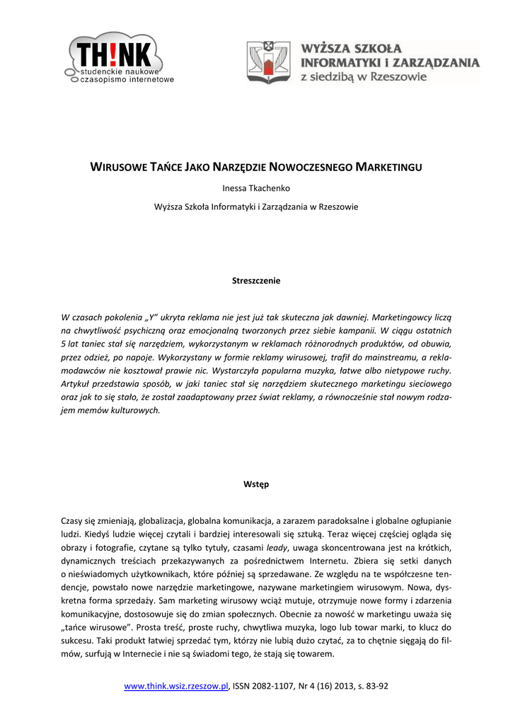 WIRUSOWE TAŃCE JAKO NARZĘDZIE NOWOCZESNEGO MARKETINGU Inessa Tkachenko Wyższa Szkoła Informatyki i Zarządzania w Rzeszowie Streszczenie W czasach pokolenia „Y” ukryta reklama nie jest już tak skuteczna jak dawniej. Marketingowcy liczą na chwytliwość psychiczną oraz emocjonalną tworzonych przez siebie kampanii. W ciągu ostatnich 5 lat taniec stał się narzędziem, wykorzystanym w reklamach różnorodnych produktów, od obuwia, przez odzież, po napoje. Wykorzystany w formie reklamy wirusowej, trafił do mainstreamu, a reklamodawców nie kosztował prawie nic. Wystarczyła popularna muzyka, łatwe albo nietypowe ruchy. Artykuł przedstawia sposób, w jaki taniec stał się narzędziem skutecznego marketingu sieciowego oraz jak to się stało, że został zaadaptowany przez świat reklamy, a równocześnie stał nowym rodzajem memów kulturowych. Wstęp Czasy się zmieniają, globalizacja, globalna komunikacja, a zarazem paradoksalne i globalne ogłupianie ludzi. Kiedyś ludzie więcej czytali i bardziej interesowali się sztuką. Teraz więcej częściej ogląda się obrazy i fotografie, czytane są tylko tytuły, czasami leady, uwaga skoncentrowana jest na krótkich, dynamicznych treściach przekazywanych za pośrednictwem Internetu. Zbiera się setki danych o nieświadomych użytkownikach, które później są sprzedawane. Ze względu na te współczesne tendencje, powstało nowe narzędzie marketingowe, nazywane marketingiem wirusowym. Nowa, dyskretna forma sprzedaży. Sam marketing wirusowy wciąż mutuje, otrzymuje nowe formy i zdarzenia komunikacyjne, dostosowuje się do zmian społecznych. Obecnie za nowość w marketingu uważa się „tańce wirusowe”. Prosta treść, proste ruchy, chwytliwa muzyka, logo lub towar marki, to klucz do sukcesu. Taki produkt łatwiej sprzedać tym, którzy nie lubią dużo czytać, za to chętnie sięgają do filmów, surfują w Internecie i nie są świadomi tego, że stają się towarem. www.think.wsiz.rzeszow.pl, ISSN 2082-1107, Nr 4 (16) 2013, s. 83-92 Wirusowe tańce jako narzędzie nowoczesnego marketingu 1. Internet jako miejsce tworzenia tańców wirusowych Prawie każdy internauta oglądał chociaż raz za pośrednictwem telewizji internetowej (przykładowo w YouTube), jakikolwiek żartobliwy taniec. Takie formy stają się popularne ze względu na swoją prostotę, łatwość zrozumienia i humorystyczny sposób prezentacji. Korzeni zamiłowania do ekspresji za pomocą tańca należy szukać u źródeł ewolucji człowieka. Taniec jest ważnym elementem wielu rytuałów religijnych. Uważa się, że powtarzające się rytmiczne ruchy pomagają przybliżyć się do stanu nirwany, oczyszczenia umysłu, pobudzają uśpioną energię. Tańczono przy okazji różnych świąt, rozpoczynając wojnę, okazując szacunek przywódcom, podczas ślubów i modlitw1. Można więc przypuszczać, że ten pierwotny zwyczaj jest jednym ze źródeł popularności tańców wirusowych, ale również tych, którą swoją karierę zrobiły poza Internetem, jak „Lambada” lub „Macarena”. Dziś dzięki globalnej sieci takie formy jak Gangnam style, Harlem shake zna prawie każdy internauta na całym świecie, wie jak się je tańczy i do jakiej muzyki. Te tańce same w sobie nie zawierają żadnych istotnych, symbolicznych treści, ale stanowią istotne narzędzie oddziaływania na odbiorców, zwłaszcza jeśli doda się do nich element reklamy – dźwięk – który przez odbiorców kojarzony jest z konkretnym produktem. Marketing wpleciony w takie teledyski staje się istotny ze względu na zasięg – na kanale YouTube tańce wirusowe potrafią zdobywać nawet 100 000 fanów w ciągu jednego dnia. Dlaczego są tak popularne? Istotne wydaje się również pytanie o sposób percepcji tych tańców, takiego rodzaju muzyki. Czy traktowane są jedynie w kategorii żartu? Czy możliwe jest, że to nie tylko formą rozrywki, ale w szerszym rozumieniu, element kultury, narzędzie marketingowe? Początkowo nagrania tego typu przyjmowano jako rodzaj żartów internetowych (dowcipy, linki do treści i plików, do obiektów multimedialnych, a następnie filmy). Internauci chętnie udostępniali takie informacje w sieciach społecznościowych, ponieważ kojarzono je z humorem i rozrywką. Jednak prawdziwa kariera tańca wirusowego zaczęła się wraz z dynamicznym rozwojem telewizji internetowej, kiedy to specjaliści od marketingu dostrzegli w nich cenne narzędzie reklamy. Dzisiaj mówi się już o istotnym zjawisku, rozszerzającym się wraz z rozwojem wideo blogów, zwanych vlogami2. Internet udostępnia zarówno przestrzeń jak i technologię do tworzenia i rozpowszechnienia memów tanecznych i innych treści wirusowych: demotywatorów, filmów, zdjęć. I choć wszystkie te zjawiska znane były już wcześniej, dopiero sieć umożliwiła rozpowszechnianie ich na taką skalę. Mechanizm rozprzestrzeniania się memu w sieci jest podobny do aktywności wirusa biologicznego w organizmie człowieka – jest miejscem jego życia i rozwoju. 2. Historia rozwoju tańca wirusowego Już dawno minęły czasy twista, a Lambadę i Macarenę pamiętają wszyscy. 1 Mikuschyn T. N., Taniec - jako ważny element wielu obrzędów religijnych, [z:] http://psycity.ru/?id=9&sort=0, 4.06.2011. 2 Jeleśniański M., Definicja i rodzaje blogów, [z:] http://eredaktor.pl/teoria/definicja-i-rodzaje-blogow, 17.03.2012. 84 Wirusowe tańce jako narzędzie nowoczesnego marketingu W latach 90. Lambadę i Macarenę aktywnie propagowały telewizja i radio, dlatego tradycyjne media można uważać za pierwsze kanały promocyjne tańców wirusowych. 2.1. Francuska Lambada stała się brazylijską Wszystko zaczęło się w latach 80. Nieznany francuski zespół „Kaoma” stworzył piosenkę Lambada. Najpierw piosenkarze zaśpiewali Lambadę w lokalnej telewizji, a następnego dnia obudzili się już jako gwiazdy, autorzy popularnego utworu. O nowej piosence najpierw dowiedziała 