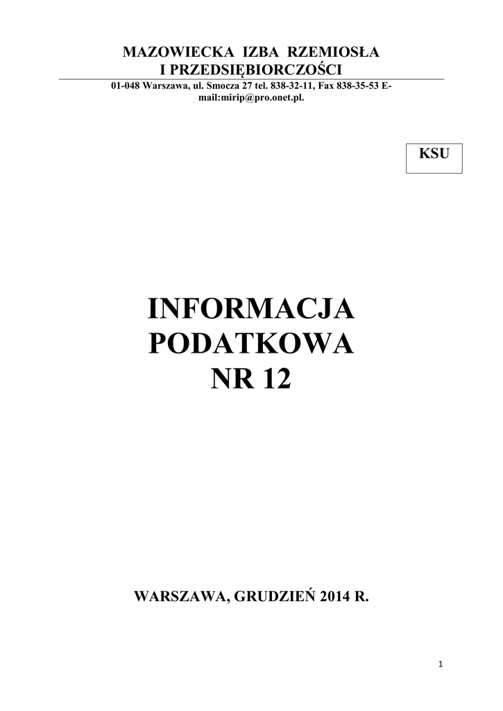 MAZOWIECKA IZBA RZEMIOSŁA I PRZEDSIĘBIORCZOŚCI 01-048 Warszawa, ul. Smocza 27 tel. 838-32-11, Fax 838-35-53 Email:[email protected]. KSU INFORMACJA PODATKOWA NR 12 WARSZAWA, GRUDZIEŃ 2014 R. 1 WYNAGRODZENIE UCZNIÓW OD 1 GRUDNIA 2014 R. Prezes GUS ogłosił, że wynagrodzenie przeciętne w III kwartale 2014 roku wyniosło 3781,14 zł. W związku z tym zmienia się wynagrodzenie minimalne uczniów. Za okres od 1 grudnia 2014 r. do 28 lutego 2015 r. wynosi ono: w pierwszym roku nauki - nie mniej niż 4% w drugim roku nauki - nie mniej niż 5% w trzecim roku nauki - nie mniej niż 6% - tj. 151,25 zł - tj. 189,06 zł - tj. 226,87 zł OD 1 GRUDNIA NOWY DRUK ZGŁOSZENIA NIP-8 Ministerstwo Finansów opublikowało rozporządzenie w sprawie wzorów formularzy zgłoszeń identyfikacyjnych i zgłoszeń aktualizacyjnych oraz zgłoszeń w zakresie danych uzupełniających. W drodze rozporządzenia zmianie ulegnie: 1. Druk NIP-2 - zgłoszenie identyfikacyjne/zgłoszenie aktualizacyjne osoby prawnej lub jednostki organizacyjnej niemającej osobowości prawnej, będącej podatnikiem lub płatnikiem, 2. Druk NIP-7 - zgłoszenie identyfikacyjne/zgłoszenie aktualizacyjne osoby fizycznej będącej podatnikiem lub płatnikiem, 3. Druk ZAP-3 - zgłoszenie aktualizacyjne osoby fizycznej będącej podatnikiem. Pojawi się całkowicie nowy druk NIP-8 - zgłoszenie identyfikacyjne/zgłoszenie aktualizacyjne w zakresie danych uzupełniających. Druk ten będzie dotyczył firm, które rejestrują się w KRS. Na druku NIP-8 przedsiębiorca zobowiązany będzie wskazać tzw. ,,dane uzupełniające”, wcześniej nieujawnione we wniosku KRS. Dane uzupełniające są to dane, którymi przedsiębiorca nie dysponował w momencie składania samego wniosku w KRS, a więc m.in. adres prowadzenia działalności gospodarczej, wykaz rachunków bankowych, czy też skrócona nazwa płatnika składek. Przedsiębiorca formularz NIP-8 zobowiązany będzie złożyć we właściwym dla siebie urzędzie skarbowym. To urząd skarbowy przekaże „dane uzupełniające” przedsiębiorcy do Zakładu Ubezpieczeń Społecznych i Głównego Urzędu Statystycznego. Nowe druki zaczną obowiązywać od 1 grudnia 2014 roku. Będą dostępne w dziale deklaracje PIT.pl. Od 1 grudnia 2014 r. tj. daty wejścia w życie rozporządzenia druki te będzie można składać elektronicznie. W Dz. U. z 28.11.2014 r. poz. 1665 opublikowano rozporządzenie MF z 25.11.2014r. w sprawie wzorów formularzy zgłoszeń identyfikacyjnych i aktualizacyjnych: NIP-2, NIP-7, ZAP-3, NIP-8. Natomiast w Dz. U. z 28.11.2014r. poz. 1666 opublikowano rozporządzenie MF z 26.11.2014r. w sprawie określenia rodzajów zgłoszeń, które mogą być składane za pomocą środków komunikacji elektronicznej. 2 NOWA DEKLARACJA PIT/UZ DO ROZLICZEŃ PIT ZA 2014 ROK Ministerstwo Finansów przygotowało wzór nowej deklaracji podatkowej PIT/UZ będącej częścią uzupełniającą zeznania PIT-36 i PIT-37. Nowa deklaracja służyć ma rozliczaniu ulgi na dzieci za 2014 rok. Deklaracja PIT/UZ dotyczyć będzie dla tych podatników, którzy w zeznaniu podatkowym PIT-36 lub PIT-37 za 2014 rok będą chcieli rozliczyć ulgę na dzieci – a u których kwota przysługującego odliczenia z tytułu ulgi na dzieci jest wyższa od kwoty odliczonej w zeznaniu PIT-36 lub PIT-37. Druk ten będą musieli złoży w ww. sytuacji również małżonkowie rozliczający się wspólnie. Ww. zobowiązani będą do złożenia jednej, wspólnej deklaracji PIT/UZ. Wprowadzenie nowej deklaracji PIT/UZ nie spowoduje usunięcia deklaracji PIT/O. Deklaracja ta nadal będzie miała zastosowanie jednak wyłącznie w przypadku podatników rozliczających ulgę prorodzinną, u których kwota przysługującego odliczenia z tytułu ulgi na dzieci będzie niższa od kwoty odliczonej w zeznaniu PIT-36 lub PIT-37. Rozporządzenie MF z 27.11.2014r. w spawie określenia wzoru części uzupełniającej zeznania podatkowego składanego za rok 2014 opublikowano w Dz.U. z 28.11.2014 poz. 1673. Rozporządzenie wchodzi w życie 1.01.2015r. i ma zastosowanie do uzyskanych dochodów (przychodów) bądź poniesionych strat za 2014 rok. ZMIANY W KRS OD 1 GRUDNIA 2014 R. 1 grudnia 2014 wchodzą w życie zmiany, które pozwolą m.in. na automatyczne zakładanie konta płatnikom składek, którzy rozpoczynają działalność i podlegają obowiązkowi wpisu w Krajowym Rejestrze Sądowym (KRS). Warunkiem utworzenia przez ZUS konta płatnika składek, na którym rozliczane będą składki na poszczególne ubezpieczenia za wszystkie zatrudniane osoby podlegające z tego tytułu ubezpieczeniom, jest poprawne i dokładne wypełnienie wniosku w KRS w zakresie danych podstawowych oraz zgłoszenie w urzędzie skarbowym, w terminie 7 dni od daty rejestracji w KRS, wypełnionego druku "Zgłoszenie identyfikacyjne/ zgłoszenie aktualizacyjne w zakresie danych uzupełniających" (formularz NIP-8). Na podstawie danych podstawowych i uzupełniających przekazanych przez Centralny Rejestr Podmiotów - Krajowej Ewidencji Podatników (CRP-KEP), Zakład Ubezpieczeń Społecznych (ZUS) sporządzi dokumenty zgłoszeniowe płatnika składek: ZUS ZPA - Zgłoszenie / zmiana danych płatnika składek - osoby prawnej lub jednostki organizacyjnej nieposiadającej osobowości prawnej, ZUS ZAA - Adresy prowadzenia działalności gospodarczej przez płatnika składek, ZUS ZBA - Informacja o numerach rachunków bankowych płatnika składek. Po utworzeniu konta płatnika składek pozostanie jedynie obowiązek zgłoszenia do ubezpieczeń zatrudnionych osób, a także członków ich rodzin. 3 ZUS na podstawie danych przekazanych przez CRP-KEP zaktualizuje również dane i utworzy dokumenty: ZUS ZPA - w zakresie zgłoszenia zmiany danych (ewidencyjnych) płatnika składek osoby prawnej lub jednostki organizacyjnej nieposiadającej osobowości prawnej, ZUS ZIPA - w zakresie zgłoszenia zmiany danych identyfikacyjnych płatnika składek, ZUS ZWPA - w zakresie wyrejes
