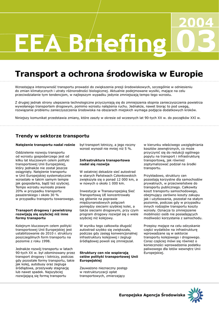 2004 03 Transport a ochrona środowiska w Europie Wzrastająca intensywność transportu prowadzi do zwiększenia presji środowiskowych, szczególnie w odniesieniu do zmian klimatycznych i utraty różnorodności biologicznej. Aktualnie podejmowane wysiłki, mające na celu przeciwdziałanie tym tendencjom, w najlepszym wypadku jedynie zmniejszają tempo tego wzrostu. Z drugiej jednak strony ulepszenia technologiczne przyczyniają się do zmniejszenia stopnia zanieczyszczenia powietrza wywołanego transportem drogowym, pomimo wzrostu natężenia ruchu. Jednakże, nawet biorąc to pod uwagę, rozwiązanie problemu zanieczyszczenia środowiska na obszarach miejskich wymaga podjęcia dodatkowych kroków. Niniejszy komunikat przedstawia zmiany, które zaszły w okresie od wczesnych lat 90-tych XX w. do początków XXI w. Trendy w sektorze transportu Natężenie transportu nadal rośnie Oddzielenie rozwoju transportu od wzrostu gospodarczego jest od kilku lat kluczowym celem polityki transportowej Unii Europejskiej, który jednakże nie został jeszcze osiągnięty. Natężenie transportu w Unii Europejskiej systematycznie wzrastało w takim samym tempie jak gospodarka, bądź też szybciej. Tempo wzrostu wyniosło prawie 20% w przypadku transportu pasażerskiego i około 30 % w przypadku transportu towarowego. był transport lotniczy, a jego roczny wzrost wynosił nie mniej niż 5 %. Infrastruktura transportowa nadal się rozwija W ostatniej dekadzie sieć autostrad w starych Państwach Członkowskich zwiększyła się o ponad 12 000 km, a w nowych o około 1 000 km. Transport drogowy i powietrzny rozwijają się szybciej niż inne formy transportu Inwestycje w Transeuropejską Sieć Transportową UE koncentrowały się głównie na poprawie międzynarodowych połączeń pomiędzy sieciami szybkiej kolei, a także sieciami drogowymi, przy czym program drogowy rozwijał się o wiele szybciej niż kolejowy. Kolejnym kluczowym celem polityki transportowej Unii Europejskiej jest ustabilizowanie do 2010 r. struktury poszczególnych form transportu na poziomie z roku 1998. W wyniku tego całkowita długość autostrad szybko się zwiększała, podczas gdy zasięg konwencjonalnej infrastruktury kolejowej i żeglugi śródlądowej powoli się zmniejszał. Jednakże rozwój transportu w latach 90-tych XX w. był zdominowany przez transport drogowy i lotniczy, podczas gdy pozostałe formy transportu, takie jak kolej, autobusy oraz żegluga śródlądowa, przeżywały stagnację lub nawet spadek. Najszybciej rozwijającą się formą transportu Struktury cen nie wspierają celów polityki transportowej Unii Europejskiej w kierunku właściwego uwzględniania kosztów zewnętrznych, co może przyczynić się do redukcji ogólnego popytu na transport i infrastrukturę transportową, jak również zoptymalizować podział na środki transportu. Przykładowo, struktury cen pozostają korzystne dla samochodów prywatnych, w przeciwieństwie do transportu publicznego. Całkowity koszt transportu samochodowego, obejmujący zarówno koszty zakupu jak i użytkowania, pozostał na stałym poziomie, podczas gdy w przypadku innych rodzajów transportu koszty wzrosły. Oznacza to zmniejszenie mobilności osób nie posiadających możliwości korzystania z samochodu. Przepisy mające na celu odzyskanie części wydatków na infrastrukturę wprowadzane są w sektorze transportu kolejowego i drogowego. Coraz częściej mówi się również o konieczności wprowadzenia podatku paliwowego dla lotów wewnętrz Unii Europejskiej. Zauważono nieznaczny postęp w restrukturyzacji opłat transportowych, zmierzający Europejska Agencja Środowiska 2004 03 Trendy w ochronie środowiska Zmniejsza się emisja szkodliwych zanieczyszczeń W sektorze transportu drogowego zaobserwowano znaczny spadek emisji szkodliwych zanieczyszczeń. Spadek ten można przypisać europejskim normom emisyjnym dla pojazdów samochodowych, które są stopniowo zaostrzane od początku lat 90-tych XX w. i proces ten trwa nadal. Emisje kontrolowanych substancji zanieczyszczających zmniejszyły się o 24 %–35 % (dane te nie obejmują międzynarodowego transportu lotniczego i transportu morskiego). Jednakże, pomimo zmniejszenia zanieczyszczenia środowiska wywołanego transportem drogowym, nadal istnieją poważne problemy z jakością powietrza na obszarach miejskich. Aby zmniejszyć stopień narażenia ludzi na zanieczyszczenia mające wpływ na zdrowie, niezbędne jest podjęcie dodatkowych inicjatyw. Równie ważne, jak dalsze zaostrzanie norm dla pojazdów, jest zapewnienie, aby cykle testowe odzwierciedlały rzeczywiste warunki pracy samochodów, biorąc pod uwagę również zmiany oprogramowania w pojazdach napędzanych silnikiem Diesla (tzw. ‘chip-tuning’). Normy emisyjne zostaną po raz pierwszy wprowadzone dla lokomotyw kolejowych i jednostek żeglugi śródlądowej, począwszy od roku 2005. Międzynarodowe normy emisyjne dla samolotów, istniejące już od wielu lat, zostały zaostrzone w latach 90-tych XX w. Jednakże normy te uwzględniają jedynie emisje na terenach lotnisk i w ich okolicach, natomiast emisje w czasie przelotu, które przyczyniają się od globalnego ocieplenia, nie są brane pod uwagę. Zwiększa się emisja gazów cieplarnianych Samochody pasażerskie są coraz sprawniejsze. Powoduje to zmniejszenie poziomu emisji CO2 dla pojedynczych samochodów. Jednakże zwiększenie natężenia transportu wyrównało, a nawet przeważyło te osiągnięcia. Wynikiem tego jest ogólne zwiększenie o około 20 % emisji CO2 przez środki transportu drogowego. Obecne zobowiązania przemysłu samochodowego do zmniejszenia emisji CO2 przez samochody wygasają w latach 2008/2009. Dlatego też istnieje potrzeba określenia warunków na przyszłość, rozszerzając ich zakres o samochody dostawcze oraz zapewnienie by cykle testowe odzwierciedlały rzeczywiste warunki pracy samochodów i uwzględniały wykorzystanie takiego wyposażenia j