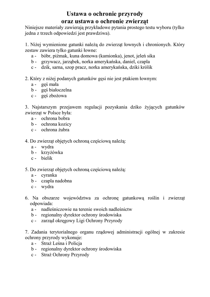 Ustawa o ochronie przyrody oraz ustawa o ochronie zwierząt Niniejsze materiały zawierają przykładowe pytania prostego testu wyboru (tylko jedna z trzech odpowiedzi jest prawdziwa). 1. Niżej wymienione gatunki należą do zwierząt łownych i chronionych. Który zestaw zawiera tylko gatunki łowne: a - bóbr, piżmak, kuna domowa (kamionka), jenot, jeleń sika b - grzywacz, jarząbek, norka amerykańska, daniel, czapla c - dzik, sarna, szop pracz, norka amerykańska, dziki królik 2. Który z niżej podanych gatunków gęsi nie jest ptakiem łownym: a - gęś mała b - gęś białoczelna c - gęś zbożowa 3. Najstarszym przejawem regulacji pozyskania dziko żyjących gatunków zwierząt w Polsce była: a - ochrona bobra b - ochrona kozicy c - ochrona żubra 4. Do zwierząt objętych ochroną częściową należą: a - wydra b - krzyżówka c - bielik 5. Do zwierząt objętych ochroną częściową należą: a - cyranka b - czapla nadobna c - wydra 6. Na obszarze województwa za ochronę gatunkową roślin i zwierząt odpowiada: a - nadleśniczowie na terenie swoich nadleśnictw b - regionalny dyrektor ochrony środowiska c - zarząd okręgowy Ligi Ochrony Przyrody 7. Zadania terytorialnego organu rządowej administracji ogólnej w zakresie ochrony przyrody wykonuje: a - Straż Leśna i Policja b - regionalny dyrektor ochrony środowiska c - Straż Ochrony Przyrody 8. Troska o stan i ochrona środowiska przyrodniczego jest: a - jednym ze statutowych zadaniem Zrzeszenia b - dobrym obyczajem myśliwskim, niemającym poparcia w przepisach prawa łowieckiego c - obowiązkiem myśliwych mających podstawy jedynie w zasadach etyki 9. Czy w określonych przypadkach polowanie może być elementem aktywnej ochrony przyrody: a - nie, polowanie zawsze stoi w sprzeczności z ochroną przyrody b - nie, prawidłowe łowiectwo co najwyżej nie stanowi zagrożenia dla ochrony przyrody c - tak, na przykład odstrzał łownych gatunków obcego pochodzenia (inwazyjnych) 10. Najstarszym przejawem ochrony roślin na ziemiach polskich jest: a - ochrona cisa b - ochrona roślin tatrzańskich c - ochrona pomnikowych dębów 11. Do zwierząt objętych ochroną częściową należą: a - czapla purpurowa b - czapla siwa c - gęś mała 12. Które z niżej wymienionych ptaków mogą być sprzedawane, jeżeli zostały legalnie upolowane: a - dzikie kaszki, wszystkie gatunki łowne b - między innymi bażant i kuropatwa c - między innymi słonka i gołąb grzywacz 13. Które z niżej wymienionych ptaków mogą być sprzedawane, jeżeli zostały legalnie upolowane: a - dzikie gęsi, wszystkie gatunki łowne b - między innymi kuropatwa i jarząbek c - między innymi gołąb grzywacz i krzyżówka 14. Czy możliwe jest wykonywanie polowania na terenie rezerwatu: a - tak, jeżeli nie szkodzi to przedmiotowi ochrony i dopuszcza to plan ochrony rezerwatu b - nie, rezerwat jest zawsze, całkowicie wyłączony z możliwości polowania c - tak, w rezerwatach leśnych na łowne ssaki roślinożerne 15. Czy w określonych przypadkach polowanie może być elementem aktywnej ochrony przyrody: a - nie, polowanie zawsze stoi w sprzeczności z ochroną przyrody b - nie, prawidłowe łowiectwo co najwyżej nie stanowi zagrożenia dla ochrony przyrody c - tak, na przykład odstrzał drapieżników w ostoi głuszca i cietrzewia 16. W razie konieczności bezzwłocznego uśmiercenia, w celu zakończenia cierpień poszkodowanej w kolizji drogowej sarny, czynności tej może dokonać: a - funkcjonariusz Policji przez podanie środka usypiającego b - lekarz weterynarii przez podanie środka usypiającego c - obydwie odpowiedzi są prawidłowe 17. Konieczności bezzwłocznego uśmiercenia, w celu zakończenia cierpień zwierzęcia, może stwierdzić: a - pracownik urzędu gminy po odpowiednim przeszkolenie b - pracownik regionalnej dyrekcji ochrony środowiska c - pracownik Straży Ochrony Kolei 18. Czy myśliwy może być zobowiązany do usunięcia dzika który ucierpiał w kolizji drogowej i usiał być dostrzelony ze względów humanitarnych: a - tak, jeżeli wcześniej dokonał uśmiercenia tego dzika b - tak, jeżeli zalega na terenie obwodu łowieckiego w którym myśliwy poluje c - nie, nikt nie ma prawa zlecać takiej czynności myśliwemu 19. Konieczności bezzwłocznego uśmiercenia, w celu zakończenia cierpień zwierzęcia, może stwierdzić: a - strażnik Państwowej Straży Rybackiej b - pracownik agencji ochrony mienia upoważniony do użycia broni palnej c - pracownik regionalnej dyrekcji ochrony środowiska 20. W razie konieczności bezzwłocznego uśmiercenia, w celu zakończenia cierpień zwierzęcia dziko żyjącego, czynności tej może dokonać: a - strażnik łowiecki przez podanie środka usypiającego b - pracownik agencji ochrony mienia upoważniony do użycia broni palnej c - pracownik Służby Leśnej przez podanie środka usypiającego 21. W trakcie uśmiercania ze względów humanitarnych zwierzęcia dziko żyjącego, należy zadbać: a - aby użyta do tego celu broń palna była bronią myśliwską b - aby w pobliżu nie było dzieci c - aby czynności tej nie dokonać w terenie zabudowanym 22. W razie konieczności bezzwłocznego uśmiercenia, w celu zakończenia cierpień poszkodowanego w kolizji drogowej psa, czynności tej może dokonać: a - lekarz weterynarii przez podanie środka usypiającego b - członek Polskiego Związku Łowieckiego poprzez zastrzelenie z myśliwskiej broni palnej c - pracownik Służby Leśnej przez zastrzelenie z broni palnej 23. Dzierżawca obwodu łowieckiego może zapobiegać wałęsaniu się psów: a - poprzez odstrzał zdziczałych psów przez upoważnionych myśliwych b - poprzez odstrzał zdziczałych psów ponad 200 m od zabudowań c - poprzez odłowienie i dostarczenie psa właścicielowi lub do schroniska 24. Czy myśliwy może być zobowiązany do usunięcia dzika który ucierpiał w kolizji drogowej i usiał być dostrzelony ze względów humanitarnych: a - nie