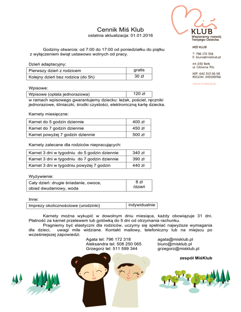 Cennik Miś Klub ostatnia aktualizacja: 01.01.2016 Godziny otwarcia: od 7:00 do 17:00 od poniedziałku do piątku z wyłączeniem świąt ustawowo wolnych od pracy. Dzień adaptacyjny: Pierwszy dzień z rodzicem gratis Kolejny dzień bez rodzica (do 5h) 30 zł Wpisowe: 120 zł Wpisowe (opłata jednorazowa) w ramach wpisowego gwarantujemy dziecku: leżak, pościel, ręczniki jednorazowe, śliniaczki, środki czystości, elektroniczną kartę dziecka. Karnety miesięczne: Karnet do 5 godzin dziennie 400 zł Karnet do 7 godzin dziennie 450 zł Karnet powyżej 7 godzin dziennie 500 zł Karnety zalecane dla rodziców niepracujących: Karnet 3 dni w tygodniu do 5 godzin dziennie 340 zł Karnet 3 dni w tygodniu do 7 godzin dziennie 390 zł Karnet 3 dni w tygodniu powyżej 7 godzin 440 zł Wyżywienie: Cały dzień: drugie śniadanie, owoce, obiad dwudaniowy, woda 8 zł /dzień Inne: Imprezy okolicznościowe (urodzinki) indywidualnie Karnety można wykupić w dowolnym dniu miesiąca, każdy obowiązuje 31 dni. Płatność za karnet przelewem lub gotówką do 5 dni od otrzymania rachunku. Pragniemy być elastyczni dla rodziców, uczymy się spełniać najwyższe wymagania dla dzieci, uwagi mile widziane. Kontakt mailowy, telefoniczny lub na miejscu po wcześniejszej zapowiedzi. Agata tel: 796 172 318 [email protected] Aleksandra tel: 508 250 065 [email protected] Grzegorz tel: 511 599 344 [email protected] zespół MiśKlub