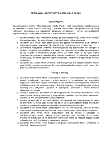 REGULAMIN UCZESTNICTWA SSM WISŁA PŁOCK Zasady Ogólne Stowarzyszenie Sportu Młodzieżowego Wisła Płock jest organizacją współpracującą w zakresie szkolenia dzieci i młodzieży z Klubem Wisła Płock. Wszystkie ustalone niżej standardy obowiązują na wszystkich zajęciach (wyjazdach i innych aktywnościach) organizowanych przez SSM Wisła Płock przy współpracy z Klubem. 1. Każdy zawodnik SSM Wisła Płock należy do społeczności Klubu Wisła Płock, dlatego też powinien się z nim identyfikować oraz dbać o jego dobry wizerunek. 2. Zawodnik SSM Wisła Płock zobowiązany jest godnie reprezentować Klub, zarówno podczas treningów i zawodów, jak również poza boiskiem w życiu codziennym. 3. Zachowanie wszystkich powinno charakteryzować się szacunkiem do kolegów z drużyny, trenerów, pracowników oraz osób nas otaczających a także świadomością, że gra w piłkę w strukturach takiego Klubu jak Wisła Płock, to nie tylko wielka przygoda nacechowana świadomością zdrowej rywalizacji i możliwością rozwijania swoich pasji, ale także ogromna odpowiedzialność i możliwość niebywałego rozwoju osobistego. 4. Zawodnik SSM Wisła Płock powinien charakteryzować się poszanowaniem innych zawodników, zarówno we własnej drużynie jak i przeciwnika, przestrzegać zasady fair play oraz dobrego wychowania. Trening + Zawody 5. Zawodnik SSM Wisła Płock zobowiązany jest do systematycznego podnoszenia swoich umiejętności sportowych, a tym samym do uczestnictwa we wszystkich zajęciach i zawodach ujętych w rocznym planie szkolenia Stowarzyszenia. Powinien charakteryzować się punktualnością, zdyscyplinowaniem, obowiązkowością, kulturą osobistą oraz aktywnym udziałem w treningach, zawodach i innych formach aktywności sportowej. 6. Udział w zajęciach i zawodach jest obowiązkowy dla wszystkich zawodników. Jeśli zawodnik nie może uczestniczyć w zajęciach lub zawodach lub tez spóźni się na nie, informuje o tym swego trenera z wyprzedzeniem. 7. Trening zaczyna się już w szatni, dlatego też zawodnik jest przygotowany do zajęć na minimum 10 minut (jeśli inaczej nie zaleci trener prowadzący) przed treningiem przebrany, gotowy do wysłuchania zadań i poleceń dotyczących zajęć. 8. Zawodnik SSM Wisła Płock zobowiązany jest do wykonywania poleceń trenera dotyczących sposobu realizacji ćwiczeń oraz przestrzegania zasad ich wykonywania. 9. Zawodnik SSM Wisła Płock zobowiązany jest do dbania o porządek w pomieszczeniach szatni, własny sprzęt sportowy oraz przybory i przyrządy treningowe znajdujące się na obiektach sportowych, które po każdych zajęciach jest zobowiązany zwrócić zgodnie z zaleceniami trenera. 10. Zawodnik SSM Wisła Płock przebywa na płycie boiska/orlika tylko i wyłącznie w obecności trenera/asystenta. 1 11. Zawodnik SSM Wisła Płock zobowiązuje się do posiadania niezbędnego, odpowiedniego sprzętu treningowego oraz reprezentacyjnego zatwierdzonego przez władze Stowarzyszenia. 12. Każdy zawodnik powołany na zawody sportowe pojawia się ubrany w sprzęt reprezentacyjny. 13. Zawodnik SSM Wisła Płock ma kategoryczny zakaz trenowania i grania w innym klubie piłkarskim. Wszelka aktywność sportowa/Kadry Polski, Kadry MZPN, zawody szkolne, zajęcia sportowe pozalekcyjne, obozy sportowe/powinna być konsultowana z trenerem prowadzącym, jak również z zachowaniem punktu 6. 14. Każdy z zawodników dba o higienę osobistą. W tym celu do każdych zajęć ma odpowiednio przygotowany sprzęt treningowy, a po każdym treningu i zawodach (jeżeli warunki pozwolą) bierze prysznic. Zawodnik dba o swoje zdrowie, przestrzega zaleceń odnośnie zasad odżywiania oraz regularnie uczestniczy w ustalonych badaniach, testach. 15. Zawodnik SSM Wisła Płock przed zawodami wita się z zawodnikami oraz trenerami przeciwnej drużyny, po zakończonych zawodach dziękuje za sportową rywalizację a także w widoczny sposób pozdrawia rodziców, kibiców i pozostałych gości. 16. Zawodnik SSM Wisła Płock na koniec każdej rundy podlega ocenie, zarówno pod względem postępów szkolenia, aktualnych predyspozycji sportowych, a także zachowania i dbania o dobre imię Stowarzyszenia. Na podstawie tej oceny trenerzy Stowarzyszenia mogą podjąć decyzję o czasowym lub definitywnym zakończeniu współpracy z zawodnikiem oraz jego rodzicami (opiekunami). Szkoła 17. Zawodnik SSM Wisła Płock powinien uzyskiwać jak najlepsze wyniki w nauce ze wszystkich przedmiotów, a także z zachowania. W przypadku uzyskiwania przez danego zawodnika słabych wyników w nauce lub braku promocji do następnej klasy koordynator w porozumieniu z trenerem może podjąć decyzję o czasowym zawieszeniu zawodnika w zajęciach sportowych aż do momentu poprawienia ocen szkolnych (w wyjątkowych sytuacjach może dojść do zakończenia współpracy). 18. Na poziomie gimnazjum i liceum rodzice zawodników nie uczęszczających do szkół ściśle współpracujących z Klubem (klasy sportowe o profilu piłka nożna) oraz rodzice/opiekunowie zawodników uczęszczających do szkół podstawowych dostarczają trenerowi na koniec każdego półrocza wypełniony formularz z ocenami szkolnymi lub ksero świadectwa szkolnego. Trenerzy 19. Trener jest osobą odpowiedzialną za koordynację działań całego zespołu, jak również za jego prawidłowe funkcjonowanie na boisku oraz poza nim. 20. Działania i obowiązki trenera dotyczące funkcjonowania zespołów w SSM Wisła Płock zawarte są w odrębnych załącznikach do umowy zlecenia (prowadzenia zajęć danego rocznika). 2 Rodzice 21. Rodzice (opiekunowie, członkowie rodzin) zawodników SSM Wisła Płock podczas meczów (zawodów) pełnią rolę kibiców (obserwatorów) i przebywają w wyznaczonych miejscach (trybuny obiektu sportowego), zaś podczas treningów – poza terenem prowadzenia zajęć sportowych. W wyjątkowych sytuacjach, za zgodą trenera, mogą przebywać na trybunach obi