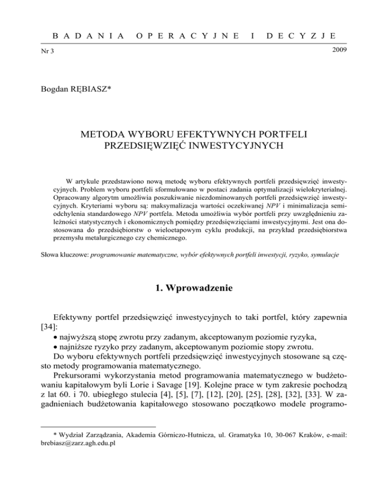 B A D A N I A O P E R A C Y J N E I D E C Y Z J E 2009 Nr 3 Bogdan RĘBIASZ* METODA WYBORU EFEKTYWNYCH PORTFELI PRZEDSIĘWZIĘĆ INWESTYCYJNYCH W artykule przedstawiono nową metodę wyboru efektywnych portfeli przedsięwzięć inwestycyjnych. Problem wyboru portfeli sformułowano w postaci zadania optymalizacji wielokryterialnej. Opracowany algorytm umożliwia poszukiwanie niezdominowanych portfeli przedsięwzięć inwestycyjnych. Kryteriami wyboru są: maksymalizacja wartości oczekiwanej NPV i minimalizacja semiodchylenia standardowego NPV portfela. Metoda umożliwia wybór portfeli przy uwzględnieniu zależności statystycznych i ekonomicznych pomiędzy przedsięwzięciami inwestycyjnymi. Jest ona dostosowana do przedsiębiorstw o wieloetapowym cyklu produkcji, na przykład przedsiębiorstwa przemysłu metalurgicznego czy chemicznego. Słowa kluczowe: programowanie matematyczne, wybór efektywnych portfeli inwestycji, ryzyko, symulacje 1. Wprowadzenie Efektywny portfel przedsięwzięć inwestycyjnych to taki portfel, który zapewnia [34]: • najwyższą stopę zwrotu przy zadanym, akceptowanym poziomie ryzyka, • najniższe ryzyko przy zadanym, akceptowanym poziomie stopy zwrotu. Do wyboru efektywnych portfeli przedsięwzięć inwestycyjnych stosowane są często metody programowania matematycznego. Prekursorami wykorzystania metod programowania matematycznego w budżetowaniu kapitałowym byli Lorie i Savage [19]. Kolejne prace w tym zakresie pochodzą z lat 60. i 70. ubiegłego stulecia [4], [5], [7], [12], [20], [25], [28], [32], [33]. W zagadnieniach budżetowania kapitałowego stosowano początkowo modele programo- * Wydział Zarządzania, Akademia Górniczo-Hutnicza, ul. Gramatyka 10, 30-067 Kraków, e-mail: [email protected] 96 B. RĘBIASZ wania liniowego [7], modele liniowe ze zmiennymi binarnymi [33] czy też modele programowania wielokryterialnego [5], [12]. Koncepcje modeli z lat 60. i 70. zostały rozwinięte i wzbogacone w kolejnych latach przez wielu autorów: [1]–[3], [8], [9], [16]–[18], [21], [24], [26], [29], [30], [34]. Näslund [25] jako pierwszy przedstawił propozycję uwzględnienia ryzyka w modelu matematycznym, opracowanym dla wyboru portfela przedsięwzięć inwestycyjnych. Markowitz opracował metodę budowy efektywnego portfela inwestycji finansowych. Seitz [30] przyjął idee Markowitza do konstrukcji efektywnego portfela przedsięwzięć inwestycyjnych. Model Seitza uwzględnia niepewność przepływów pieniężnych generowanych przez przedsięwzięcie inwestycyjne i statystyczną zależność przedsięwzięć inwestycyjnych. Nie uwzględnia natomiast zależności ekonomicznej przedsięwzięć. Z koncepcji Seitza korzystała w swej pracy Wilimowska [34]. Tutaj także przedsięwzięcia traktowane są jako niezależne ekonomicznie. O zależności statystycznej przedsięwzięć inwestycyjnych mówimy wówczas, gdy istnieje korelacja w czasie pomiędzy korzyściami generowanymi przez te przedsięwzięcia [6], [36]. Zależności ekonomiczne wskazują, w jaki sposób dane przedsięwzięcie inwestycyjne wpływa na korzyści generowane przez inne przedsięwzięcie lub na korzyści uzyskiwane z dotychczasowej działalności firmy. Przedsięwzięcia mogą więc być ekonomicznie niezależne (gdy wpływ taki nie istnieje) albo ekonomicznie zależne (gdy wpływ taki istnieje) [6], [36]. W przypadku zależności ekonomicznej dodatniej korzyści generowane przez jedno przedsięwzięcie inwestycyjne prowadzą do wzrostu korzyści generowanych przez inne przedsięwzięcie. Mówimy wówczas o przedsięwzięciach komplementarnych [6]. Najwyższy stopień zależności ekonomicznej dodatniej występuje wówczas, gdy korzyści z jednego przedsięwzięcia zależą od uzyskania korzyści z innego przedsięwzięcia. Mówimy wówczas o przedsięwzięciach uwarunkowanych [6]. Zależność ekonomiczna ujemna występuje wówczas, gdy korzyści generowane przez jedno przedsięwzięcie inwestycyjne maleją na skutek realizacji innego przedsięwzięcia. Mówimy wówczas o przedsięwzięciach substytucyjnych [6]. Zależność ekonomiczna ujemna osiąga najwyższy stopień, gdy realizacja jednego przedsięwzięcia oznacza konieczność rezygnacji z realizacji innego przedsięwzięcia. Mówimy wówczas o przedsięwzięciach inwestycyjnych wzajemnie się wykluczających [6]. Cytowane powyżej prace uwzględniają co najwyżej jeden rodzaj zależności ekonomicznej – to jest wzajemne wykluczanie się przedsięwzięć. W literaturze prezentowane są również modele uwzględniające pozostałe rodzaje zależności. Dickinson i inni [10] przedstawiają metodę optymalnego harmonogramowania przedsięwzięć inwestycyjnych, która uwzględnia, że poszczególne przedsięwzięcia mogą być względem siebie substytucyjne lub komplementarne. Do wyboru przedsięwzięć autorzy stosują metody programowania nieliniowego. Santhanam i Kyparisis [27] przedstawiają model matematyczny, wykorzystywany do wyboru portfela spośród zbioru za- Metoda wyboru efektywnych portfeli przedsięwzięć inwestycyjnych 97 leżnych ekonomicznie przedsięwzięć inwestycyjnych związanych z rozwojem systemów informatycznych. Do wyboru przedsięwzięć używa się metod programowania binarnego. Zuluaga i inni [36] przedstawiają model, który umożliwia wybór i harmonogramowanie zależnych ekonomicznie przedsięwzięć inwestycyjnych. Modele Dickinsona, Santhanama i Kyparisisa oraz Zuluagi nie uwzględniają niepewności przepływów pieniężnych generowanych przez przedsięwzięcia inwestycyjne oraz zależności statystycznych pomiędzy przedsięwzięciami. Medaglia i inni [23] proponują wykorzystanie algorytmów ewolucyjnych do selekcji zależnych ekonomicznie i statystycznie przedsięwzięć inwestycyjnych. Przedmiotem rozważań w niniejszym artykule jest wybór efektywnych portfeli przedsięwzięć inwestycyjnych. Problem wyboru portfeli rozważa się w warunkach racjonowania kapitału (ustalany jest