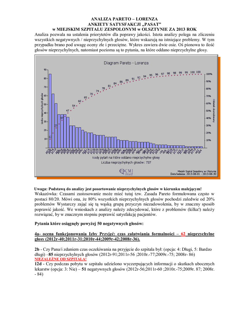 ANALIZA PARETO – LORENZA ANKIETY SATYSFAKCJI „PASAT” w MIEJSKIM SZPITALU ZESPOLONYM w OLSZTYNIE ZA 2013 ROK Analiza pozwala na ustalenia priorytetów dla poprawy jakości. Istota analizy polega na zliczeniu wszystkich negatywnych / nieprzychylnych głosów, które wskazują na istniejące problemy. W tym przypadku brano pod uwagę oceny złe i przeciętne. Wykres zawiera dwie osie. Oś pionowa to ilość głosów nieprzychylnych, natomiast pozioma są to pytania, na które oddano nieprzychylne głosy. Uwaga: Podstawą do analizy jest posortowanie nieprzychylnych głosów w kierunku malejącym! Wskazówka: Czasami zastosowanie może mieć tutaj tzw. Zasada Pareto formułowana często w postaci 80/20. Mówi ona, że 80% wszystkich nieprzychylnych głosów pochodzi zaledwie od 20% problemów Wystarczy zająć się tą wąską grupą przyczyn niezadowolenia, by w znaczny sposób poprawić jakość. We wnioskach z analizy należy zdecydować, które z problemów (kilka!) należy rozwiązać, by w znacznym stopniu poprawić satysfakcję pacjentów. Pytania które osiągnęły powyżej 50 negatywnych głosów: 4a- ocena funkcjonowania Izby Przyjęć: czas załatwiania formalności – 62 nieprzychylne głosy (2012r-40;2011r-31;2010r-44;2009r-42;2008r-36). 2b - Czy Pana/i zdaniem czas oczekiwania na przyjęcie do szpitala był: (opcja: 4: Długi, 5: Bardzo długi) –85 nieprzychylnych głosów (2012r-91;2011r-56 ;2010r.-77;2009r.-75; 2008r- 86) NIEZALEŻNE OD SZPITALA! 12d - Czy podczas pobytu w szpitalu udzielono wyczerpujących informacji o skutkach ubocznych lekarstw (opcja: 3: Nie) – 51 negatywnych głosów (2012r-56;2011r-60 ;2010r.-75;2009r. 87; 2008r. - 84) 120 4a 2b 12d 5a 5e 5b 9 100 80 60 40 20 0 2008r. 2009r. 2010r. 2011r 2012r 2013r Wykonał: Krzysztof Marcinkiewicz Olsztyn, dnia 06.08.2013 rok WNIOSKI: Dużym zaskoczeniem jest pojawienie się na pierwszym miejscu analizy Pareto-Lorenza z liczbą 62 negatywnych odpowiedzi: ocena czasu załatwiania formalności na izbie przyjęć. W poprzednich badaniach negatywnych odpowiedzi było w granicach 30, w związku z czym nie była brana pod uwagę w analizach..100% wzrost ocen negatywnych wskazuje na fakt istnienia problemu przy realizacji procedury przyjęcia pacjenta do szpitala. Założono kartę działań zapobiegawczych. Pozostałe pytania dotyczące: 1. udzieleniu informacji o skutkach ubocznych lekarstw (12d) 2. oraz terminie oczekiwania na przyjęcia do szpitala (2b) – niezależne od szpitala negatywne odpowiedzi mają tendencję malejącą. Wskaźnik zwrotności ankiet „Pasat” : 2013r– 59% 2012r – 73% 2011r – 54,5% 2010r – 71,4% 2009r – 75,1% 2008r – 89,1% 2007r – 90% 2006r – 97,1% W związku ze znacznym spadkiem zwrotności ankiet założono kartę działań zapobiegawczych.