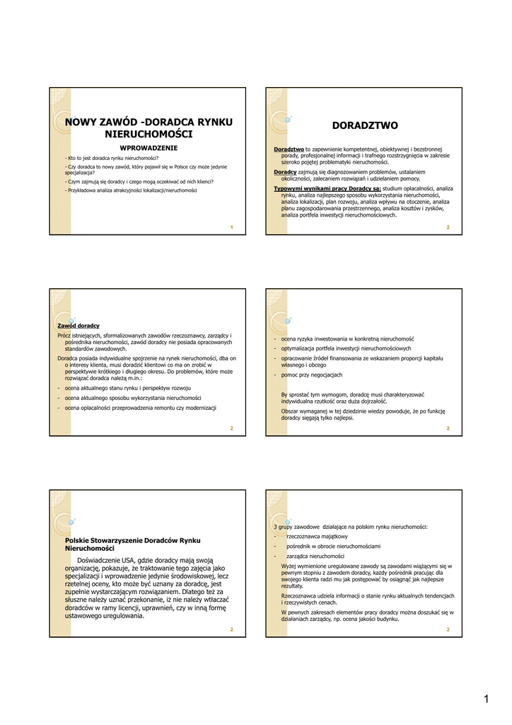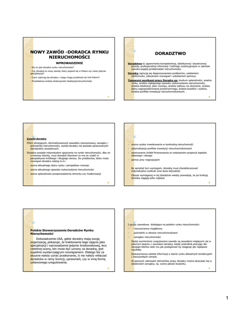 NOWY ZAWÓD -DORADCA RYNKU NIERUCHOMOŚCI WPROWADZENIE DORADZTWO Doradztwo to zapewnienie kompetentnej, obiektywnej i bezstronnej porady, profesjonalnej informacji i trafnego rozstrzygnięcia w zakresie szeroko pojętej problematyki nieruchomości. - Kto to jest doradca rynku nieruchomości? - Czy doradca to nowy zawód, który pojawił się w Polsce czy moŜe jedynie specjalizacja? Doradcy zajmują się diagnozowaniem problemów, ustalaniem okoliczności, zalecaniem rozwiązań i udzielaniem pomocy. - Czym zajmują się doradcy i czego mogą oczekiwać od nich klienci? Typowymi wynikami pracy Doradcy są: studium opłacalności, analiza rynku, analiza najlepszego sposobu wykorzystania nieruchomości, analiza lokalizacji, plan rozwoju, analiza wpływu na otoczenie, analiza planu zagospodarowania przestrzennego, analiza kosztów i zysków, analiza portfela inwestycji nieruchomościowych. - Przykładowa analiza atrakcyjności lokalizacji/nieruchomości 1 2 Zawód doradcy Prócz istniejących, sformalizowanych zawodów rzeczoznawcy, zarządcy i pośrednika nieruchomości, zawód doradcy nie posiada opracowanych standardów zawodowych. Doradca posiada indywidualne spojrzenie na rynek nieruchomości, dba on o interesy klienta, musi doradzić klientowi co ma on zrobić w perspektywie krótkiego i długiego okresu. Do problemów, które moŜe rozwiązać doradca naleŜą m.in.: - ocena ryzyka inwestowania w konkretną nieruchomość - optymalizacja portfela inwestycji nieruchomościowych - opracowanie źródeł finansowania ze wskazaniem proporcji kapitału własnego i obcego - pomoc przy negocjacjach - ocena aktualnego stanu rynku i perspektyw rozwoju By sprostać tym wymogom, doradcę musi charakteryzować indywidualna rzutkość oraz duŜa dojrzałość. - ocena aktualnego sposobu wykorzystania nieruchomości - ocena opłacalności przeprowadzenia remontu czy modernizacji Obszar wymaganej w tej dziedzinie wiedzy powoduje, Ŝe po funkcję doradcy sięgają tylko najlepsi. 2 2 3 grupy zawodowe działające na polskim rynku nieruchomości: Polskie Stowarzyszenie Doradców Rynku Nieruchomości - rzeczoznawca majątkowy - pośrednik w obrocie nieruchomościami - Doświadczenie USA, gdzie doradcy mają swoją organizację, pokazuje, Ŝe traktowanie tego zajęcia jako specjalizacji i wprowadzenie jedynie środowiskowej, lecz rzetelnej oceny, kto moŜe być uznany za doradcę, jest zupełnie wystarczającym rozwiązaniem. Dlatego teŜ za słuszne naleŜy uznać przekonanie, iŜ nie naleŜy wtłaczać doradców w ramy licencji, uprawnień, czy w inną formę ustawowego uregulowania. zarządca nieruchomości WyŜej wymienione uregulowane zawody są zawodami wiąŜącymi się w pewnym stopniu z zawodem doradcy, kaŜdy pośrednik pracując dla swojego klienta radzi mu jak postępować by osiągnąć jak najlepsze rezultaty. Rzeczoznawca udziela informacji o stanie rynku aktualnych tendencjach i rzeczywistych cenach. W pewnych zakresach elementów pracy doradcy moŜna doszukać się w działaniach zarządcy, np. ocena jakości budynku. 2 2 1 ZARZĄDCA DORADCA POŚREDNIK RZECZOZNAWCA Doradcy nieruchomościowi są uczestnikami procesu decyzyjnego w formie wspomagającej, nie angaŜując się w bezpośrednią realizację usług takich jak pośrednictwo, rzeczoznawstwo czy zarządzanie. Ich głównym celem i zadaniem jest wspomaganie decydentów w procesach decyzyjnych. Zasady postępowania Doradcy Rynku Nieruchomości Zasady postępowania Doradcy Rynku Nieruchomości 1) Informacja – Upewnienie się czy doradca posiada wystarczającą ilości informacji. Nie naleŜy polegać wyłącznie na informacji dostarczanych przez właściciela, naleŜy samemu „wyjść w teren”, zdobyć potrzebne dane. Wiedza da władze a to w zawodzie doradcy daje poczucie bezpieczeństwa. 2) Logika – Proces logicznego myślenia opisany w jasny sposób zaoszczędzić ma wielu pomyłek. NaleŜy pokazać go klientowi a wówczas on zawierzy doradcy. 3) Gospodarność – Praca nad własnym czasem i czasem klienta. Korzystanie z drogich i czasochłonnych przykładów i analiz tylko wówczas gdy jest to konieczne. 4) Dokładność – NaleŜy rozpatrzyć wszystkie istotne okoliczności, uwaŜać na niebezpieczeństwa branŜy oraz wyciągać wnioski. (2) 5) Organizacja – Rozplanowanie pracy swojej i swoich współpracowników co ograniczy straty i poprawi wiarygodność doskonaląc swój profesjonalizm. 6) Odpowiedzialność – Pamięć o tym dla kogo pracujemy, traktowanie kaŜdego klienta z osobna powaŜnie, wówczas i my będziemy traktowani powaŜnie. 7) Przepływ informacji – KaŜdy klient ceni bieŜącą informację. NaleŜy skrupulatnie sporządzać notatki, mówić i słuchać a takŜe utrzymywać kontakt z pracownikami i kolegami z branŜy. Zasady postępowania Doradcy Rynku Nieruchomości (3) 8) Planowanie czasu – Czas to istotna rola w tym zawodzie, materiały na spotkania powinny być zawsze wcześniej przygotowane. NaleŜy przewidzieć co kiedy będzie potrzebne aby mieć wszystko pod ręka. 9) Obiektywizm – bez tej cechy charakteru nie będzie się dobrym doradcą. 10) Sceptyzm – Pozory mogą mylić. W błąd mogą wprowadzić nie tylko błędne źródła informacji ale i klient. 11) Rozeznanie – doradca musi na bieŜąco wiedzieć co dzieje się w regionie czy kraju w swojej branŜy. Musi zaznajomić się z najnowszymi mechanizmami i tendencjami rynku. Zakres podstawowej wiedzy - obszary CHARAKTERYSTYKA FIZYCZNA NIERUCHOMOŚCI UWARUNKOWANIA PRAWNO – INSTYTUCJONALNE SPECYFIKA RYNKÓW NIERUCHOMOŚCI UWARUNKOWANIA EKONOMICZNO – PRZESTRZENNE 2 CHARAKTERYSTYKA FIZYCZNA NIERUCHOMOŚ NIERUCHOMO ŚCI UWARUNKOWANIA PRAWNO – INSTYTUCJONALNE Nieruchomość jest towarem rynkowym a więc musi być zidentyfikowana i opisana jako zjawisko fizyczne. Atrybuty fizyczne nieruchomości dotyczą działek i obiektów oraz ich połoŜenia geograficznego. Wymagana jest tu wiedza o gruntach i budynkach, o geodezyjnym opisie