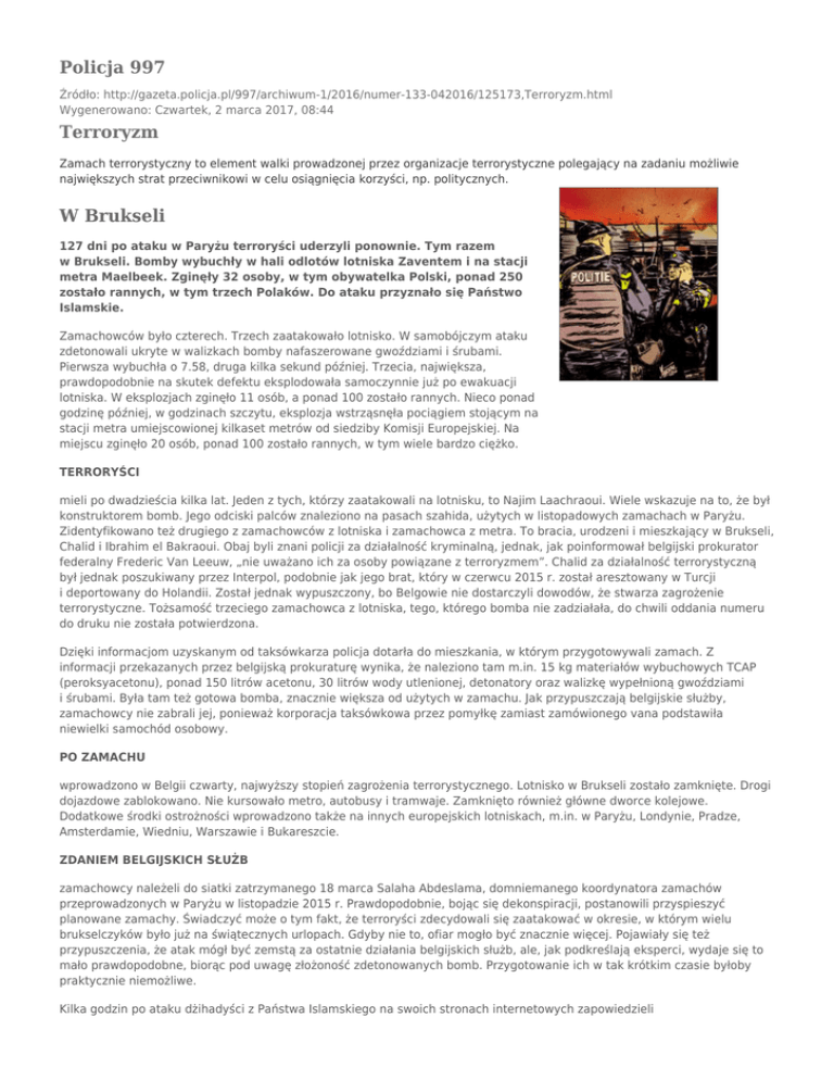 Policja 997 Źródło: http://gazeta.policja.pl/997/archiwum-1/2016/numer-133-042016/125173,Terroryzm.html Wygenerowano: Czwartek, 2 marca 2017, 08:44 Terroryzm Zamach terrorystyczny to element walki prowadzonej przez organizacje terrorystyczne polegający na zadaniu możliwie największych strat przeciwnikowi w celu osiągnięcia korzyści, np. politycznych. W Brukseli 127 dni po ataku w Paryżu terroryści uderzyli ponownie. Tym razem w Brukseli. Bomby wybuchły w hali odlotów lotniska Zaventem i na stacji metra Maelbeek. Zginęły 32 osoby, w tym obywatelka Polski, ponad 250 zostało rannych, w tym trzech Polaków. Do ataku przyznało się Państwo Islamskie. Zamachowców było czterech. Trzech zaatakowało lotnisko. W samobójczym ataku zdetonowali ukryte w walizkach bomby nafaszerowane gwoździami i śrubami. Pierwsza wybuchła o 7.58, druga kilka sekund później. Trzecia, największa, prawdopodobnie na skutek defektu eksplodowała samoczynnie już po ewakuacji lotniska. W eksplozjach zginęło 11 osób, a ponad 100 zostało rannych. Nieco ponad godzinę później, w godzinach szczytu, eksplozja wstrząsnęła pociągiem stojącym na stacji metra umiejscowionej kilkaset metrów od siedziby Komisji Europejskiej. Na miejscu zginęło 20 osób, ponad 100 zostało rannych, w tym wiele bardzo ciężko. TERRORYŚCI mieli po dwadzieścia kilka lat. Jeden z tych, którzy zaatakowali na lotnisku, to Najim Laachraoui. Wiele wskazuje na to, że był konstruktorem bomb. Jego odciski palców znaleziono na pasach szahida, użytych w listopadowych zamachach w Paryżu. Zidentyfikowano też drugiego z zamachowców z lotniska i zamachowca z metra. To bracia, urodzeni i mieszkający w Brukseli, Chalid i Ibrahim el Bakraoui. Obaj byli znani policji za działalność kryminalną, jednak, jak poinformował belgijski prokurator federalny Frederic Van Leeuw, „nie uważano ich za osoby powiązane z terroryzmem”. Chalid za działalność terrorystyczną był jednak poszukiwany przez Interpol, podobnie jak jego brat, który w czerwcu 2015 r. został aresztowany w Turcji i deportowany do Holandii. Został jednak wypuszczony, bo Belgowie nie dostarczyli dowodów, że stwarza zagrożenie terrorystyczne. Tożsamość trzeciego zamachowca z lotniska, tego, którego bomba nie zadziałała, do chwili oddania numeru do druku nie została potwierdzona. Dzięki informacjom uzyskanym od taksówkarza policja dotarła do mieszkania, w którym przygotowywali zamach. Z informacji przekazanych przez belgijską prokuraturę wynika, że naleziono tam m.in. 15 kg materiałów wybuchowych TCAP (peroksyacetonu), ponad 150 litrów acetonu, 30 litrów wody utlenionej, detonatory oraz walizkę wypełnioną gwoździami i śrubami. Była tam też gotowa bomba, znacznie większa od użytych w zamachu. Jak przypuszczają belgijskie służby, zamachowcy nie zabrali jej, ponieważ korporacja taksówkowa przez pomyłkę zamiast zamówionego vana podstawiła niewielki samochód osobowy. PO ZAMACHU wprowadzono w Belgii czwarty, najwyższy stopień zagrożenia terrorystycznego. Lotnisko w Brukseli zostało zamknięte. Drogi dojazdowe zablokowano. Nie kursowało metro, autobusy i tramwaje. Zamknięto również główne dworce kolejowe. Dodatkowe środki ostrożności wprowadzono także na innych europejskich lotniskach, m.in. w Paryżu, Londynie, Pradze, Amsterdamie, Wiedniu, Warszawie i Bukareszcie. ZDANIEM BELGIJSKICH SŁUŻB zamachowcy należeli do siatki zatrzymanego 18 marca Salaha Abdeslama, domniemanego koordynatora zamachów przeprowadzonych w Paryżu w listopadzie 2015 r. Prawdopodobnie, bojąc się dekonspiracji, postanowili przyspieszyć planowane zamachy. Świadczyć może o tym fakt, że terroryści zdecydowali się zaatakować w okresie, w którym wielu brukselczyków było już na świątecznych urlopach. Gdyby nie to, ofiar mogło być znacznie więcej. Pojawiały się też przypuszczenia, że atak mógł być zemstą za ostatnie działania belgijskich służb, ale, jak podkreślają eksperci, wydaje się to mało prawdopodobne, biorąc pod uwagę złożoność zdetonowanych bomb. Przygotowanie ich w tak krótkim czasie byłoby praktycznie niemożliwe. Kilka godzin po ataku dżihadyści z Państwa Islamskiego na swoich stronach internetowych zapowiedzieli KOLEJNE ZAMACHY „To, co nadchodzi, będzie jeszcze gorsze” napisali w swoim oświadczeniu. Z kolei z informacji, do których dotarła amerykańska agencja prasowa Associated Press, wynika, że Państwo Islamskie przeszkoliło i wysłało do Europy od 400 do 600 dżihadystów. Ich jedynym zadaniem jest przeprowadzenie ataków terrorystycznych. Także CNN, powołując się na źródła w amerykańskich służbach, poinformowała, że wiedzą one o wielu innych zamachach terrorystycznych szykowanych w Europie. KLAUDIUSZ KRYCZKA rys. Piotr Maciejczak – Nie żyjemy w próżni. Jesteśmy członkiem Unii Europejskiej i dzisiaj, w zglobalizowanym świecie, jest tak, że wszelkie zjawiska – i te związane z nowoczesnością, postępem cywilizacyjnym, ale również te negatywne – wcześniej czy później do nas dotrą, tak będzie również z terroryzmem. Im więcej zyskamy wiedzy, doświadczenia z nieszczęścia innych, tym lepiej będziemy mogli się przygotować na to negatywne zjawisko. Krzysztof Liedel, dyrektor Centrum Badań nad Terroryzmem Collegium Civitas, (wypowiedź dla PAP) Oblicza zamachu Zamach terrorystyczny to element walki prowadzonej przez organizacje terrorystyczne polegający na zadaniu możliwie największych strat przeciwnikowi w celu osiągnięcia korzyści, np. politycznych. Najczęściej kojarzy się z wybuchem bomby, ale doświadczenia ostatnich lat pokazują, że sposobów przeprowadzenia zamachów jest znacznie więcej. To, w jaki sposób zamach jest przeprowadzany, zależy od wielu czynników. Najważniejsze z nich to możliwości organizacyjne, a więc to, do jakich środków zamachowcy mają dostęp, jakie narzędzia mogą kupić i jakie m