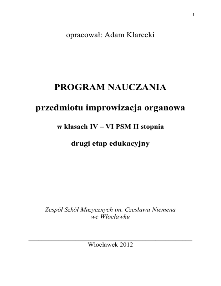 1 opracował: Adam Klarecki PROGRAM NAUCZANIA przedmiotu improwizacja organowa w klasach IV – VI PSM II stopnia drugi etap edukacyjny Zespół Szkół Muzycznych im. Czesława Niemena we Włocławku _________________________________________________ Włocławek 2012 2 Wstęp. Program nauczania (II etap edukacyjny) przedmiotu improwizacja organowa, przeznaczony do realizacji w Zespole Szkół Muzycznych im. Czesława Niemena we Włocławku, został stworzony zgodnie z: Rozporządzeniem Ministra Kultury i Dziedzictwa Narodowego z dnia 9 grudnia 2010 r. w sprawie podstaw programowych kształcenia w zawodach szkolnictwa artystycznego w publicznych szkołach artystycznych, oraz: rozporządzeniem Ministra Kultury i Dziedzictwa Narodowego z dnia 25 lutego 2011 r. w sprawie dopuszczania do uŜytku w szkołach artystycznych programów nauczania oraz dopuszczania do uŜytku szkolnego podręczników dla szkół artystycznych. 3 spis treści I. Cele, treści nauczania i zakładane umiejętności absolwentów A. Cele nauczania ........................................................................... 4 B. Treści nauczania ........................................................................ 4 C. Zakładane umiejętności absolwentów ....................................... 5 II. Materiał nauczania ......................................................................... 6 A. Treści i procedury osiągania szczegółowych celów edukacyjnych ............................................................................. 6 B. Realizacja materiału nauczania.................................................. 8 1. 2. 3. 4. 5. Ćwiczenia techniczne. Analiza utworów................................ 8 Improwizacja homofoniczna................................................. 10 Improwizacja polifoniczna.................................................... 11 Realizacja basso continuo ..................................................... 11 Ćwiczenia kompozytorskie ................................................... 12 III. Program egzaminu końcowego ................................................... 13 IV. Zamierzone efekty…………………..……………………….13 V. Ocena pracy ucznia ....................................................................... 15 A. Kryteria oceniania.................................................................... 15 B. Wymagania edukacyjne........................................................... 16 VI. Literatura przedmiotu ................................................................. 18 VII. Komentarz do realizacji programu…………………..……18 4 I. Cele i treści nauczania A. Cele nauczania poznawcze - poznanie zasad budowy róŜnych form muzycznych - zapoznanie ze skalami - poznanie podstawowych zasad gry liturgicznej kształcące - opanowanie i utrwalenie środków wykonawczych niezbędnych w improwizacji - doskonalenie umiejętności swobodnego poruszania się w róŜnych tonacjach, stylach i formach muzycznych - kształtowanie umiejętności wykorzystania elementów improwizacji organowej w grze liturgicznej - doskonalenie umiejętności swobodnego traktowania tematu pod względem jego opracowania harmonicznego, stylowego, komponowania przygrywki (przy opracowywaniu pieśni liturgicznych) - pobudzanie wyobraźni i inwencji muzycznej, wdraŜanie do stosowania własnych oryginalnych i poprawnych muzycznie rozwiązań - rozwijanie pamięci muzycznej wychowawcze - rozwijanie samodzielności, systematyczności, wyobraźni twórczej - pobudzanie kreatywności w zakresie tworzenia i opracowywania tematów muzycznych - wdraŜanie do permanentnego doskonalenia i rozwijania własnego warsztatu improwizatorskiego i kompozytorskiego B. Treści nauczania 1. Elementy improwizacji: motyw, struktura, faktura, forma, harmonika, rytmika, barwa, styl. Analiza utworów 2. Improwizacja homofoniczna. 3. Improwizacja polifoniczna. 4. Realizacja basso continuo. 5. Ćwiczenia kompozytorskie. 5 C. Zakładane umiejętności absolwentów 1. Umiejętność łączenia akordów w kadencjach, progresjach niemodulujących i modulujących oraz strukturach melodyczno-harmonicznych z uwzględnieniem: motywiki, formy, harmonii, rytmiki, róŜnych rejestrów. Umiejętność transponowania róŜnego rodzaju struktur melodycznych jednogłosowych i wielogłosowych. Umiejętność grania róŜnych pochodów gamowych w róŜnych odmianach skali dur i moll. Umiejętność analizy preludiów i toccat z róŜnych epok, fug J. S. Bacha, i utworów w bardziej swobodnej formie z okresów późniejszych. 2. Umiejętność improwizacji w układzie dwugłosowym, trzygłosowym i czterogłosowym akompaniamentu do podanej melodii – od realizacji głosu towarzyszącego do harmonizacji (prostymi akordami i figuracją), preludiów o róŜnym charakterze z zastosowaniem zwrotów figuracyjnych i ozdobników. Umiejętność improwizowania preludiów o róŜnym charakterze z zastosowaniem figuracji, snucia motywicznego, rozwijania motywu, zdobnictwa, kontrastu fakturalnego. Umiejętność improwizacji swobodnej fantazji. 3. Umiejętność improwizowania kilku głosów do podanej melodii w oparciu o zasady kontrapunktu. Umiejętność improwizacji inwencji dwugłosowej i krótkiej fugetty. 4. Umiejętność realizacji ćwiczeń z basem cyfrowanym. Umiejętność realizacji prostych zadań z basso continuo, opartych o materiał nutowy z epoki baroku (głos basowy umieszczony w pedale) z zachowaniem stylu epoki i z uŜyciem prostej i celowej figuracji. 5. Umiejętność tworzenia przygrywki chorałowej w oparciu o polskie pieśni kościelne. 6 II. Materiał nauczania A. Treści i procedury osiągania szczegółowych celów edukacyjnych Improwizacja jest sztuką, w której tworzenie i wykonywanie muzyki pokrywa się w czasie. Jest to więc podwójne, zorganizowane działanie. Wymaga ono nie tylko pewnych zdolności czy intuicji, ale ciągłej, systematycznej pracy nad opanowaniem strony warsztato