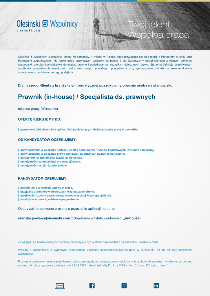Olesiński & Wspólnicy to aktualnie ponad 70 doradców, 4 miasta w Polsce, stale rozwijająca się sieć relacji z Partnerami w kraju oraz Partnerami zagranicznymi. Na rynku usług prawniczych działamy od ponad 9 lat. Świadczymy usługi klientom z różnych sektorów gospodarki, oferując kompleksowe doradztwo prawne i podatkowe we wszystkich dziedzinach prawa. Staranna definicja oczekiwanych rezultatów, poszukiwanie rozwiązań i wdrażanie nowych odważnych pomysłów a przy tym odpowiedzialność za rekomendowane rozwiązanie to podstawa naszego podejścia. Dla naszego Klienta z branży teleinformatycznej poszukujemy obecnie osoby na stanowisko: Prawnik (in-house) / Specjalista ds. prawnych miejsce pracy: Warszawa OFERTĘ KIERUJEMY DO: | prawników (absolwentów / aplikantów) posiadających doświadczenie pracy w zawodzie. OD KANDYDATÓW OCZEKUJEMY: | | | | | doświadczenia w obszarze kodeksu spółek handlowych / rynków kapitałowych (warunek konieczny), doświadczenia w obszarze prawa zamówień publicznych (warunek konieczny), bardzo dobrej znajomości języka angielskiego, umiejętności samodzielnej organizacji pracy, umiejętności ustalania priorytetów. KANDYDATOM OFERUJEMY: | | | | zatrudnienie w ramach umowy o pracę, przyjazną atmosferę w nowocześnie zarządzanej firmie, możliwość rozwoju zawodowego wśród wysokiej klasy specjalistów, należny szacunek i godziwe wynagrodzenie. Osoby zainteresowane prosimy o przesłanie aplikacji na adres: [email protected] z dopiskiem w tytule wiadomości „in-house”. Ze względu na bardzo dużą ilość aplikacji możemy nie być w stanie odpowiedzieć na wszystkie Państwa e-maile. Prosimy o zrozumienie. Z wybranymi Kandydatami będziemy komunikować się wstępnie w okresie ok. 14 dni od daty otrzymania wiadomości. Prosimy o dopisanie następującej klauzuli: „Wyrażam zgodę na przetwarzanie moich danych osobowych zawartych w ofercie dla potrzeb procesu rekrutacji zgodnie z ustawą z dnia 29.08.1997 r. (tekst jednolity Dz. U. z 2002 r. Nr 101, poz. 926 z późn. zm.)”