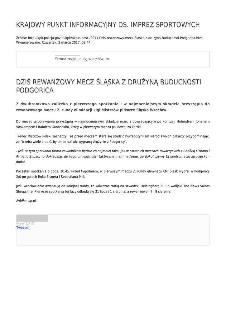 KRAJOWY PUNKT INFORMACYJNY DS. IMPREZ SPORTOWYCH Źródło: http://kpk.policja.gov.pl/kpk/aktualnosci/2011,Dzis-rewanzowy-mecz-Slaska-z-druzyna-Buducnosti-Podgorica.html Wygenerowano: Czwartek, 2 marca 2017, 08:44 Strona znajduje się w archiwum. DZIŚ REWANŻOWY MECZ ŚLĄSKA Z DRUŻYNĄ BUDUCNOSTI PODGORICA Z dwubramkową zaliczką z pierwszego spotkania i w najmocniejszym składzie przystąpią do rewanżowego meczu 2. rundy eliminacji Ligi Mistrzów piłkarze Śląska Wrocław. Do meczu wrocławianie przystąpią w najmocniejszym składzie m.in. z powracającym po kontuzji Holendrem Johanem Voskampem i Rafałem Grodzickim, który w pierwszym meczu pauzował za kartki. Trener Mistrzów Polski zaznaczył, że przed meczem stara się studzić hurraoptymizm wśród swoich piłkarzy przypominając, że "trzeba wiele zrobić, by uniemożliwić wygraną drużynie z Podgoricy". - Jeśli w tym spotkaniu forma zawodników będzie co najmniej taka, jak w ostatnich meczach towarzyskich z Benfiką Lizbona i Athletic Bilbao, to dokładając do tego umiejętności taktyczne mam nadzieję, że dokończymy tą konfrontację zwycięsko dodał. Początek spotkania o godz. 20.45. Przed tygodniem, w pierwszym meczu 2. rundy eliminacji LM, Śląsk wygrał w Podgoricy 2:0 po golach Roka Elsnera i Sebastiana Mili. Jeśli wrocławianie awansują do kolejnej rundy, to wówczas trafią na szwedzki Helsingborg IF lub walijski The News Saints Shropshire. Pierwsze spotkania tej fazy odbędą się 31 lipca i 1 sierpnia, a rewanżowe - 7 i 8 sierpnia. źródło: wp.pl Ocena: 0/5 (0) Tweetnij