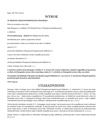 Sygn. akt VII U 69/12 WYROK W IMIENIU RZECZYPOSPOLITEJ POLSKIEJ Dnia 25 września 2015 roku Sąd Okręgowy w Lublinie VII Wydział Pracy i Ubezpieczeń Społecznych w składzie: Przewodniczący –Sędzia SO Małgorzata Kowalska Protokolant prot. sądowy Agnieszka Goluch po rozpoznaniu w dniu 25 września 2015 roku w Lublinie sprawy G. F. przeciwko Zakładowi Ubezpieczeń Społecznych Oddział w L. o prawo do renty rodzinnej z tytułu wypadku przy pracy na skutek odwołania G. F. od decyzji Zakładu Ubezpieczeń Społecznych Oddział w L. z dnia 10 lutego 2010 roku znak (...) I zmienia zaskarżoną decyzję i ustala G. F. prawo do renty rodzinnej z tytułu wypadku przy pracy w dniu 16 listopada 2009 roku zmarłego męża S. F. od dnia 21 listopada 2009 roku na stałe; II zasądza od Zakładu Ubezpieczeń Społecznych Oddział w L. na rzecz G. F. kwotę 60 złotych tytułem poniesionych kosztów adwokackich. VII U 69/12 UZASADNIENIE Decyzją z dnia 10 lutego 2010 roku Zakład Ubezpieczeń Społecznych Oddział w L. odmówił G. F. prawa do renty rodzinnej, po zmarłym w dni 21 listopada 2009 roku mężu S. F., na podstawie przepisów ustawy z dnia 30 października 2002 roku o ubezpieczeniu społecznym z tytułu wypadków przy pracy i chorób zawodowych (Dz.U. z 2002r., Nr 199, poz. 1679 ze zm. – dalej ustawa wypadkowa). W uzasadnieniu podniesiono, że Zakład nie uznał zdarzenia z dnia 16 listopada 2009 roku, w następstwie którego zmarł mąż wnioskodawczyni, za wypadek przy pracy, z tego względu wnioskodawczyni nie przysługuje renta rodzinna z ubezpieczenia wypadkowego (k. 53, t. I a.r.). Od tej decyzji odwołanie wniosła G. F., domagając się jej zmiany i przyznania prawa do wypadkowej renty rodzinnej po zmarłym mężu. W uzasadnieniu wskazała, iż mąż jej zmarł na zawał serca, który nastąpił podczas wykonywania przez niego pracy w dniu 16 listopada 2009 roku. Podniosła również, że odmówiono jej prawa do jednorazowego odszkodowania z tytułu śmierci męża wskutek wypadku przy pracy, i decyzję tą również zaskarżyła (k. 2-3 a.s.). Organ rentowy w odpowiedzi na odwołanie domagał się jego oddalenia, podnosząc jak w treści zaskarżonej decyzji (k. 4 a.s.). Postanowieniem z dnia 14 lutego 2011 roku postępowanie w sprawie zostało zawieszone do czasu prawomocnego zakończenia sprawy VII U 234/10. Postanowieniem z dnia 19 sierpnia 2014 roku postępowanie w sprawie zostało podjęte w związku z prawomocnym zakończeniem sprawy VII U 348/11. Sąd Okręgowy ustalił, co następuje: W dniu 21 listopada 2009 roku zmarł S. F.. Był on zatrudniony w Przedsiębiorstwie (...). W dniu 16 listopada 2009 roku, w czasie wykonywania pracy na drugiej zmianie S. F. doznał rozległego zawału, był reanimowany a następnie przewieziony do OIOK Kliniki (...) w L.. Nie chwili śmierci nie odzyskał przytomności, zmarł w wyniku ponownego zatrzymania krążenia (bezsporne). W dniu 22 grudnia 2009 roku G. F., wdowa po S. F. złożyła wniosek o jednorazowe odszkodowanie z tytułu śmiertelnego wypadku męża oraz o rentę rodzinną na podstawie przepisów ustawy wypadkowej (k. 1 akt OWP 07/86141 oraz k. 1, t. I a.r.). Decyzjami z dnia 10 lutego 2010 roku, Nr (...) oraz (...) odmówiono wnioskodawczyni prawa do jednorazowego odszkodowania z tytułu wypadku zaistniałego w dniu 16 listopada 2009 roku, wskutek którego śmierć poniósł jej mąż oraz renty rodzinnej po mężu z ubezpieczenia wypadkowego. Zakład, powołując się na zapisy w protokole powypadkowym uznał, iż zdarzenie z dnia 16 listopada 2009 roku nie było wypadkiem przy pracy, gdyż nie wystąpiła przyczyna zewnętrzna, a przyczyną zasłabnięcia, utraty przytomności i w konsekwencji śmierci ubezpieczonego był samoistny zawał serca spowodowany chorobą niedokrwienną serca (k. 57 akt OWP oraz k. 53, t I a.r.). Obydwie te decyzje zaskarżyła G. F.. Na skutek jej odwołania przed Sądem Rejonowym w Lublinie toczyło się postępowanie sądowe, w toku którego Sąd ustalił, iż zaistniałe w dniu 16 listopada 2009 roku zdarzenie było wypadkiem przy pracy, gdyż miało wszelkie cechy wypadku: było zdarzeniem nagłym, wywołanym przyczyną zewnętrzną współistniejącą z przyczyną wewnętrzną oraz powstało w związku z wykonywaniem zwykłych czynności przez pracownika. Na skutek tak poczynionych ustaleń Sąd Rejonowy zmienił zaskarżoną decyzję z dnia 10 lutego 2010 roku, nr (...) i przyznał wnioskodawczyni jednorazowe odszkodowanie z tytułu śmiertelnego wypadku przy pracy jej męża S. F., jakiemu uległ on w dniu 16 listopada 2009 roku. Wyrok ten uprawomocnił się. Sąd dołączył w celach dowodowych akta sprawy Sądu Rejonowego w Lublinie, sygn.. VII U 348/11 (vide wyrok i uzasadnienie wyroku Sądu Rejonowego z dnia 25 czerwca 2013 roku - akta sprawy VII U 348/11 o prawo do jednorazowego odszkodowania z tytułu śmiertelnego wypadku ubezpieczonego). W toku niniejszego postępowania ustalono, iż S. F. był osoba całkowicie niezdolną do pracy od dnia 16 listopada 2009 roku tj. od daty wystąpienia zawału serca. Wcześniej zmarły nie chorował, regularnie przechodził badania okresowe na stanowisko mechanika pojazdów samochodowych, które nie wykazywały, iż jej na coś chory. W dniu 16 listopada 2009 roku podczas wykonywania sowich obowiązków pracowniczych stracił przytomność,. Nieprzytomnego i zaintubowanego przewieziono go karetką pogotowia do szpitala, gdzie rozpoznano zawał serca ściany dolnej. Pomimo prowadzonego intensywnego leczenia, nie odzyskawszy przytomności, S. F. zmarł w dniu 21 listopada 2009 rok. Zgon ten pozostawał bezpośrednim związku przyczynowo – skutkowym oraz czasowym z zaistniałym zdarzeniem – wypadkiem przy pracy (k. opinia k.106 a.s.). Na marginesie wskazać należy, iż G. F. ma ustalone prawo do renty rodzinnej, na podstawie przepisów ustawy z dnia 17 grudnia 1998 roku o emeryturach i rentach z Funduszu Ubezpieczeń Społecznych, po