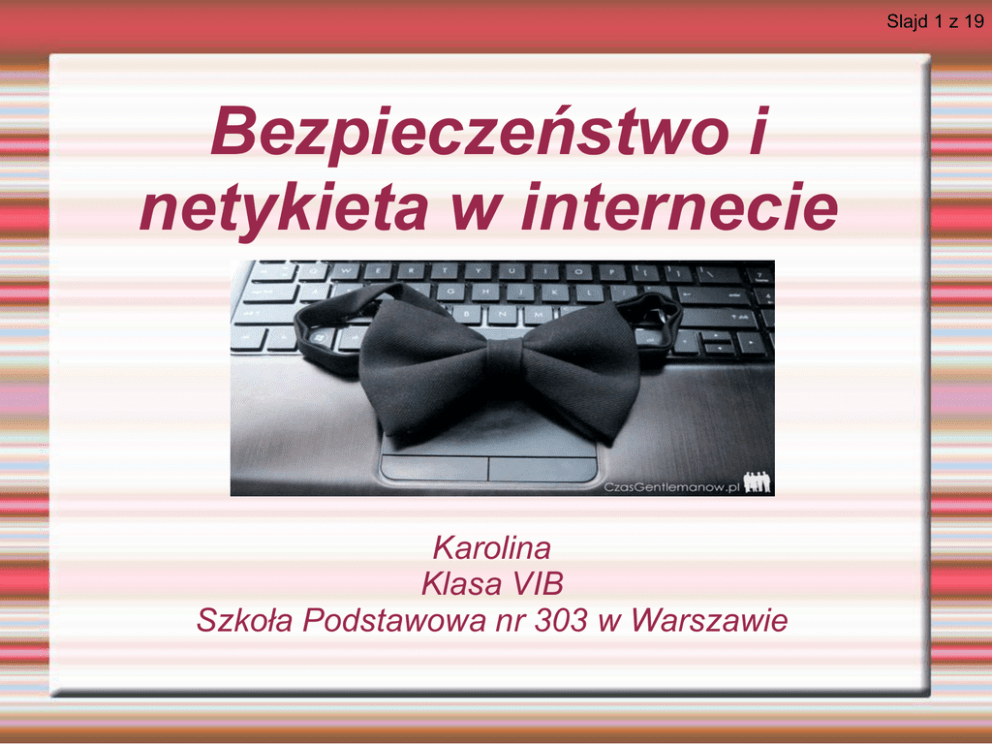 Slajd 1 z 19 Bezpieczeństwo i netykieta w internecie Karolina Klasa VIB Szkoła Podstawowa nr 303 w Warszawie Slajd 2 z 19 Na pewno każdy z Was nie wyobraża sobie życia bez internetu . Internet to wspaniały wynalazek, który umożliwia ludziom komunikowanie się ze znajomymi, rodziną, którzy znajdują się w najodleglejszych zakątkach świata. Internet odkrywa tajemnice i zagadki przyrody, historii, całego świata pod warunkiem przestrzegania pewnych zasad. Zasad bezpiecznego i kulturalnego korzystania z internetu pozwolą na Wam na pełne, bezstresowe i bezproblemowe czerpanie wiedzy o nauce oraz wiedzy o świecie. Slajd 3 z 19 Bezpieczeństwo w Internecie Najważniejsze zasady: Nigdy nie podawaj w Internecie swojego prawdziwego imienia i nazwiska. Posługuj się nickiem, czyli pseudonimem, internetową ksywką. Nigdy nie podawaj osobom poznanym w Internecie swojego adresu domowego, numeru telefonu i innych tego typu informacji (np.: godzin wyjścia, przyjścia do domu). Nie możesz mieć pewności, z kim naprawdę rozmawiasz! Nigdy nie wysyłaj nieznajomym swoich zdjęć. Nie wiesz, do kogo naprawdę trafią. Jeżeli wiadomość, którą otrzymałaś jest wulgarna lub niepokojąca nie odpowiadaj na nią. Pokaż swoim rodzicom lub innej zaufanej osobie dorosłej. Slajd 4 z 19 Bezpieczeństwo w Internecie Najważniejsze zasady cd.: Pamiętaj, że nigdy nie możesz mieć pewności, z kim rozmawiasz w Internecie. Ktoś, kto podaje się za twojego rówieśnika w rzeczywistości może być dużo starszy i mieć wobec ciebie złe zamiary. Kiedy coś lub ktoś w Internecie cię przestraszy, koniecznie powiedz o tym rodzicom lub innej zaufanej osobie dorosłej. Internet to skarbnica wiedzy, ale pamiętaj, że nie wszystkie informacje, które w nim znajdziesz muszą być prawdziwe! Staraj się zawsze sprawdzić wiarygodność informacji. Z rozwagą zamieszczaj swoje zdjęcia na portalach społecznościowych. Praktycznie zostają na zawsze i żyją własnym życiem. Slajd 5 z 19 Netykieta Oto zbiór reguł, których przestrzeganie ułatwi Ci pracę i zabawę w sieci, a także spowoduje, że nie będziesz uciążliwy dla innych. Slajd 6 z 19 Pamiętaj! Korzystając z Internetu staraj się przestrzegać netykiety by inni użytkownicy Internetu bezbłędnie Cię rozumieli! Przeczytaj jej zasady uważnie i rozumnie się stosuj do rad w nich zawartych. Slajd 7 z 19 Zasady netykiety podobnie jak zwykłe zasady przyzwoitego zachowania, nie jest dokładnie skodyfikowana, nikt też nie zajmuje się systematycznym karaniem osób łamiących te zasady, jednak uparte łamanie zasad netykiety może się wiązać z różnymi przykrymi konsekwencjami, jak np.: zgłoszenie nadużycia do działu abuse i odcięcie „niegrzecznego” osobnika od określonej usługi internetowej przez jej administratora. Slajd 8 z 19 Netykieta dla list i grup dyskusyjnych zakaz pisania wulgaryzmów, zakaz spamowania (między innymi wysyłania niechcianych linków do stron), zakaz wysyłania tzw. „łańcuszków szczęścia”, nakaz zapoznania się z wykazem FAQ przed zadaniem pytania, stosowanie się do reguł pisania obowiązujących w danej grupie, np. sposób kodowania, polskich liter, zasad cytowania itp., zakaz nadmiernego cross-postowania czyli wysyłania e-maili lub postów do kilku grup naraz, zakaz wysyłania listów (e-maili) do wielu osób naraz z jawnymi adresami poczty elektronicznej (stosujemy kopię ukrytą), zakaz pisania nie na temat (OT – OffTopic), zakaz pisania kilka razy z rzędu (szczególnie restrykcyjnie używany na forach posiadających funkcję edycji postu), zakaz odpowiadania nad cytowanym fragmentem (topposting), zakaz pisania wiadomości wielkimi literami (krzyczenia). Slajd 9 z 19 Netykieta IRC, komunikatory, czaty, fora dyskusyjne na stronach WWW obowiązek korzystania z funkcji „Szukaj” na forach, przed założeniem nowego wątku (na omawiany już temat, problem), zakaz floodowania, nakaz zapoznania się z FAQ danego kanału, forum, czatu i przestrzeganie zawartych tam zasad szczegółowych, zakaz nagabywania osób, które sobie tego nie życzą, zasady dotyczące znaków diakrytycznych – użytkownicy niektórych kanałów IRC nie życzą sobie używania polskich liter, natomiast na forach internetowych pisanie bez polskich znaków diakrytycznych bywa źle widziane, dopuszczalne jest korzystanie z różnych języków na kanałach wielonarodowościowych, zakaz ciągłego pisania wielkimi literami, zakaz pisania naprzemiennie wielkich i małych liter (tzw. nOwOmOwA iNtErNeToWa, poke-pismo), nakaz używania emotikon z rozwagą (mają być dodatkiem do tekstu, a nie główną treścią), w dyskusjach, zwłaszcza w Usenecie i na forach internetowych zwracamy się po nicku lub imieniu jeśli rozmówca wyraża na to zgodę. Nigdy samym nazwiskiem. Nie należy się obrażać, jeśli ktoś zwraca się do nas „per ty”, a nie w formie grzecznościowej, i nie należy się obawiać używania takiej bezpośredniej formy. Slajd 10 z 19 Netykieta dla korespondencji elektronicznej (e-mail): nakaz trzymania się wątku w korespondencji elektronicznej lub cytowanie e-maila (w przypadku braku takiej opcji w skrzynce), nakaz dopisywania wątku korespondencji pod spodem (głównie dot. e-mail), zalecenie, by sygnaturka nie miała więcej niż cztery linie. Do jej długości nie wlicza się linii poświęconej na delimiter (Wikipedia). Slajd 11 z 19 Netykieta Przykłady zachowań sprzecznych z netykietą Trollowanie Kłótnia internetowa Slajd 15 z 19 10 przykazań użytkownika komputera 1. Nie używaj komputera, po to, aby szkodzić innym. 2. Nie zakłócaj pracy na komputerach innym. 3. Nie przeglądaj bez pozwolenia cudzych danych. 4. Nie używaj komputera, jako narzędzia do kradzieży. 5. Nie używaj komputera, do różnych nieetycznych sztuczek. 6. Nie używaj i nie kopiuj cudzych programów, za które nie zapłaciłeś. 7. Nie publikuj bez wiedzy autora, tekstów których autorem jest ktoś i