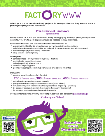 Colapi Sp. z o.o. w ramach realizacji projektu dla swojego klienta – firmy Factory WWW - poszukujedopracyosóbnastanowisko: PrzedstawicielHandlowy (pracazdalna) Factory WWW Sp. z o.o. jest nowoczesną firmą, zajmującą się produkcją profesjonalnych stron internetowych.Ofertaspółkidopasowanajestdokażdegorodzajudziałalności. Osobazatrudnionanatymstanowiskubędzieodpowiedzialnaza: • pozyskiwanieklientówdoprzygotowaniaindywidualnejstronyinternetowej • odbióriprzekazywaniemateriałówpotrzebnychdoprzygotowaniastronyinternetowej • budowaniepozytywnychrelacjizklientami • stałykontaktzcentraląfirmy Oczekujemy: • samodzielnościikreatywnościwmyśleniuidziałaniu • umiejętnościsamodzielnejpracy • dobrejorganizacjiwłasnejpracy • zdolnościnegocjacyjnych • podstawowejznajomościobsługikomputeraorazpakietuMSOffice Oferujemy: • wysokieprowizjeodsprzedaży(bruIo): 200złstronaBASIC,300złstronaSTANDARD,400złstronaPREMIUM • • • • • zatrudnieniewoparciuoumowęzlecenie pracęwdowolnymmiejscuidowolnymczasie(pracazdalna) nowoczesnysysteme-szkoleńzzakresuprezentacji,negocjacjiisprzedaży 24godzinnydostępdoswoichdanychsprzedażowychifinansowych 24godzinnydostępdomateriałówszkoleniowych Osobyzainteresowaneprosimyoosobistąrejestracjępodadresem:pracatokasa.pl CzekamynaCiebie!