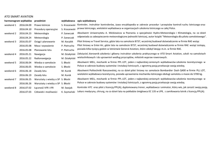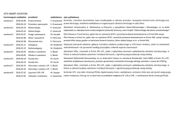 ATOSMARTAVIATION harmonogramwykładów przedmiot 2016.04.09 Prawolotnicze 2016.04.10 Proceduryoperacyjne wykładowca opiswykładowcy S.Kraszewski Kontroler, instruktor kontrolerów, żywa encyklopedia w zakresie procedur i przepisów kontroli ruchu lotniczego oraz S.Kraszewski prawalotniczego,wieloletniwykładowcaworganizacjachszkolenialotniczegowcałejPolce. weekend2 2016.04.23 Meteorologia P.Szewczak weekend3 2016.04.24 2016.05.07 Meteorologia Osiągiiplanowanie P.Szewczak M.Kocybik 2016.05.08 Masaiwyważenie P.Pietrucha 2016.05.08 Planowanielotu P.Pietrucha 2016.05.21 Nawigacja 2016.05.22 Radionawigacja M.Działyński Założyciel, kierownik szkolenia i główny instruktor szkolenia praktycznego w ATO Smart Aviation, szkoli na samolotach M.Działyński wielosilnikowychidouprawnieńwedługprzyrządów,miłośnikwyprawrowerowych. 2016.06.04 Wiedzaosamolocie S.Błocki 2016.06.05 Wiedzaosamolocie S.Błocki 2016.06.18 Zasadylotu M.Kurek 2016.06.19 Zasadylotu M.Kurek 2016.06.25 WarsztatyzwiedzyoSP S.Błocki 2016.06.26 WarsztatyzwiedzyoSP S.Błocki Absolwent MEiL, mechanik w firmie PPL LOT, jeden z najbardziej cenionych wykładowców szkolenia teoretycznego w Polscewzakresiebudowysystemówiinstalacjilotniczych,zogromnąpasjąprzekazujeswojąwiedzę. 2016.07.02 ŁącznośćVFRiIFR M.Swojak KontrolerATCorazpilotzlicencjąPPL(A),dyplomowanytrener,wykładowcaianimator,którywie,jakzarazićswojąpasją. 2016.07.03 Człowiekimożliwości K.Szymański Lekarzmedycyny,chirurg,nacodzieńlatanapokładzieśmigłowcaEC135wLPR,zzamiłowanialotnikzlicencjąPPL(A). weekend1 weekend4 weekend5 weekend6 weekend7 weekend8 Absolwent Uniwersytetu A. Mickiewicza w Poznaniu o specjalności Hydro-Meteorologia i Klimatologia, na co dzień odpowiadazazabezpieczeniemeteorologicznejednostkilotniczej,autorksiążki"Meteorologiadlapilotasamolotowego". PilotliniowywTravelService,gdzielatanasamolocieB737,wcześniejbudowałdoświadczeniewfirmieRAEwożąc izotopy. Pilot liniowy w Enter Air, gdzie lata na samolocie B737, wcześniej budował doświadczenie w firmie RAE wożąć izotopy, posiadakilkatysięcygodzinwlotnictwieGeneralAviation,którezdobyłlatającm.in.wfirmieRAE. Absolwent MEiL, mechanik w firmie PPL LOT, jeden z najbardziej cenionych wykładowców szkolenia teoretycznego w Polscewzakresiebudowysystemówiinstalacjilotniczych,zogromnąpasjąprzekazujeswojąwiedzę. Absolwent Politechniki Rzeszowskiej, na co dzień pilot liniowy na samolocie Bombardier Dash Q400 w firmie PLL LOT, wieloletniwykładowcateoretyczny,posiadauprawnieniamechanikalotniczegoobsługisamolotuomasiedo5700kg.