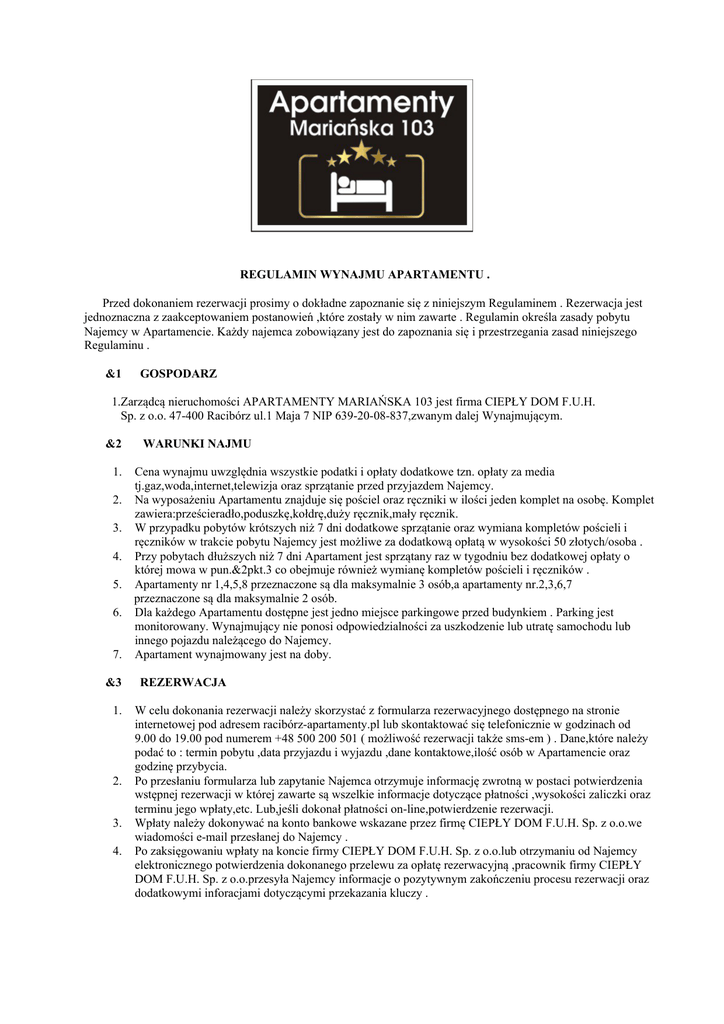 REGULAMIN WYNAJMU APARTAMENTU . Przed dokonaniem rezerwacji prosimy o dokładne zapoznanie się z niniejszym Regulaminem . Rezerwacja jest jednoznaczna z zaakceptowaniem postanowień ,które zostały w nim zawarte . Regulamin określa zasady pobytu Najemcy w Apartamencie. Każdy najemca zobowiązany jest do zapoznania się i przestrzegania zasad niniejszego Regulaminu . &1 GOSPODARZ 1.Zarządcą nieruchomości APARTAMENTY MARIAŃSKA 103 jest firma CIEPŁY DOM F.U.H. Sp. z o.o. 47-400 Racibórz ul.1 Maja 7 NIP 639-20-08-837,zwanym dalej Wynajmującym. &2 1. 2. 3. 4. 5. 6. 7. &3 1. 2. 3. 4. WARUNKI NAJMU Cena wynajmu uwzględnia wszystkie podatki i opłaty dodatkowe tzn. opłaty za media tj.gaz,woda,internet,telewizja oraz sprzątanie przed przyjazdem Najemcy. Na wyposażeniu Apartamentu znajduje się pościel oraz ręczniki w ilości jeden komplet na osobę. Komplet zawiera:prześcieradło,poduszkę,kołdrę,duży ręcznik,mały ręcznik. W przypadku pobytów krótszych niż 7 dni dodatkowe sprzątanie oraz wymiana kompletów pościeli i ręczników w trakcie pobytu Najemcy jest możliwe za dodatkową opłatą w wysokości 50 złotych/osoba . Przy pobytach dłuższych niż 7 dni Apartament jest sprzątany raz w tygodniu bez dodatkowej opłaty o której mowa w pun.&2pkt.3 co obejmuje również wymianę kompletów pościeli i ręczników . Apartamenty nr 1,4,5,8 przeznaczone są dla maksymalnie 3 osób,a apartamenty nr.2,3,6,7 przeznaczone są dla maksymalnie 2 osób. Dla każdego Apartamentu dostępne jest jedno miejsce parkingowe przed budynkiem . Parking jest monitorowany. Wynajmujący nie ponosi odpowiedzialności za uszkodzenie lub utratę samochodu lub innego pojazdu należącego do Najemcy. Apartament wynajmowany jest na doby. REZERWACJA W celu dokonania rezerwacji należy skorzystać z formularza rezerwacyjnego dostępnego na stronie internetowej pod adresem racibórz-apartamenty.pl lub skontaktować się telefonicznie w godzinach od 9.00 do 19.00 pod numerem +48 500 200 501 ( możliwość rezerwacji także sms-em ) . Dane,które należy podać to : termin pobytu ,data przyjazdu i wyjazdu ,dane kontaktowe,ilość osób w Apartamencie oraz godzinę przybycia. Po przesłaniu formularza lub zapytanie Najemca otrzymuje informację zwrotną w postaci potwierdzenia wstępnej rezerwacji w której zawarte są wszelkie informacje dotyczące płatności ,wysokości zaliczki oraz terminu jego wpłaty,etc. Lub,jeśli dokonał płatności on-line,potwierdzenie rezerwacji. Wpłaty należy dokonywać na konto bankowe wskazane przez firmę CIEPŁY DOM F.U.H. Sp. z o.o.we wiadomości e-mail przesłanej do Najemcy . Po zaksięgowaniu wpłaty na koncie firmy CIEPŁY DOM F.U.H. Sp. z o.o.lub otrzymaniu od Najemcy elektronicznego potwierdzenia dokonanego przelewu za opłatę rezerwacyjną ,pracownik firmy CIEPŁY DOM F.U.H. Sp. z o.o.przesyła Najemcy informacje o pozytywnym zakończeniu procesu rezerwacji oraz dodatkowymi inforacjami dotyczącymi przekazania kluczy . &4 1. 2. 1. 2. 3. 4. 5. &5 PRZYJAZD,ODBIÓR KLUCZY I PŁATNOŚĆ Doba w Apartamencie rozpoczyna się o godzinie 14.00, a kończy o godzinie 11.00. Zameldowanie odbywa się od godziny 12.00 do 18.00 . Istnieje opcja późniejszego zameldowania ( w godzinach 18.00 do 20.00 ), które objęte jest opłatą dodatkową w wysokości 50 zł . W takim wypadku wymagany jest wcześniejszy kontakt w celu potwierdzenia takiej możliwości . W przypadku braku możliwości dotarcie na umówioną wcześniej godzinę , Najemca zobowiązany jest do natychmiastowego powiadomienia telefonicznie obsługę Apartamentu.Wrazie braku kontaktu z Najemcą , Wynajmujący zastrzega sobie prawo do anulowania rezerwacji . W momencie przybycia do APARTAMENTU MARIAŃSKA 103 , Najemca zobowiązany jest do okazania ważnego dowodu tożsamości ( dowód osobisty,prawo jazdy,paszport ) . Następnie Najemca zobowiązany jest do uiszczenia reszty należności za pobyt gotówką lub kartą płatniczą . Klucze zostają wydane dopiero po dokonaniu ww.formalności . Recepcjonista ma prawo do odmowy wydania kluczy w przypadku gdy Najemca : - nie posiada ważnego dowodu osobistego; - znajduje się pod wpływem alkoholu lub innych środków odużających; - zachowuje się w sposób agresywny Właściciel Apartamentu może żądać wpłaty kaucji na pokrycie ewentualnych szkód. Kaucja zostanie zwrócona niezwłocznie po zakończeniu pobytu w przypadku niestwierdzeniu jakichkolwiek szkód bądź zniszczeń.Jeżeli w Apartamencie zostaną stwierdzone szkody bądź zniszczenia zwrot kaucji zostaje wstrzymany do czasu wyceny. Jeżeli wysokość kaucji będzie wyższa od wartości szkód bądź zniszczeń, różnica zostanie zwrócona w identycznej formie płatności ,w jakiej była dokonana. Jeżeli wysokość kaucji będzie niższa od wartości szkód bądź zniszczeń Najemca zostanie wezwany do zapłaty. ANULACJA REZERWACJI I SKRÓCENIE POBYTU 1. W momencie rezerwacji wymaganym jest dokonanie opłaty rezerwacyjnej. 2. W przypadku anulowania rezerwacji obowiązują następujące warunki : do 14 dni przed przyjazdem – całkowity zwrot przedpłaty,do 7 dni 50% zwrotu przedpłaty,poniżej 7 dni nie ma zwrotu przedpłaty. 3. Wynajmujący nie jest zobowiązany do zwrotu pieniędzy za niewykorzystany przez Najemcę okres pobytu. 4. W przypadku braku możliwości dotarcia na umówioną wcześniej godzinę ,Najemca zobowiązany jest do natychmiastowego powiadomienia telefonicznie obsługę Apartamenty Mariańska 103 . W razie braku kontaktu z Najemcą , firma CIEPŁY DOM Sp. z.o.o zastrzega sobie prawo do anulowania rezerwacji i rozliczenia zgodnie z pn.&5 podpunkt 2 . &6 1. 2. 3. 4. 5. 6. OBOWIĄZKI KLIENTA Najemca zobowiązuje się używać przedmiotu najmu wyłącznie w celach mieszkaniowych i nie może oddawać Apartamentu w podnajem ani bezpłatne używanie osobom trzecim. Liczba osób przebywająca w Apartamencie jest ograniczona do liczby zgłoszonej w procesie rezerwacji .Jeżeli ilo