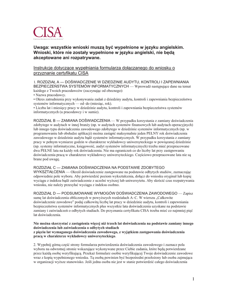 Uwaga: wszystkie wnioski muszą być wypełnione w języku angielskim. Wnioski, które nie zostały wypełnione w języku angielski, nie będą akceptowane ani rozpatrywane. Instrukcje dotyczące wypełniania formularza dołączanego do wniosku o przyznanie certyfikatu CISA 1. ROZDZIAŁ A — DOŚWIADCZENIE W DZIEDZINIE AUDYTU, KONTROLI I ZAPEWNIANIA BEZPIECZEŃSTWA SYSTEMÓW INFORMATYCZNYCH — Wprowadź następujące dane na temat każdego z Twoich pracodawców (zaczynając od obecnego): • Nazwa pracodawcy. • Okres zatrudnienia przy wykonywaniu zadań z dziedziny audytu, kontroli i zapewniania bezpieczeństwa systemów informatycznych — od–do (miesiąc, rok). • Liczba lat i miesięcy pracy w dziedzinie audytu, kontroli i zapewniania bezpieczeństwa systemów informatycznych (u pracodawcy i w sumie). ROZDZIAŁ B — ZAMIANA DOŚWIADCZENIA — W przypadku korzystania z zamiany doświadczenia zdobytego w audytach w innej branży (np. w audytach systemów finansowych lub audytach operacyjnych) lub innego typu doświadczenia zawodowego zdobytego w dziedzinie systemów informatycznych (np. w programowaniu lub obsłudze aplikacji) można zastąpić maksymalnie jeden PEŁNY rok doświadczenia zawodowego w dziedzinie audytu bądź systemów informatycznych. W przypadku korzystania z zamiany pracy w pełnym wymiarze godzin w charakterze wykładowcy uniwersyteckiego w powiązanej dziedzinie (np. systemy informatyczne, księgowość, audyt systemów informatycznych) trzeba mieć przepracowane dwa PEŁNE lata na każdy rok doświadczenia. Nie ma ograniczeń co do liczby lat przy zastępowaniu doświadczenia pracą w charakterze wykładowcy uniwersyteckiego. Częściowo przepracowane lata nie są brane pod uwagę. ROZDZIAŁ C — ZAMIANA DOŚWIADCZENIA NA PODSTAWIE ZDOBYTEGO WYKSZTAŁCENIA — Określ doświadczenie zastępowane na podstawie odbytych studiów, zaznaczając odpowiednie pole wyboru. Aby potwierdzić poziom wykształcenia, dołącz do wniosku oryginał lub kopię wyciągu z indeksu bądź zaświadczenie z uczelni wyższej lub uniwersytetu. Aby skrócić czas rozpatrywania wniosku, nie należy przesyłać wyciągu z indeksu osobno. ROZDZIAŁ D — PODSUMOWANIE WYMOGÓW DOŚWIADCZENIA ZAWODOWEGO — Zapisz sumę lat doświadczenia obliczonych w powyższych rozdziałach A–C. W wierszu „Całkowite doświadczenie zawodowe” podaj całkowitą liczbę lat pracy w dziedzinie audytu, kontroli i zapewniania bezpieczeństwa systemów informatycznych plus wszystkie lata doświadczenia uzyskane na podstawie zamiany i zaświadczeń o odbytych studiach. Do przyznania certyfikatu CISA trzeba mieć co najmniej pięć lat doświadczenia. Nie można skorzystać z zastąpienia więcej niż trzech lat doświadczenia na podstawie zamiany innego doświadczenia lub zaświadczenia o odbytych studiach z pięciu lat wymaganego doświadczenia zawodowego, z wyjątkiem zastępowania doświadczenia pracą w charakterze wykładowcy uniwersyteckiego. 2. Wypełnij górną część strony formularza potwierdzenia doświadczenia zawodowego i zaznacz pola wyboru na odwrotnej stronie wskazujące wykonywane przez Ciebie zadania, które będą potwierdzane przez każdą osobę weryfikującą. Przekaż formularz osobie weryfikującej Twoje doświadczenie zawodowe wraz z kopią wypełnionego wniosku. Tą osobą powinien być bezpośredni przełożony lub osoba zajmująca w organizacji wyższe stanowisko. Jeśli jedna osoba nie jest w stanie potwierdzić całego doświadczenia 1 wymaganego do zdobycia certyfikatu CISA, poproś poprzednich pracodawców o wypełnienie tego formularza. Uwaga: jeśli okres zatrudnienia w obecnej organizacji jest krótszy niż trzy miesiące, potwierdzenia doświadczenia zawodowego muszą dokonać poprzedni pracodawcy. Dołączone są dwie kopie formularza. Jeśli potrzebne są dodatkowe kopie, zrób kserokopię formularza (obu stron). Wszystkie formularze potwierdzenia doświadczenia zawodowego (z przodu i z tyłu) powinny być podpisane przez osobę weryfikującą i przesłane wraz z wnioskiem. Aby skrócić czas rozpatrywania wniosku, prześlij wypełnione formularze potwierdzenia razem z wnioskiem. Instrukcje dotyczące wypełniania formularza dołączanego do wniosku o przyznanie certyfikatu CISA (ciąg dalszy) 3. Aby proces rozpatrywania wniosku przebiegał sprawnie, należy zebrać całą potrzebną dokumentację (formularze potwierdzenia doświadczenia zawodowego oraz wszystkie wyciągi z indeksu lub zaświadczenia z uczelni wyższej) i przesłać wypełniony wniosek o przyznanie certyfikatu CISA na adres: Certification Coordinator ISACA 3701 Algonquin Road, Suite 1010 Rolling Meadows, IL 60008-3124 USA Adres e-mail: [email protected] Telefon: +1 847 660 5660 Faks: +1 847 253 1443 UWAGA: czas rozpatrywania wniosku o przyznanie certyfikatu CISA może wynieść około osiem tygodni. Po zatwierdzeniu przesłana zostanie przesyłka zawierająca zaświadczenie o przyznaniu certyfikatu, certyfikat CISA oraz wymogi dotyczące polityki kontynuacji edukacji zawodowej. 2