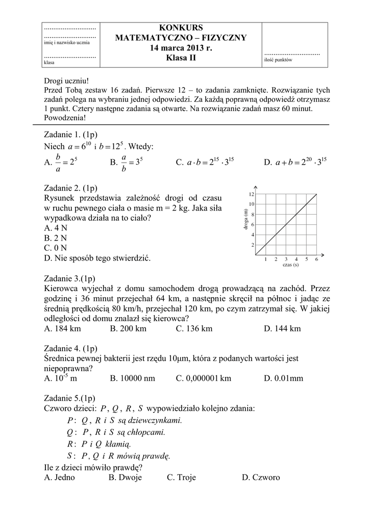 KONKURS MATEMATYCZNO – FIZYCZNY 14 marca 2013 r. Klasa