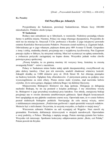 1 [Druk: „Przewodnik Katolicki” 42(1963), s. 436-438.] Ks. Posadzy Od Pacyfiku po Atlantyk Przyjeżdżamy do Saskatoon, prowincji Saskatchewan. Miasto liczy 100.000 mieszkańców. Polaków około tysiąca. W Saskatoon Rodacy nasi zatrudnieni są w fabrykach, w rzemiośle. Niektórzy posiadają własne farmy w pobliżu miasta. Niestety, Polacy nic mają własnego duszpasterza. Przyjeżdża do nich raz na miesiąc ks. Smyczyk T.Chr. proboszcz z Krydor. Z jego inicjatywy powstało ostatnio Katolickie Stowarzyszenie Polaków. Prezesem został ruchliwy p. Zygmunt Indyk. Odwiedzamy go w jego własnym, pięknym domu przy 409 Avenue G South. Gospodarz z żoną i córką, studentką chemii, przyjmują nas z wyjątkową życzliwością. Pan Zygmunt pracuje ciężko w fabryce, by utrzymać rodziną. Musi też wystarczyć na spłatę samochodu, a zwłaszcza pożyczki zaciągniętej na kupno domu. Wszystkie jednak wolne chwile poświęca pracy społecznej. „Proszę księdza, tu za granicą musimy iść wszyscy ławą. Jesteśmy tu zresztą awangardą Polski” - mówi z naciskiem. Polacy w Saskatoon mimo braku stałej opieki duszpasterskiej, zweryfikowali się jako dobrzy katolicy. Choć jest ich niewielu, uradzili zbudować właściwy kościół. Zakupili działkę za 5.000 dolarów przy ul. 20-th Street M. Już zbierają pieniądze na budowę kościoła. Oglądam listę ofiarodawców. Z pietyzmem patrzę na podpisy oraz wyszczególnione za nimi ofiary. Pismo nieraz mało wyraźne, stąd nazwiska ledwie czytelne. Za to serca gorące, drgające miłością Boga i tej dalekiej Ojczyzny. Miejscowemu Biskupowi Kleinowi nie dają spokoju. Delegacja za delegacją nachodzi Biskupa, by im się postarał o księdza polskiego. I my złożyliśmy wizytę ks. Biskupowi w jego przytulnej rezydencji przy katedrze. Ten młody, energiczny biskup przyjmuje nas w swoim skromnie umeblowanym gabinecie. Spod długich krzaczastych brwi spoglądają na nas głęboko osadzone czarne oczy. Opowiada nam, że w czasie Soboru poznał niektórych biskupów polskich. Nawiązując do celu naszej wizyty, mówi z niekłamanym entuzjazmem: „Podziwiam gorliwość i zapał apostolski waszych rodaków. Możecie być z nich dumni. Oczywista, że uczynię wszystko, co będzie w mojej mocy”. Wieczorem zebranie Polaków na sali wynajętej od Węgrów. Nasi stawili się gromadnie. Powitania, deklamacje dziewczynek w strojach narodowych. Opowiadam o swej podróży, o Polsce. Słuchają z napiętą uwagą. Potem stawiają pytania bez końca. Wszystko ich interesuje. Spotkanie kończymy odśpiewaniem pieśni „Boże, coś Polskę”. Potem powrót do Krydor. 2 Jadąc ulicami miasta, słyszymy za nami charakterystyczne sygnały policji porządkowej. Nie uświadamiamy sobie, o co chodzi. Stajemy jednak posłuszni na wezwanie. Pędzący za nami samochód zatrzymuje się również. Wychodzi z niego starszy pan w kraciastej koszuli. To chyba ktoś z tajnej policji - myślimy sobie. Ale już za chwilę okazuje się, że to nasz rodak, pan Babiarz. Nie mogąc nas dopędzić, dawał sygnały policyjne, aby nas zmusić do zatrzymania. Następnie nasz przyjaciel wyciąga z walizki wędliny, pieczywo i inne smakołyki. „To dla was, kochani goście z Polski. I to z wielkiej wdzięczności, boście tego wieczoru przypomnieli ml moje ojczyste strony”. Z Krydor 900 km samochodem z powrotem do Calgary. Jeszcze dwa dni pobytu wśród Polonii w tym mieście. Pożegnanie na sali Związku Polaków. Przemówienia, wyznania wierności i przywiązania, deklamacje, wspólne śpiewy. [s. 436] „Lubimy takie uroczystości, bo każda z nich mobilizuje ducha polskiego i cementuje naszą wspólnotę” mówi na zakończenie prezes Związku p. Władysław Chuchla. Na wschód Kanady Z Calgary samolotem do Toronto. Jakieś 4000 km lotu. Wzbijamy się na wysokość 12.000 metrów. Tam na zachód Góry Skaliste, wielkie miasto portowe Vancouver i bezkresny Ocean Spokojny. Lecimy odrzutowcem linii lotniczej „Trans Canada Airlines”. Jest to przedsiębiorstwo państwowe. Prócz togo istnieje wielka linia lotnicza „Canadian Pacific Airlines”, która znajduje się w rękach prywatnych. Są jeszcze inne linie prywatne, które przewożą pasażerów i towary do wszystkich części Kanady. Tu zresztą ludzie chętniej podróżują samolotem niż koleją. Toteż w pociągach pustki, mimo wielkich napisów propagandowych umieszczonych przez zarząd kolei. Napisy głoszą: Go relaxed, go by train - chcesz odpocząć, jedź pociągiem. Lądujemy w Robina, stolicy prowincji Saskatchewan. Szkoda, że nie ma czasu na odwiedzenie ks. Prałata Gockiego, wielkiego, niezmordowanego apostola polskości w tym mieście. Krótka przerwa i już za chwilę szybujemy dalej nad wielkimi preriami prowincji Manitoba. I znowu postój w Winnipeg, stolicy tej prowincji. Wymiana pasażerów i dalej podniebnym szlakiem nad bogatą prowincją Ontario. Lecimy nad miastem Fort William, nad Wielkimi Jeziorami, Lake Superior i Lake Huron. Liczne okręty na jeziorach i potężne elewatory na brzegach wypełnione eksportową pszenicą wyglądają jak drobne czarne punkciki. Te olbrzymie jeziora mają bezpośrednie połączenie z Atlantykiem. Droga wodna św. Wawrzyńca łączy je bezpośrednio z Montrealem. Kanałem tym, głębokości 12 metrów, płyną duże okręty oceaniczne z całego świata do wielkich miast Kanady i USA - Toronto, Bufallo, Cleveland, Detroit, Chicago. Po czterech godzinach lotu lądujemy na lotnisku w Toronto, drugim największym mieście Kanady. 3 Bohaterscy Oblaci Zamieszkujemy w domu O.O. Oblatów Niepokalanego Poczęcia N.M.P. przy ul. Indian Trail. Jest to siedziba O. Schmidta, przełożonego prowincji polskiej Oblatów. W Kanadzie wszyscy ze czcią wymawiają imię tego Zgromadzenia. Mówi się o „białej epopei” Oblatów w Kanadzie. Oni to dokonali najliczniejszych nawróceń wśród Indian, zwłaszcza Irokezów i Huronów w północnej Kanadzie. Po dziś dzi