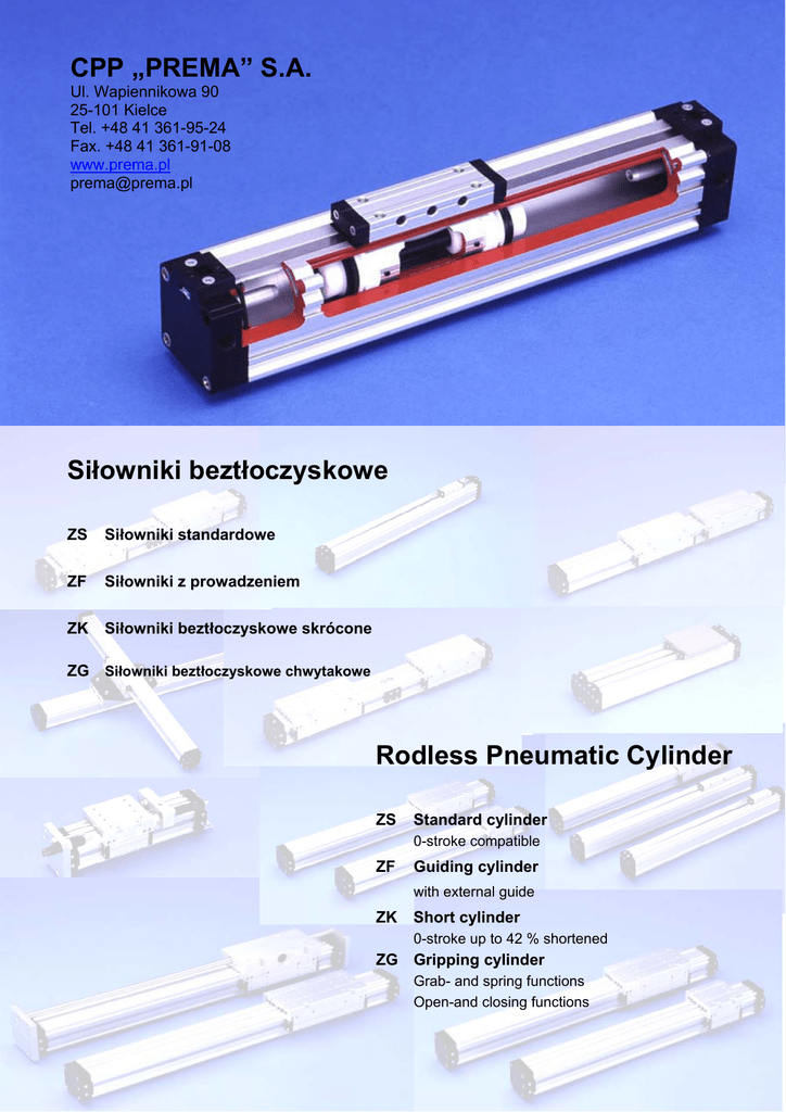 CPP „PREMA” S.A. Ul. Wapiennikowa 90 25-101 Kielce Tel. +48 41 361-95-24 Fax. +48 41 361-91-08 www.prema.pl [email protected] Siłowniki beztłoczyskowe ZS Siłowniki standardowe ZF Siłowniki z prowadzeniem ZK Siłowniki beztłoczyskowe skrócone ZG Siłowniki beztłoczyskowe chwytakowe Rodless Pneumatic Cylinder ZS Standard cylinder 0-stroke compatible ZF Guiding cylinder with external guide ZK Short cylinder 0-stroke up to 42 % shortened ZG Gripping cylinder Grab- and spring functions Open-and closing functions CPP “PREMA” S.A Kielce ul. Wapiennikowa 90 25-101 Kielce tel. 041 361-95-24 fax. 041 361-91-08 Typy siłowników Summary ZS Siłowniki beztłoczyskowe standardowe Wymiary montażowe standardowe Standard cylinder With identical fitting length as existing cylinders without piston 0 – stroke compatible Siłowniki beztłoczyskowe skrócone Siłowniki o wymiarach skróconych w stosunku do siłowników standardowych o 42% Short cylinder With extremely shortened fitting length 0 – stroke up to 42% shorter Siłowniki beztłoczyskowe z prowadzeniem Z zewnętrznym elementem prowadzącym w celu zwiększenia dopuszczalnych obciążeń roboczych Guiding cylinder With external and adjustable slide guide For high loads ZP Siłowniki beztłoczyskowe równoległe Dla dużych obciążeń i momentów działających w różnych kierunkach, dwustronnego działania Parallel cylinder for high loads and moments in every direction double action force central port ZGS ZGK ZGF ZGFK Siłowniki beztłoczyskowe chwytakowe Z funkcją chwytania i przenoszenia, występują jako zamykające lub otwierające Gripping cylinder Gripping and clamping functions Opening & closing functions ZTS ZTK ZTF Siłowniki beztłoczyskowe typu Tandem Dostosowane do dużych obciążeń i przenoszenia momentów działających na siłownik Tandem Cylinder for high moments in longitudinal direction ZDS ZDK ZDF ZDFK Siłowniki beztłoczyskowe dwustronnego działania Działające z siłą w dwóch kierunkach do zaciskania, przenoszenia itp. Double Action Cylinder double action force pressing, embossing, punching etc. FB MB PB KT Akcesoria Do montażu jednostek posuwowych Accessories ZSS ZK ZKS ZF ZFF ZFK ZFU ZFB Łączniki krzyżowe Łączniki prostopadłe Mounting brackets Middle support Swinging bridge Cross support etc. Strona 1 CPP “PREMA” S.A Kielce ul. Wapiennikowa 90 25-101 Kielce tel. 041 361-95-24 fax. 041 361-91-08 Informacje techniczne Konstrukcja Construction Technical Information Siłowniki beztłoczyskowe z bezpośrednim połączeniem zespołu tłoka z suwakiem przez kanałek w tulei. Siłownik mogą być wyposażone w zewnętrzne prowadzenia zwiększające możliwość przenoszenia dużych sił i momentów. Siłowniki posiadają magnes (BSPT) do współpracy z czujnikami położenia tłoka. Skoki robocze o długości do 6000 mm, dłuższe skoki na zamówienie Zakres skoków roboczych Stroke Pozycja pracy Fitting position variable up to 6000mm, higher on request Dowolna Typ siłownika Operation Variable Siłowniki dwustronnego działania z amortyzacją pneumatyczną w krańcowych położeniach double acting with adjustable end-oftravel cushioning Ciśnienie pracy Operating pressure 2 -8 bar Temperatura pracy Operating temperature Medium robocze Medium Materiały konstrukcyjne Material Amortyzacja pneumatyczna Cushioning Rodless cylinder with direct power transmission through the tube slot onto the yoke -20°C - +80°C Sprężone powietrze filtrowane do 40 μm i naolejone lub powietrze suche filtrowane do 10 μm Części aluminiowe wykonane z profilu wyciskanego, uszczelnienia wykonane z elastomerów olejoodpornych i tworzyw sztucznych Amortyzacja pneumatyczna w krańcowych położeniach regulowana w zakresie od 0 do 100% poprzez obrót śruby regulacyjnej o kąt 90° Filtered and slightly oiled or not lubricated compressed air Aluminum parts made of high-strength alloy, sealing parts made of oil resistant plastics and elastomers The mode of operation of the new pintype cushioning is similar to an injection pump, which means that the flow rate ist changed by turning a control edge. A turning angle of 90° is sufficient for altering the cushioning effect from 0 to 100 %. Waga Weight Średnica D Siła / 6 bar siłownika Force / 6 bar cylinder Długość amortyzacji Cushioning ZS ZK ZF ZFF ZFK Waga / Skok Weight /stroke 18 140 N 15 mm 0.3 kg 0.2 kg 0.4 kg 0.6 kg 0.3 kg 1.5 kg /1000mm 25 270 N 18 mm 0.6 kg 0.4 kg 0.9 kg 1.1 kg 0.6 kg 2.6 kg /1000mm 32 440 N 24 mm 1.1 kg 0.7 kg 1.5 kg 2.2 kg 1.2 kg 3.6 kg /1000mm 40 680 N 34 mm 1.8 kg 1.2 kg 2.8 kg 3.8 kg 2.0 kg 4.8 kg /1000mm 50 1060 N 40 mm 3.2 kg 2.0 kg 4.9 kg 6.4 kg 3.2 kg 7.4 kg /1000mm 63 1680 N 49 mm 5.6 kg 3.2 kg 8.0 kg 10.4 kg 6.4 kg 10.0 kg /1000mm Strona 2 CPP “PREMA” S.A Kielce ul. Wapiennikowa 90 25-101 Kielce tel. 041 361-95-24 fax. 041 361-91-08 Cechy konstrukcyjne Advantages • Siłowniki posiadają tuleję kształtową wykonaną jako wyciskany profil aluminiowy o dużej sztywności. • High-strength aluminium-extruded section to reduce deflection and increase the slot width • • Front and side wipers on the yoke Suwak wyposażony jest w zgarniacze zewnętrzny i czołowy • • Grooves in tube profile for fixing various assessors Kanałki w profilu umożliwiają montaż różnych typów akcesoriów i czujników położenia • Fixation at the front can be turned by 4 x 90° • Elementy mocujące mogą być obracane o kąt 90° • New pin type cushioning • Large clamping surface on the yoke • Nowoczesne rozwiązanie z iglicą amortyzacji • Guiding over the entire stroke length • Duża powierzchnia do mocowania na suwaku • Przy dużych długościach skoków roboczych możliwość zewnętrznego prowadzenia suwaka • Możliwość wykonywania przyłączy z jednej strony siłownika • Możliwość przenoszenia dużych sił i momentów • Mocowanie prowadzenia możliwe również po instalacji siłownika • One-side connection