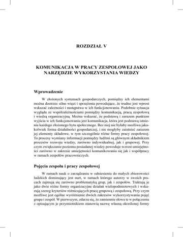 ROZDZIAŁ V KOMUNIKACJA W PRACY ZESPOŁOWEJ JAKO NARZĘDZIE WYKORZYSTANIA WIEDZY Wprowadzenie W złożonych systemach gospodarczych, pomiędzy ich elementami można dostrzec silne więzi i sprzężenia powodujące, że trudno jest wprost wskazać zależności i następstwa w ich funkcjonowaniu. Podobnie sytuacja wygląda ze współzależnościami pomiędzy komunikacją, pracą zespołową i wiedzą organizacyjną. Można wskazać, że podstawą i zarazem punktem wyjścia w ich funkcjonowaniu jest komunikacja, która jest podstawą istnienia każdego złożonego bytu społecznego. Bez niej nie byłaby możliwa jakakolwiek forma działalności gospodarczej, i nie mogłyby zaistnieć zarazem jej elementy składowe, w tym szczególnie różne formy pracy zespołowej. To procesy wymiany informacji pomiędzy ludźmi są głównym składnikiem procesów rozwoju wiedzy, zarówno indywidualnej, jak i grupowej. Przy czym zwiększanie poziomu posiadanej wiedzy powoduje wzrost umiejętności zarówno w zakresie umiejętności komunikowania się jak i współpracy w ramach zespołów pracowniczych. Pojęcia zespołu i pracy zespołowej W ramach nauk o zarządzaniu w odniesieniu do małych zbiorowości ludzkich dominujący jest nurt, w ramach którego autorzy w swoich pracach zajmują się zarówno problematyką grup, jak i zespołów. Traktują je jako dwie różne formy organizacyjne działań wielopodmiotowych i wskazują szereg kryteriów różnicujących pracę grupową i zespołową. Przy czym możliwe jest ogólne wyróżnienie dwóch zakresów wykorzystywania pojęć grupa i zespół. W pierwszym, zdarza się, że zamiennie słowa te w połączeniu z opisującym je przymiotnikiem stanowią nazwę własną określonej formy 100 Rozdział V organizacji pracy, np. grupa robocza, zespół funkcjonalny, zespół zadaniowy, zespół projektowy, zespół podnoszenia jakości itp. W tym przypadku grupa, czy też zespół utożsamiany jest z pewnym zbiorem pracowników, najczęściej o określonej liczebności, wskazanym kierowniku, przydzielonych zadaniach, nałożonych prawach i obowiązkach oraz z ustalonymi zasadami funkcjonowania. W ramach drugiego zakresu, termin zespół wykorzystywany jest dla wskazania „natury” danej zbiorowości pracowników. W tym przypadku pojęcia grupa i zespół są określeniami kolejnych stadiów rozwoju danego zbioru osób. Przyjmuje się tezę, że zespół jest formą rozwojową grupy, jest jej ewolucyjnym następcą. Definiując pojęcie „zespół” wskazuje się na cechy świadczące o jego dojrzałej formie. Dlatego też znaczna część prac zaliczanych do tego nurtu poświęcona jest tematyce przekształcania luźnych grup w sprawnie i skutecznie funkcjonujące zespoły, przy czym główna uwaga skupiona jest na stosunkach międzyludzkich oraz na rozwijaniu umiejętności współpracy1. Przykładowo J. D. Antoszkiewicz określa grupę jako „zbiór osób podobnego pochodzenia zgromadzonych w jednym miejscu i czasie dla wypełnienia jednakowego celu, ale bez specyficznych powiązań i współdziałania [Antoszkiewicz 1997, s. 198]. Natomiast zwraca uwagę, że zespół jest specyficzną grupą ludzi, która musi spełniać również następujące warunki: składać się z dwóch lub więcej osób, ale nie więcej niż tylu, aby zapewnić bezpośredni kontakt z inną osobą tego zbioru, realne kontakty pomiędzy nimi (interakcje) powinny przekraczać pewne minimum, kontakty (interakcje) powinny być zachowane w dłuższym przedziale czasu, posiadać chęci dla wspólnych działań, wspólnego ich realizowania, wyróżniać się poczuciem przynależności do zespołu. Dodatkowo zwraca on uwagę, że zespół jest to wyróżniony zbiór ludzi występujący jako samodzielna jednostka, którą opisują „szczególne procesy współdziałania – kooperacji i rywalizacji – ujmujące jego dynamikę” i charakterystyczne dla każdego zespołu „własne, (...) intersubiektywne zjawiska typu: normy, zachowania i standardy zbiorowe” [Antoszkiewicz 1997, s. 198]. Podobnie postępuje B. Kożusznik, rozróżniając pojęcia grupy i zespołu. Autorka utożsamia definicję grupy z określeniem (stosowanym w zakresie psychologii społecznej) „grupa społeczna” [Kożusznik 1996, s. 14]. Jest ona pojmowana jako zbiór ludzi, podlegających wzajemnym 1 Są to przykładowo prace takich autorów jak: J. Adair [1987], J. D. Antoszkiewicz [1997], J. R. Katzenbach, D. K. Smith [2001], B. Kożusznik [1996], R. Kreitner, A. Kinicki [1992], G. M. Parker [1996] oraz S. P. Robbins [1998]. Komunikacja w pracy zespołowej jako narzędzie wykorzystania... 101 oddziaływaniom, dodatkowo są oni świadomi wzajemnych interakcji, spostrzegają siebie jako członków grupy i identyfikują się z nią, mają wspólny cel, tworzą strukturę grupową oraz wspólne normy. Natomiast pod pojęciem zespołu należ rozumieć „specyficzną grupę społeczną, będącą elementem organizacji, powiązaną formalnymi i nieformalnymi „więzami”, wykonującą określone zadanie w celu uzyskania określonej gratyfikacji (materialnej lub pozamaterialnej)” [Kożusznik 1996, s. 14]. T. DeMarco i T. Lister wskazują, iż w „świecie biznesu” posługiwanie się terminem zespół jest dość swobodne, nazywana tak jest każda grupa ludzi przydzielona do wspólnej pracy [DeMarco, Lister 2002, s. 139]. Jednakże wiele z tych grup nie przypomina zespołu, powodem jest brak wspólnej definicji sukcesu oraz wyróżnionego ducha zespołowego. Ich przeciwieństwem są zespoły zżyte, które definiowane są jako „grupa ludzi tak silnie powiązanych ze sobą, że całość jest większa niż suma części” oraz spełniają one dodatkowo następujące warunki [DeMarco, Lister 2002, s. 139–143]: 1. wyniki pracy takiego zespołu są większe niż wyniki uzyskiwane przez tych samych ludzi, ale pracujących w „niescementowanej” grupie, 2. zespół formułuje się wokół celów, 3. członkow