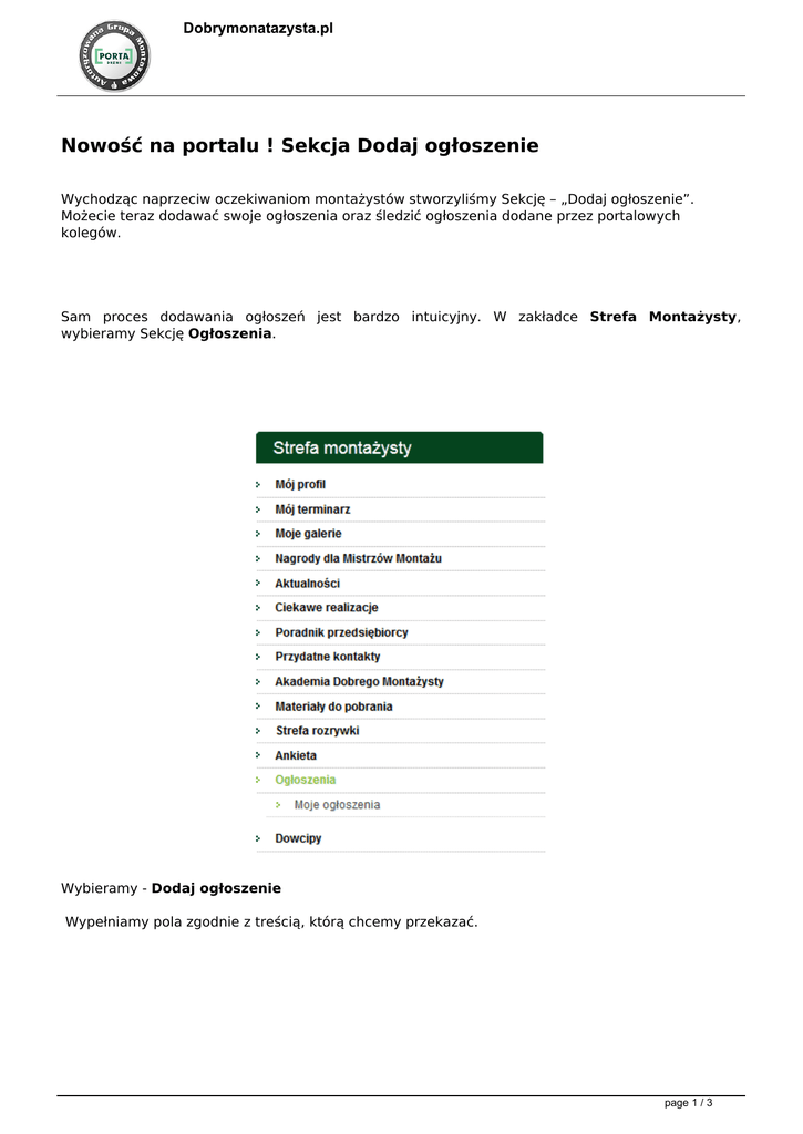 Dobrymonatazysta.pl Nowość na portalu ! Sekcja Dodaj ogłoszenie Wychodząc naprzeciw oczekiwaniom montażystów stworzyliśmy Sekcję – „Dodaj ogłoszenie”. Możecie teraz dodawać swoje ogłoszenia oraz śledzić ogłoszenia dodane przez portalowych kolegów. Sam proces dodawania ogłoszeń jest bardzo intuicyjny. W zakładce Strefa Montażysty, wybieramy Sekcję Ogłoszenia. Wybieramy - Dodaj ogłoszenie Wypełniamy pola zgodnie z treścią, którą chcemy przekazać. page 1 / 3 Dobrymonatazysta.pl Aby udało nam się prawidłowo dodać ogłoszenie, musimy wypełnić pola wymagane – czyli oznaczone czerwoną gwiazdką. Po zakończeniu wypełniania formularza – klikamy Zapisz. Nasze ogłoszenie zostanie wówczas dodane. page 2 / 3 Dobrymonatazysta.pl Jak podoba się Wam ta sekcja? Prosimy o Wasze komentarze i opinie. page 3 / 3
