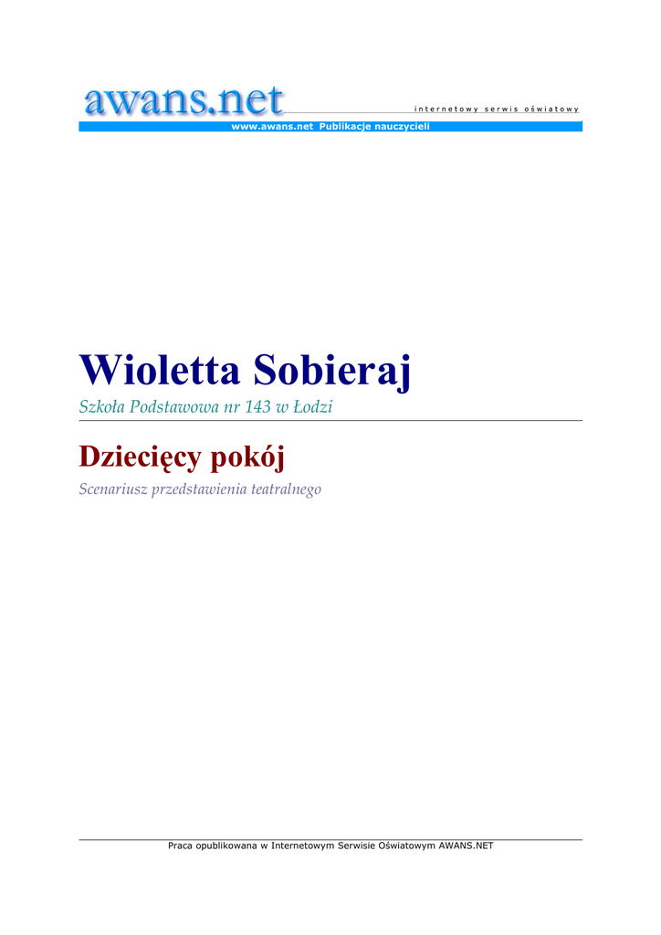 www.awans.net Publikacje nauczycieli Wioletta Sobieraj Szkoła Podstawowa nr 143 w Łodzi Dziecięcy pokój Scenariusz przedstawienia teatralnego Praca opublikowana w Internetowym Serwisie Oświatowym AWANS.NET DZIECIĘCY POKÓJ Scenariusz przedstawienia dedykowany szóstoklasistom, mieszczący się w nurcie ogólnopolskiej akcji „Cała Polska czyta dzieciom”, z powodzeniem zaprezentowany na wojewódzkim i ogólnopolskim przeglądzie teatrów dziecięcych w Łodzi (Konfrontacje 2003 i Dziatwa 2003). Zalety: dostosowany do poziomu 13 - latków, poruszający ich wyobraźnię i wrażliwość, zawierający ogromny ładunek poczucia humoru (zabawne postaci, dialogi i sytuacje), zmienny rytm, który po scenach dynamicznych pozwala widzom odetchnąć i chroni przed monotonią. Trochę o przedstawieniu (temat, idea, scenografia, kostiumy, muzyka) Przedstawienie jest adresowane do trzynastolatków opuszczających szkołę podstawową, którym bardzo marzy się świat ludzi dorosłych, wyzwolenie spod „tyranii" rodziców, nieskrępowana samodzielność, w której nurzają się jednak jak w za dużym ubraniu, ale pierwsze próby zaczynają już podejmować, zbierając bardzo cenne doświadczenie. Tym, co może im pomóc w rozpoznawaniu nowych sytuacji, w ocenieniu, co dla nich dobre i złe, są książki przeczytane w dzieciństwie, zawarte w nich proste prawdy, mądrzy i sympatyczni bohaterowie, których losy kiedyś tak bardzo ich wzruszały. I tak z pluszowym misiem w jednej ręce, drugą młody człowiek otwiera drzwi do dorosłości. O tym, co za nimi może spotkać i w czym znajdzie siłę do podniesienia się po dotkliwym „upadku”, jak nowe przeżycia zmieniają sposób patrzenia na rzeczywistość, traktuje ten scenariusz, który powstał pod wpływem obserwacji zachowań szóstoklasistów i prowadzonych z nimi rozmów. W trakcie pracy nad wystawieniem go na scenie towarzyszył mi jeden nadrzędny cel, aby nauczyć ich patrzenia na siebie z dystansem, panowania nad swoimi emocjami, szanowania w sobie dziecka, zamiast wylewania go z kąpielą, byle jak najszybciej i byle jak wkroczyć w mityczną dorosłość. Ważnym elementem była scenografia i kostiumy, przygotowane z szarego papieru. Wykonaliśmy dużą książkę, składającą się z trzech kartek, która po podniesieniu zagospodarowała niemal całą scenę. Na pierwszej stronie widniał tytuł przedstawienia, a po jej otwarciu ukazywał się pokój głównej bohaterki i budzące się ze snu baśniowe postacie lalki i misia, które opuszczają obrazki w książce, szeleszcząc papierowymi, nieco wygniecionymi strojami. Namalowane również na niej okno otwierało się na świat zewnętrzny, powiększając tym samym przestrzeń sceniczną. Na kolejnej stronie umieściliśmy lustro, przez które przechodziło się do nieznanego świata upragnionej dorosłości, gdzie wszystko jeszcze jest tajemnicze i obce, a powrót możliwy jedynie dzięki przyjaciołom z dzieciństwa i ich pomocnej dłoni. Na „dorosłych” stronach młodzi artyści dali upust swojemu twórczemu potecjałowi wymalowując graffitti. Na zakończenie książkę zamykano, a wtedy ukazywał się zarys dziewczyny i chłopaka, trzymających się za ręce, a w drugiej ręce dziewczynka trzymała symbolicznego misia. Myślę, że to dosyć ciekawa i oryginalna propozycja scenograficzna, uzupełniona wybranymi fragmentami z muzyki rockowej, takich zespołów jak: Black Sabbath, Led Zeppelin i Rush. Przedstawienie spodobało się na Wojewódzkim Przeglądzie Teatrów Dziecięcych w Łodzi w 2003 roku i zajęło drugie miejsce, otrzymując tym samym nominację do „Dziatwy”, czyli przeglądu ogólnopolskiego. O autorze Autorem scenariusza jest Wioletta Sobieraj, nauczycielka języka polskiego w Szkole Podstawowej nr 143 w Łodzi, która już od siedmiu lat prowadzi teatr szkolny „Zielono Mi”, pisząc teksty kolejnych przedstawień. Teatr z powodzeniem bierze udział w przeglądach, konkursach i festiwalach o zasięgu łódzkim, wojewódzkim i ogólnopolskim. Scenariusz przedstawienia Osoby: Kot I, II i III Grzbiet (książki) Strona I, II, III Słowo „Koniec” Miś Lalka Karolina Anita Paulina Adzio Mariusz (Na środku leży wielka papierowa księga, za nią stoi drabina, z której powoli schodzą trzy koty i skradają się ku owemu tajemniczemu przedmiotowi, bawiąc się i przepychając. Trwa to dłuższą chwilkę, podczas której uzewnętrzniają się różne kocie temperamenty. Gonią za piłeczką, która w końcy upada blisko książki.) Kot I Miauuu, coś tu leży. Kot II Ktoś zostawił nam książkę. Kot III Kto jest za tym, żeby zrobić z niej szałas? Kot II Łóżeczka, zdecydowanie łóżeczka! Kot III Mały, a ty co o tym myślisz? Kot I (Wskazuje na tytuł książki) Ja? Ja to samo co wy! Tu jest coś napisane. Kot II Gdybyśmy tak umiały czytać. . . Kot III Trzeba by mniej spać! Kot I To (litera „D”) wygląda jak duuuży brzuch. Kot III To „D”, na pewno, łatwizna! Kot II Nie miaucz mi nad uchem. Kot I Nie chciałbym wam przerywać tej miłej, kociej pogawędki, ale tu się coś rusza! (Wskazuje szeleszczącą książkę i w popłochu ucieka) Kot II A tam ktoś na nas patrzy. Kot III Koledzy, zmykajmy stąd! Kot II Zmykajmy zmykajmy, tam nas nikt nie ruszy. Kot I A pies sąsiadów?! (Słychać szczekanie) Miauuuu! (Koty wycofują się i sadowią na płocie, skąd obserwują to, co dzieje się na scenie. Podnosi się Grzbiet i wszystkie Strony, w których ukryty jest Miś z Lalką. ) Grzbiet Teatrzyk „Zielono Mi” ma zaszczyt zaprosić państwa do współnej lektury książki pt. „Dziecięcy pokój”. Strona I (Otwiera się) Ciii, nasi bohaterowie są bardzo płochliwi. (Podnoszą się Lalka z Misiem, prostują swoje pogniecione ubrania, Lalka kicha i wachluje się.) Lalka Nareszcie łyk świeżego powietrza, już myślałam, że się uduszę w uścisku tych milutkich karteczek. Chyba ktoś nas wziął do ręki. Muszę pop
