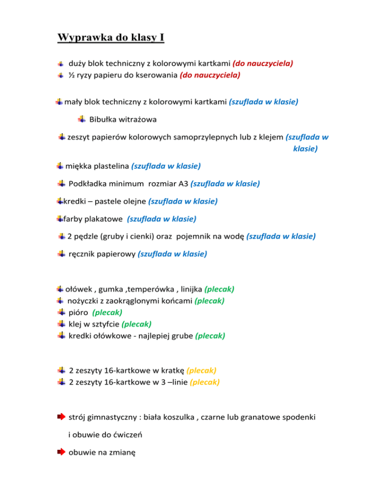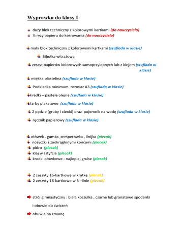 Wyprawka do klasy I duży blok techniczny z kolorowymi kartkami (do nauczyciela) ½ ryzy papieru do kserowania (do nauczyciela) mały blok techniczny z kolorowymi kartkami (szuflada w klasie) Bibułka witrażowa zeszyt papierów kolorowych samoprzylepnych lub z klejem (szuflada w klasie) miękka plastelina (szuflada w klasie) Podkładka minimum rozmiar A3 (szuflada w klasie) kredki – pastele olejne (szuflada w klasie) farby plakatowe (szuflada w klasie) 2 pędzle (gruby i cienki) oraz pojemnik na wodę (szuflada w klasie) ręcznik papierowy (szuflada w klasie) ołówek , gumka ,temperówka , linijka (plecak) nożyczki z zaokrąglonymi końcami (plecak) pióro (plecak) klej w sztyfcie (plecak) kredki ołówkowe ‐ najlepiej grube (plecak) 2 zeszyty 16‐kartkowe w kratkę (plecak) 2 zeszyty 16‐kartkowe w 3 –linie (plecak) strój gimnastyczny : biała koszulka , czarne lub granatowe spodenki i obuwie do ćwiczeń obuwie na zmianę