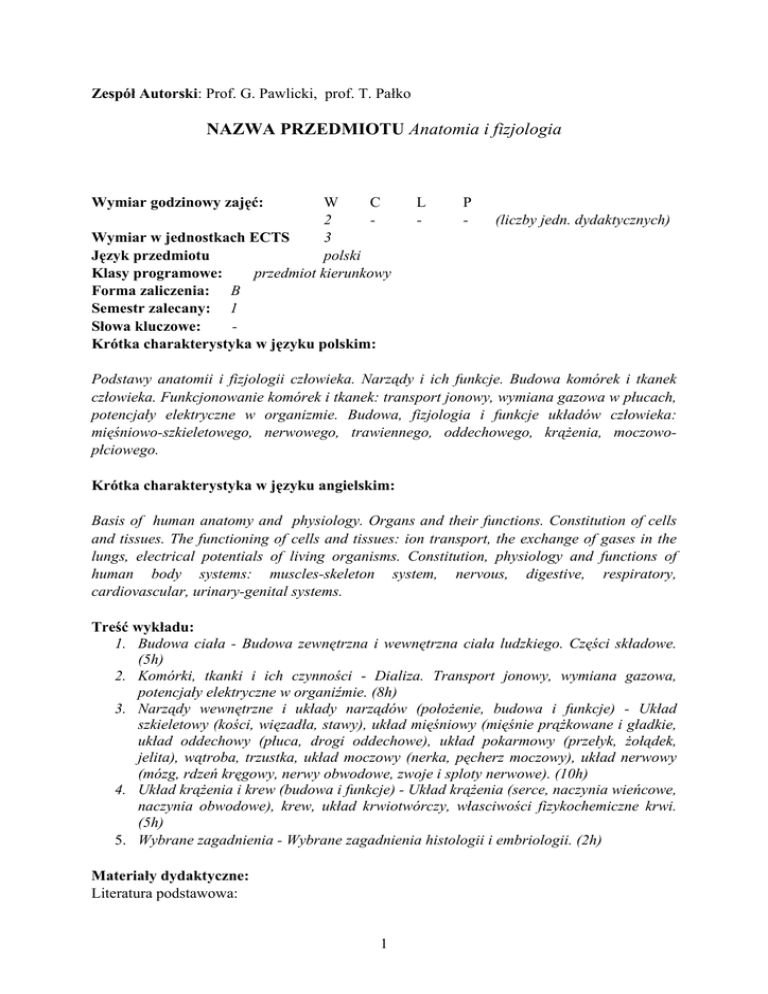 Zespół Autorski: Prof. G. Pawlicki, prof. T. Pałko NAZWA PRZEDMIOTU Anatomia i fizjologia Wymiar godzinowy zajęć: W C 2 Wymiar w jednostkach ECTS 3 Język przedmiotu polski Klasy programowe: przedmiot kierunkowy Forma zaliczenia: B Semestr zalecany: 1 Słowa kluczowe: Krótka charakterystyka w języku polskim: L - P - (liczby jedn. dydaktycznych) Podstawy anatomii i fizjologii człowieka. Narządy i ich funkcje. Budowa komórek i tkanek człowieka. Funkcjonowanie komórek i tkanek: transport jonowy, wymiana gazowa w płucach, potencjały elektryczne w organizmie. Budowa, fizjologia i funkcje układów człowieka: mięśniowo-szkieletowego, nerwowego, trawiennego, oddechowego, krążenia, moczowopłciowego. Krótka charakterystyka w języku angielskim: Basis of human anatomy and physiology. Organs and their functions. Constitution of cells and tissues. The functioning of cells and tissues: ion transport, the exchange of gases in the lungs, electrical potentials of living organisms. Constitution, physiology and functions of human body systems: muscles-skeleton system, nervous, digestive, respiratory, cardiovascular, urinary-genital systems. Treść wykładu: 1. Budowa ciała - Budowa zewnętrzna i wewnętrzna ciała ludzkiego. Części składowe. (5h) 2. Komórki, tkanki i ich czynności - Dializa. Transport jonowy, wymiana gazowa, potencjały elektryczne w organiźmie. (8h) 3. Narządy wewnętrzne i układy narządów (położenie, budowa i funkcje) - Układ szkieletowy (kości, więzadła, stawy), układ mięśniowy (mięśnie prążkowane i gładkie, układ oddechowy (płuca, drogi oddechowe), układ pokarmowy (przełyk, żołądek, jelita), wątroba, trzustka, układ moczowy (nerka, pęcherz moczowy), układ nerwowy (mózg, rdzeń kręgowy, nerwy obwodowe, zwoje i sploty nerwowe). (10h) 4. Układ krążenia i krew (budowa i funkcje) - Układ krążenia (serce, naczynia wieńcowe, naczynia obwodowe), krew, układ krwiotwórczy, własciwości fizykochemiczne krwi. (5h) 5. Wybrane zagadnienia - Wybrane zagadnienia histologii i embriologii. (2h) Materiały dydaktyczne: Literatura podstawowa: 1 1. W. Sylwanowicz, Anatomia człowieka, PZWL, Warszawa 1977. 2. Bochenek, Anatomia człowieka, PZWL Warszawa, 1990 3. W. Traczyk i A. Trzebski, Fizjologia człowieka z elementami fizjologii klinicznej. Wyd. 3, PZWL Warszawa, 2001 2