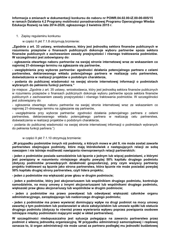Informacja o zmianach w dokumentacji konkursu do naboru nr POWR.04.02.00-IZ.00-00-005/15 w ramach Działania 4.2 Programy mobilności ponadnarodowej Programu Operacyjnego Wiedza Edukacja Rozwój na lata 2014-2020, ogłoszonego 2 kwietnia 2015 r. 1. Zapisy regulaminu konkursu w części II pkt 7.1.8 otrzymują brzmienie: „Zgodnie z art. 33 ustawy, wnioskodawca, który jest jednostką sektora finansów publicznych w rozumieniu przepisów o finansach publicznych dokonuje wyboru partnerów spoza sektora finansów publicznych z zachowaniem zasady przejrzystości i równego traktowania podmiotów. W szczególności jest zobowiązany do: - ogłoszenia otwartego naboru partnerów na swojej stronie internetowej wraz ze wskazaniem co najmniej 21-dniowego terminu na zgłaszanie się partnerów, - uwzględnienia przy wyborze partnerów: zgodności działania potencjalnego partnera z celami partnerstwa, deklarowanego wkładu potencjalnego partnera w realizację celu partnerstwa, doświadczenia w realizacji projektów o podobnym charakterze, - podania do publicznej wiadomości na swojej stronie internetowej informacji o podmiotach wybranych do pełnienia funkcji partnera.” (w miejsce: „Zgodnie z art. 35 ustawy, wnioskodawca, który jest jednostką sektora finansów publicznych w rozumieniu przepisów o finansach publicznych dokonuje wyboru partnerów spoza sektora finansów publicznych z zachowaniem zasady przejrzystości i równego traktowania podmiotów. W szczególności jest zobowiązany do: - ogłoszenia otwartego naboru partnerów na swojej stronie internetowej wraz ze wskazaniem co najmniej 21-dniowego terminu na zgłaszanie się partnerów, - uwzględnienia przy wyborze partnerów: zgodności działania potencjalnego partnera z celami partnerstwa, deklarowanego wkładu potencjalnego partnera w realizację celu partnerstwa, doświadczenia w realizacji projektów o podobnym charakterze, - podania do publicznej wiadomości na swojej stronie internetowej informacji o podmiotach wybranych do pełnienia funkcji partnera.”) w części II pkt 7.1.10 otrzymują brzmienie: „W przypadku podmiotów innych niż podmioty, o których mowa w pkt 9, nie może zostać zawarte partnerstwo obejmujące podmioty, które mają którekolwiek z następujących relacji ze sobą nawzajem i nie istnieje możliwość nawiązania równoprawnych relacji partnerskich: - jeden z podmiotów posiada samodzielnie lub łącznie z jednym lub więcej podmiotami, z którymi jest powiązany w rozumieniu niniejszego akapitu powyżej 50% kapitału drugiego podmiotu (dotyczy podmiotów prowadzących działalność gospodarczą), przy czym wszyscy partnerzy projektu traktowani są łącznie jako strona partnerstwa, która łącznie nie może posiadać powyżej 50% kapitału drugiej strony partnerstwa, czyli lidera projektu; - jeden z podmiotów ma większość praw głosu w drugim podmiocie; - jeden z podmiotów, który jest akcjonariuszem lub wspólnikiem drugiego podmiotu, kontroluje samodzielnie, na mocy umowy z innymi akcjonariuszami lub wspólnikami drugiego podmiotu, większość praw głosu akcjonariuszy lub wspólników w drugim podmiocie; - jeden z podmiotów ma prawo powoływać lub odwoływać większość członków organu administracyjnego, zarządzającego lub nadzorczego drugiego podmiotu; - jeden z podmiotów ma prawo wywierać dominujący wpływ na drugi podmiot na mocy umowy zawartej z tym podmiotem lub postanowień w akcie założycielskim lub umowie spółki lub statucie drugiego podmiotu (dotyczy to również prawa wywierania wpływu poprzez powiązania osobowe istniejące między podmiotami mającymi wejść w skład partnerstwa). W szczególności niedopuszczalna jest sytuacja polegająca na zawarciu partnerstwa przez podmiot z własną jednostką organizacyjną. W przypadku administracji samorządowej i rządowej oznacza to, iż organ administracji nie może uznać za partnera podległej mu jednostki budżetowej (nie dotyczy to jednostek nadzorowanych przez organ administracji oraz tych jednostek podległych organowi administracji, które na podstawie odrębnych przepisów mają osobowość prawną).” (w miejsce: W przypadku podmiotów innych niż podmioty, o których mowa w pkt 8, nie może zostać zawarte partnerstwo obejmujące podmioty, które mają którekolwiek z następujących relacji ze sobą nawzajem i nie istnieje możliwość nawiązania równoprawnych relacji partnerskich: - jeden z podmiotów posiada samodzielnie lub łącznie z jednym lub więcej podmiotami, z którymi jest powiązany w rozumieniu niniejszego akapitu powyżej 50% kapitału drugiego podmiotu (dotyczy podmiotów prowadzących działalność gospodarczą), przy czym wszyscy partnerzy projektu traktowani są łącznie jako strona partnerstwa, która łącznie nie może posiadać powyżej 50% kapitału drugiej strony partnerstwa, czyli lidera projektu; - jeden z podmiotów ma większość praw głosu w drugim podmiocie; - jeden z podmiotów, który jest akcjonariuszem lub wspólnikiem drugiego podmiotu, kontroluje samodzielnie, na mocy umowy z innymi akcjonariuszami lub wspólnikami drugiego podmiotu, większość praw głosu akcjonariuszy lub wspólników w drugim podmiocie; - jeden z podmiotów ma prawo powoływać lub odwoływać większość administracyjnego, zarządzającego lub nadzorczego drugiego podmiotu; członków organu - jeden z podmiotów ma prawo wywierać dominujący wpływ na drugi podmiot na mocy umowy zawartej z tym podmiotem lub postanowień w akcie założycielskim lub umowie spółki lub statucie drugiego podmiotu (dotyczy to również prawa wywierania wpływu poprzez powiązania osobowe istniejące między podmiotami mającymi wejść w skład partnerstwa). W szczególności niedopuszczalna jest sytuacja polegająca na zawarciu partnerstwa przez podmiot z własną jednostką organizacyjną. W przypadku administracji samorządowej i rządowej oznacza to, iż organ administracji nie może uznać za partn