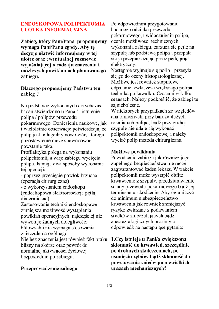 Po odpowiednim przygotowaniu badanego odcinka przewodu pokarmowego, uwidocznieniu polipa, Zabieg, który Pani/Pana proponujemy ocenie możliwości technicznych wykonania zabiegu, zarzuca się pętlę na wymaga Pani/Pana zgody. Aby tę szypułę lub podstawę polipa i przepala decyzję ułatwić informujemy w tej się ją przepuszczając przez pętlę prąd ulotce oraz ewentualnej rozmowie elektryczny. wyjaśniającej o rodzaju znaczeniu i możliwych powikłaniach planowanego Następnie wyjmuje się polip i przesyła się go do oceny histopatologicznej. zabiegu. Możliwe jest również stopniowe odpalanie, zwłaszcza większego polipa Dlaczego proponujemy Państwu ten techniką po kawałku. Czasami w kilku zabieg ? seansach. Należy podkreślić, że zabiegi te są niebolesne. Na podstawie wykonanych dotychczas W niektórych przypadkach ze względów badań stwierdzono u Pana / i istnienie anatomicznych, przy bardzo dużych polipa / polipów przewodu pokarmowego. Doniesienia naukowe, jak rozmiarach polipa, bądź przy grubej i wieloletnie obserwacje potwierdzają, że szypule nie udaje się wykonać polip jest to łagodny nowotwór, którego polipektomii endoskopowej i należy wyciąć polip metodą chirurgiczną. pozostawienie może spowodować powstanie raka. Możliwe powikłania Profilaktyka polega na wykonaniu Powodzenie zabiegu jak również jego polipektomii, a więc zabiegu wycięcia polipa. Istnieją dwa sposoby wykonania zupełnego bezpieczeństwa nie może zagwarantować żaden lekarz. W trakcie tej operacji: polipektomii może wystąpić obfite - poprzez przecięcie powłok brzucha krwawienie z szypuły, przedziurawienie (operacja chirurgiczna) ściany przewodu pokarmowego bądź jej - z wykorzystaniem endoskopu termiczne uszkodzenie. Aby ograniczyć (endoskopowa elektroresekcja pętlą do minimum niebezpieczeństwo diatermiczną). krwawienia jak również zmniejszyć Zastosowanie techniki endoskopowej ryzyko związane z podawaniem zmniejsza możliwość wystąpienia środków znieczulających bądź powikłań operacyjnych, najczęściej nie anestezjologicznych prosimy o wywołuje żadnych dolegliwości odpowiedź na następujące pytania: bólowych i nie wymaga stosowania znieczulenia ogólnego. Nie bez znaczenia jest również fakt braku 1.Czy istnieje u Pani/a zwiększona skłonność do krwawień, szczególnie blizny na skórze oraz powrót do po drobnych skaleczeniach, po normalnej aktywności życiowej usunięciu zębów, bądź skłonność do bezpośrednio po zabiegu. powstawania sińców po niewielkich urazach mechanicznych? Przeprowadzenie zabiegu ENDOSKOPOWA POLIPEKTOMIA ULOTKA INFORMACYJNA 1/2 Tak-nie 2.Czy takie objawy występowały wśród członków Państwa rodziny? Tak-nie 3. Czy występowały u Pani/a objawy uczulenia na jakiekolwiek środki spożywcze bądź lecznicze? tak-nie 4.Czy pobiera Pani /Pan leki wpływające na krzepliwość krwi (np. Aspiryna, Dicumarol itp.)? Tak-nie Postępowanie po badaniu W przypadku stosowania znieczulenia nie wolno jeść, ani pić przez okres 4h po zabiegu. Wystąpienie jakichkolwiek niejasnych dla Pani /Pana objawów należy niezwłocznie zgłosić pielęgniarce lub lekarzowi. Proszę pytać, jeśli Państwo nas nie zrozumieliście, albo jeśli chcecie wiedzieć więcej o tym badaniu, wymienionych wyżej powikłaniach bądź innych nurtujących problemach związanych z proponowanym zabiegiem. Oświadczenie pacjenta Wyrażam zgodę na wykonanie proponowanego zabiegu, jak również na ewentualne konieczne w tym przypadku dodatkowe zabiegi. Data Podpis Opracowała: lek. Med. Małgorzata Kondusz-Szklarz 2/2