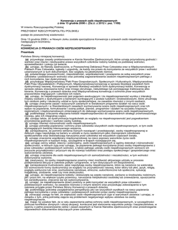 Konwencja o prawach osób niepełnosprawnych z dnia 13 grudnia 2006 r. (Dz.U. z 2012 r. poz. 1169) W imieniu Rzeczypospolitej Polskiej PREZYDENT RZECZYPOSPOLITEJ POLSKIEJ podaje do powszechnej wiadomości: Dnia 13 grudnia 2006 r. w Nowym Jorku została sporządzona Konwencja o prawach osób niepełnosprawnych, w następującym brzmieniu: Przekład KONWENCJA O PRAWACH OSÓB NIEPEŁNOSPRAWNYCH Preambuła Państwa Strony niniejszej konwencji, (a) przywołując zasady proklamowane w Karcie Narodów Zjednoczonych, które uznają przyrodzoną godność i wartość oraz równe i niezbywalne prawa wszystkich członków rodziny ludzkiej za podstawę wolności, sprawiedliwości i pokoju na świecie, (b) uznając, że Narody Zjednoczone, w Powszechnej Deklaracji Praw Człowieka oraz w Międzynarodowych Paktach Praw Człowieka, ogłosiły i uzgodniły, że każdy ma prawo do korzystania ze wszystkich praw i wolności ustanowionych w tych dokumentach, bez względu na jakiekolwiek różnice, (c) potwierdzając powszechność, niepodzielność, współzależność i powiązanie ze sobą wszystkich praw człowieka i podstawowych wolności oraz potrzebę zagwarantowania osobom niepełnosprawnym pełnego z nich korzystania, bez dyskryminacji, (d) przywołując Międzynarodowy Pakt Praw Gospodarczych, Społecznych i Kulturalnych, Międzynarodowy Pakt Praw Obywatelskich i Politycznych, Międzynarodową konwencję w sprawie likwidacji wszelkich form dyskryminacji rasowej, Konwencję w sprawie likwidacji wszelkich form dyskryminacji kobiet, Konwencję w sprawie zakazu stosowania tortur oraz innego okrutnego, nieludzkiego lub poniżającego traktowania albo karania, Konwencję o prawach dziecka oraz Międzynarodową konwencję o ochronie praw wszystkich pracowników migrujących i członków ich rodzin, (e) uznając, że niepełnosprawność jest pojęciem ewoluującym i że niepełnosprawność wynika z interakcji między osobami z dysfunkcjami a barierami wynikającymi z postaw ludzkich i środowiskowymi, które utrudniają tym osobom pełny i skuteczny udział w życiu społeczeństwa, na zasadzie równości z innymi osobami, (f) uznając znaczenie zasad i wytycznych zawartych w Światowym programie działań na rzecz osób niepełnosprawnych i w Standardowych zasadach wyrównywania szans osób niepełnosprawnych oraz ich wpływ na popieranie, formułowanie i ocenę polityk, planów, programów i działań na szczeblu krajowym, regionalnym i międzynarodowym zmierzających do dalszego wyrównywania szans osób niepełnosprawnych, (g) podkreślając znaczenie włączania kwestii niepełnosprawności do odpowiednich strategii zrównoważonego rozwoju, jako ich integralnej części, (h) uznając także, że dyskryminacja kogokolwiek ze względu na niepełnosprawność jest pogwałceniem przyrodzonej godności i wartości osoby ludzkiej, (i) uznając również różnorodność osób niepełnosprawnych, (j) uznając potrzebę popierania i ochrony praw człowieka wszystkich osób niepełnosprawnych, w tym osób wymagających bardziej intensywnego wsparcia, (k) zaniepokojone, że pomimo istnienia różnych rozwiązań i przedsięwzięć, osoby niepełnosprawnej w dalszym ciągu napotykają na bariery w udziale w życiu społecznym jako równoprawni członkowie społeczeństwa oraz doświadczają naruszania praw człowieka we wszystkich częściach świata, (l) uznając znaczenie współpracy międzynarodowej na rzecz poprawy warunków życia osób niepełnosprawnych w każdym kraju, szczególnie w krajach rozwijających się, (m) uznając cenny wkład, obecny i potencjalny, osób niepełnosprawnych w ogólny dobrobyt i różnorodność społeczności, w których żyją oraz uznając, że popieranie pełnego korzystania przez osoby niepełnosprawne z praw człowieka i podstawowych wolności, a także pełnego udziału osób niepełnosprawnych wzmocni ich poczucie przynależności i przyczyni się do rozwoju ludzkości oraz postępu społecznego i gospodarczego oraz wykorzenienia ubóstwa, (n) uznając znaczenie dla osób niepełnosprawnych ich samodzielności i niezależności, w tym wolności dokonywania wyborów, (o) zważywszy, że osoby niepełnosprawne powinny mieć możliwość aktywnego udziału w procesie podejmowania decyzji w zakresie polityki i programów, w tym dotyczących ich bezpośrednio, (p) zaniepokojone trudnościami, jakie napotykają osoby niepełnosprawne, które są narażone na wielorakie lub wzmocnione formy dyskryminacji ze względu na przynależność rasową, kolor skóry lub płeć, język, religię, poglądy polityczne lub inne, pochodzenie narodowe, etniczne, autochtoniczne lub społeczne, sytuację majątkową, urodzenie, wiek czy inne okoliczności, (q) uznając, że niepełnosprawne kobiety i dziewczęta są często narażone, zarówno w środowisku rodzinnym, jak i poza nim, na większe ryzyko przemocy, naruszania nietykalności osobistej lub znieważania, opuszczenia lub zaniedbywania, znęcania się lub wykorzystywania, (r) uznając, że niepełnosprawne dzieci powinny w pełni korzystać ze wszystkich praw człowieka i podstawowych wolności, na zasadzie równości z innymi dziećmi oraz przywołując zobowiązania w tym zakresie przyjęte przez Państwa Strony Konwencji o prawach dziecka, (s) podkreślając potrzebę uwzględniania perspektywy płci we wszystkich wysiłkach na rzecz popierania pełnego korzystania z praw człowieka i podstawowych wolności przez osoby niepełnosprawne, (t) zwracając uwagę na fakt, że większość osób niepełnosprawnych żyje w warunkach ubóstwa i uznając, w związku z tym, pilną potrzebę zajęcia się problemem negatywnego wpływu ubóstwa na osoby niepełnosprawne, (u) mając na uwadze fakt, że w celu zapewnienia pełnej ochrony osób niepełnosprawnych, w szczególności podczas konfliktów zbrojnych i obcej okupacji, konieczne jest stworzenie warunków pokoju i bezpieczeństwa, w oparciu o pełne poszanowanie celów i zasad zawart