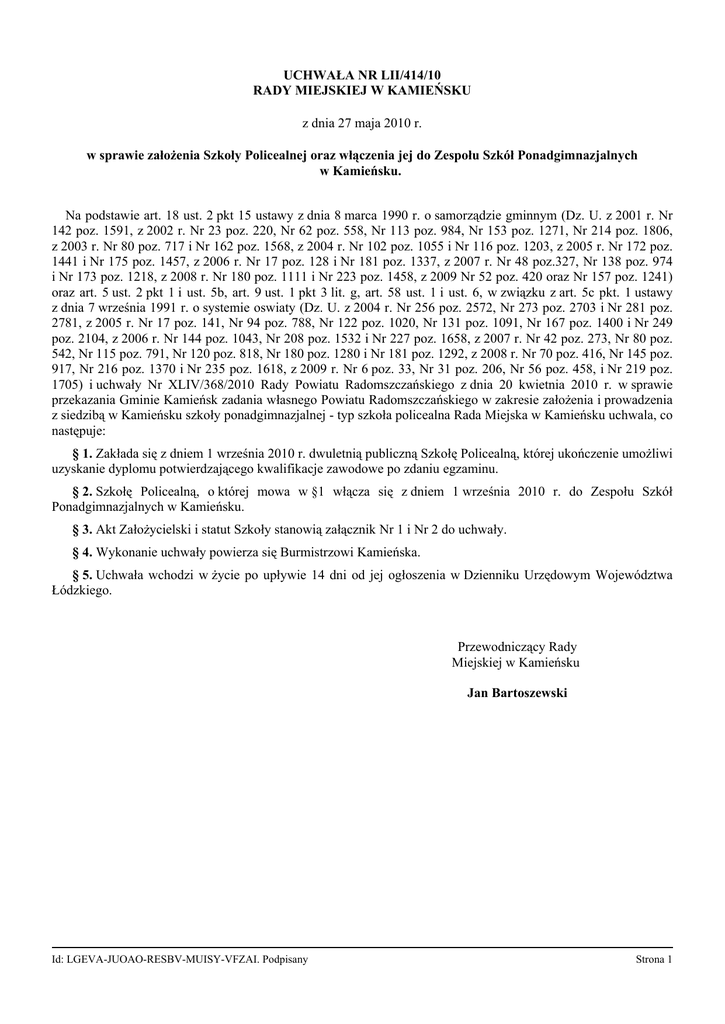 UCHWAŁA NR LII/414/10 RADY MIEJSKIEJ W KAMIEŃSKU z dnia 27 maja 2010 r. w sprawie założenia Szkoły Policealnej oraz włączenia jej do Zespołu Szkół Ponadgimnazjalnych w Kamieńsku. Na podstawie art. 18 ust. 2 pkt 15 ustawy z dnia 8 marca 1990 r. o samorządzie gminnym (Dz. U. z 2001 r. Nr 142 poz. 1591, z 2002 r. Nr 23 poz. 220, Nr 62 poz. 558, Nr 113 poz. 984, Nr 153 poz. 1271, Nr 214 poz. 1806, z 2003 r. Nr 80 poz. 717 i Nr 162 poz. 1568, z 2004 r. Nr 102 poz. 1055 i Nr 116 poz. 1203, z 2005 r. Nr 172 poz. 1441 i Nr 175 poz. 1457, z 2006 r. Nr 17 poz. 128 i Nr 181 poz. 1337, z 2007 r. Nr 48 poz.327, Nr 138 poz. 974 i Nr 173 poz. 1218, z 2008 r. Nr 180 poz. 1111 i Nr 223 poz. 1458, z 2009 Nr 52 poz. 420 oraz Nr 157 poz. 1241) oraz art. 5 ust. 2 pkt 1 i ust. 5b, art. 9 ust. 1 pkt 3 lit. g, art. 58 ust. 1 i ust. 6, w związku z art. 5c pkt. 1 ustawy z dnia 7 września 1991 r. o systemie oswiaty (Dz. U. z 2004 r. Nr 256 poz. 2572, Nr 273 poz. 2703 i Nr 281 poz. 2781, z 2005 r. Nr 17 poz. 141, Nr 94 poz. 788, Nr 122 poz. 1020, Nr 131 poz. 1091, Nr 167 poz. 1400 i Nr 249 poz. 2104, z 2006 r. Nr 144 poz. 1043, Nr 208 poz. 1532 i Nr 227 poz. 1658, z 2007 r. Nr 42 poz. 273, Nr 80 poz. 542, Nr 115 poz. 791, Nr 120 poz. 818, Nr 180 poz. 1280 i Nr 181 poz. 1292, z 2008 r. Nr 70 poz. 416, Nr 145 poz. 917, Nr 216 poz. 1370 i Nr 235 poz. 1618, z 2009 r. Nr 6 poz. 33, Nr 31 poz. 206, Nr 56 poz. 458, i Nr 219 poz. 1705) i uchwały Nr XLIV/368/2010 Rady Powiatu Radomszczańskiego z dnia 20 kwietnia 2010 r. w sprawie przekazania Gminie Kamieńsk zadania własnego Powiatu Radomszczańskiego w zakresie założenia i prowadzenia z siedzibą w Kamieńsku szkoły ponadgimnazjalnej - typ szkoła policealna Rada Miejska w Kamieńsku uchwala, co następuje: § 1. Zakłada się z dniem 1 września 2010 r. dwuletnią publiczną Szkołę Policealną, której ukończenie umożliwi uzyskanie dyplomu potwierdzającego kwalifikacje zawodowe po zdaniu egzaminu. § 2. Szkołę Policealną, o której mowa w §1 włącza się z dniem 1 września 2010 r. do Zespołu Szkół Ponadgimnazjalnych w Kamieńsku. § 3. Akt Założycielski i statut Szkoły stanowią załącznik Nr 1 i Nr 2 do uchwały. § 4. Wykonanie uchwały powierza się Burmistrzowi Kamieńska. § 5. Uchwała wchodzi w życie po upływie 14 dni od jej ogłoszenia w Dzienniku Urzędowym Województwa Łódzkiego. Przewodniczący Rady Miejskiej w Kamieńsku Jan Bartoszewski Id: LGEVA-JUOAO-RESBV-MUISY-VFZAI. Podpisany Strona 1 Załącznik Nr 1 do Uchwały Nr LII/414/10 Rady Miejskiej w Kamieńsku z dnia 27 maja 2010 r. Akt Założycielski Szkoły Policealnej w Kamieńsku Na podstawie art. 58 ust. 1 ustawy z dnia 7 września 1991 r. o systemie oswiaty (Dz. U. z 2004 r. Nr 256 poz. 2572, Nr 273 poz. 2703 i Nr 281 poz. 2781, z 2005 r. Nr 17 poz. 141, Nr 94 poz. 788, Nr 122 poz. 1020, Nr 131 poz. 1091, Nr 167 poz. 1400 i Nr 249 poz. 2104, z 2006 r. Nr 144 poz. 1043, Nr 208 poz. 1532 i Nr 227 poz. 1658, z 2007 r. Nr 42 poz. 273, Nr 80 poz. 542, Nr 115 poz. 791, Nr 120 poz. 818, Nr 180 poz. 1280 i Nr 181 poz. 1292, z 2008 r. Nr 70 poz. 416, Nr 145 poz. 917, Nr 216 poz. 1370 i Nr 235 poz. 1618, z 2009 r. Nr 6 poz. 33, Nr 31 poz. 206, Nr 56 poz. 458, i Nr 219 poz. 1705) : zakłada się z dniem 1 września 2010 r. SZKOŁĘ POLICEALNĄ Nazwa szkoły : Szkoła Policealna przy Zespole Szkół Ponadgimnazjalnych im. Tadeusza Kościuszki w Kamieńsku Siedziba szkoły : ul. Szkolna 4 97-360 Kamieńsk Typ szkoły : szkoła jest publiczną szkołą policealną kształcącą w zawodach : - technik administracji, - technik prac biurowych, - technik górnictwa odkrywkowego, - technik mechanik, o dwuletnim okresie nauczania. Przewodnicący Rady Miejskiej w Kamieńsku Jan Bartoszewski Id: LGEVA-JUOAO-RESBV-MUISY-VFZAI. Podpisany Strona 2 Załącznik Nr 2 do Uchwały Nr LII/414/10 Rady Miejskiej w Kamieńsku z dnia 27 maja 2010 r. Statut Szkoły Policealnej Rozdział 1. Ogólne informacje o Szkole § 1. 1. NAZWA SZKOŁY: Szkoła Policealna przy Zespole Szkół Ponadgimnazjalnych im. Tadeusza Kościuszki w Kamieńsku. 2. Nazwa Szkoły używana jest w pełnym brzmieniu. Na pieczęciach może być używany skrót nazwy 3. Siedzibą Szkoły jest miejscowość Kamieńsk, ul. Szkolna 4, powiat radomszczański, województwo łódzkie. 4. Szkoła prowadzi kształcenie w formie młodzieżowej. 5. Organem prowadzącym Szkołę jest Gmina Kamieńsk. 6. Organem sprawującym nadzór pedagogiczny jest Łódzki Kurator Oświaty. § 2. 1. Szkoła prowadzi kształcenie w następujących zawodach: 1) technik administracji symbol cyfrowy 343 [01] 2) technik prac biurowych symbol cyfrowy 419 [01] 3) technik górnictwa odkrywkowego symbol cyfrowy 311 [13] 4) technik mechanik symbol cyfrowy 311 [20] 2. Szkoła prowadzi kształcenie w systemie 2 letnim – 4 semestry. Rozdział 2. Cele i zadania szkoły § 3. Szkoła realizuje cele i zadania określone w ustawie o systemie oświaty oraz przepisach wydanych na jej podstawie, a w szczególności: 1. Umożliwia zdobycie wiedzy i umiejętności niezbędnych do uzyskania tytułu zawodowego, zwanego dalej "dyplomem", potwierdzającego kwalifikacje zawodowe. 2. Umożliwia słuchaczom zdobycie wybranego zawodu zgodnie ze standardami określonymi w podstawach programowych oraz zgodnie z ramowym i szkolnym planem nauczania. 3. Kształtuje środowisko wychowawcze sprzyjające realizowaniu celów i zasad określonych w ustawie oraz programie wychowawczym dostosowanym do potrzeb rozwojowych uczniów i potrzeb środowiska. 4. Wdraża program profilaktyki, promujący zdrowy styl życia. 5. Umożliwia rozwijanie i organizacyjnym. kultury pracy opartej na postępie technologicznym, ekonomicznym 6. Kształtuje etyczne postawy niezbędne do pełnienia funkcji zawodowych. 7. Wdraża słuchaczy do twórczego myślenia i podejmowania działań dla dobra ogólnoludzkiego. 8. Uczy aktywności w nauce i pracy oraz planowania własnej przyszłości. 9. Troszczy się o stałe 