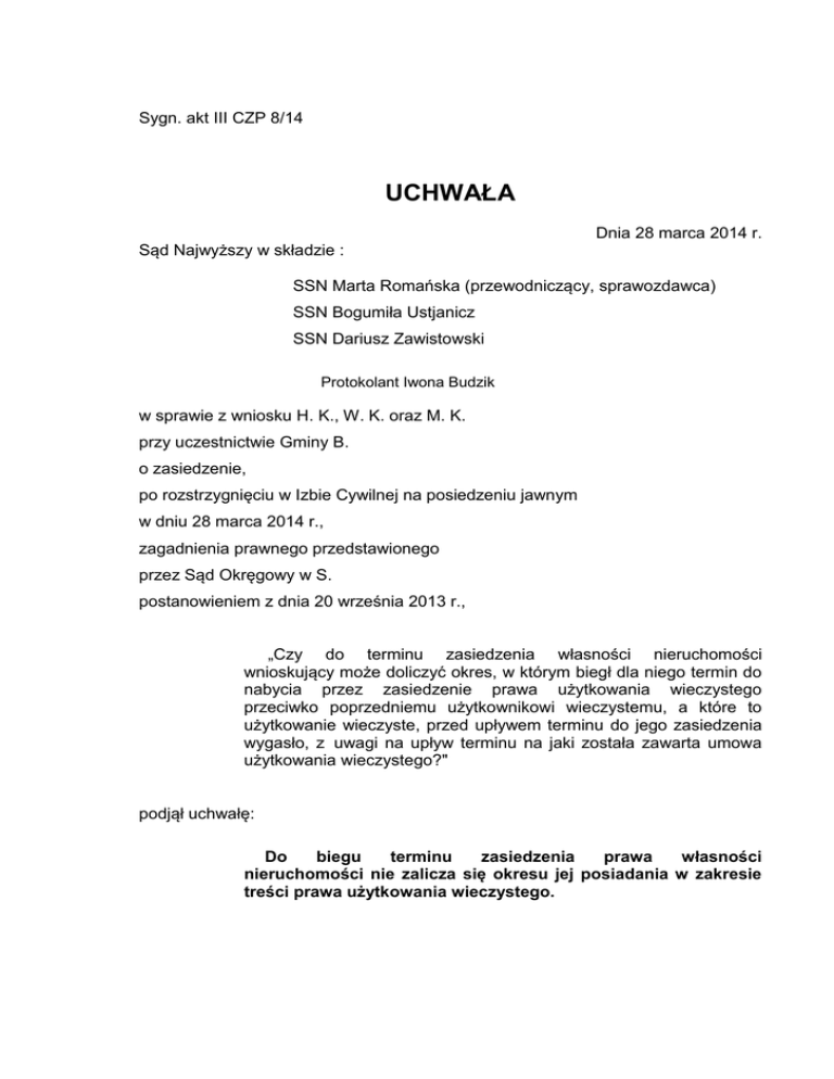 Sygn. akt III CZP 8/14 UCHWAŁA Dnia 28 marca 2014 r. Sąd Najwyższy w składzie : SSN Marta Romańska (przewodniczący, sprawozdawca) SSN Bogumiła Ustjanicz SSN Dariusz Zawistowski Protokolant Iwona Budzik w sprawie z wniosku H. K., W. K. oraz M. K. przy uczestnictwie Gminy B. o zasiedzenie, po rozstrzygnięciu w Izbie Cywilnej na posiedzeniu jawnym w dniu 28 marca 2014 r., zagadnienia prawnego przedstawionego przez Sąd Okręgowy w S. postanowieniem z dnia 20 września 2013 r., „Czy do terminu zasiedzenia własności nieruchomości wnioskujący może doliczyć okres, w którym biegł dla niego termin do nabycia przez zasiedzenie prawa użytkowania wieczystego przeciwko poprzedniemu użytkownikowi wieczystemu, a które to użytkowanie wieczyste, przed upływem terminu do jego zasiedzenia wygasło, z uwagi na upływ terminu na jaki została zawarta umowa użytkowania wieczystego?" podjął uchwałę: Do biegu terminu zasiedzenia prawa własności nieruchomości nie zalicza się okresu jej posiadania w zakresie treści prawa użytkowania wieczystego. 2 Uzasadnienie Wnioskodawczyni H. K. początkowo wniosła o stwierdzenie, że nabyła przez zasiedzenie z dniem 15 października 1985 r. zabudowaną nieruchomość gruntową stanowiącą działkę nr 309 w B., a w piśmie procesowym z 14 listopada 2012 r. wskazała, że prawem, które nabyła na tej drodze jest użytkowanie wieczyste nieruchomości gruntowej stanowiącej działkę nr 309 w B. oraz własność posadowionych na niej budynków. W razie przypisania jej złej wiary, wniosła o stwierdzenie, że do zasiedzenia doszło z dniem 2 października 2000 r. bądź z dniem 2 października 2005 r. Uczestnicy W. K. i M. K. poparli wniosek. Uczestniczka Gmina B. wniosła o oddalenie wniosku zarzucając, że wnioskodawczyni i jej maż W. K. byli traktowani jak użytkownicy wieczyści nieruchomości, której dotyczy wniosek i aż do 2000 r., uiszczali z tego tytułu należne opłaty. Uczestniczka wyjaśniła, że nie sprzeciwia się stwierdzeniu zasiedzenia prawa użytkowania wieczystego na rzecz H. K. i nie dąży do odebrania jej nieruchomości, a jedynie podejmowała szereg działań mających na celu skłonienie wnioskodawczyni do uregulowania jej stanu prawnego. Postanowieniem z 20 listopada 2012 r. Sąd Rejonowy w B. oddalił wniosek. Sąd ten ustalił, że w księdze wieczystej nr […], prowadzonej dla zabudowanej nieruchomości w B. przy ulicy L. 4-4a, stanowiącej działkę nr 309, o powierzchni 0,1800 ha, jako właściciel wpisana jest Gmina B., a jako użytkownicy wieczyści gruntu i właściciele posadowionych na nim budynków – A. K. i P. K., na prawach wspólności ustawowej małżeńskiej, na podstawie umowy z 3 lipca 1959 r. o oddaniu im gruntu w czasowe używanie (użytkowanie wieczyste) na okres 40 lat, tj. do 3 lipca 1999 r. Umową notarialną z 14 października 1974 r. A. K. i P. K. sprzedali użytkowanie wieczyste nieruchomości stanowiącej działkę nr 309 oraz własność posadowionych na niej budynków małżonkom W. K. i H. K., pod warunkiem, że ówczesny Urząd Powiatowy nie skorzysta z prawa pierwokupu. Do przeniesienia własności budynku mieszkalnego i gospodarczego oraz użytkowania wieczystego gruntu miało dojść w terminie dziesięciu dni po bezskutecznym upływie 3 trzymiesięcznego terminu do wykonania prawa pierwokupu przez Urząd Powiatowy, a wnioskodawczyni i jej mąż zadeklarowali, że znana jest im treść umowy o oddaniu nieruchomości w użytkowanie wieczyste sprzedającym i że przyjmują na siebie obowiązki uiszczania opłat rocznych z tytułu jej użytkowania wieczystego. Urząd Powiatowy w B. nie skorzystał z prawa pierwokupu nieruchomości będącej przedmiotem umowy, a 14 października 1974 r. sprzedający wydali ją w posiadanie kupujących. Od tego dnia kupujący byli traktowani jak użytkownicy wieczyści tej nieruchomości. 22 czerwca 1977 r. i 22 lipca 1980 r., W. K. wystąpił do Urzędu Miejskiego w B. o wydanie pozwolenia na budowę domu jednorodzinnego na działce nr 309, a 27 grudnia 1984 r. o wydanie pozwolenia na budowę wiaty usługowo magazynowej. Wnioski te zostały uwzględnione. Do 3 lipca 1999 r. Urząd Miejski w B. wydawał decyzje ustalające wysokość opłaty rocznej z tytułu użytkowania wieczystego nieruchomości i kierował je do W. i H. K., którzy opłaty te uiszczali. Umowami z 7 kwietnia 1998 r. W. K. i H. K. wyłączyli ustawową wspólność majątkową małżeńską i ustanowili pomiędzy sobą ustrój rozdzielności majątkowej oraz podzielili swój majątek wspólny. W. K. przeniósł na H. K. swój udział w prawie użytkowania wieczystego nieruchomości położonej przy ulicy L. w B. oraz własność posadowionych na niej budynków, zastrzegając, że nieruchomość ta ma nieuregulowany stan prawny, bowiem nie została sporządzona umowa przenosząca na rzecz małżonków prawo użytkowania wieczystego i własności budynków. Wnioskodawczyni 29 grudnia 2000 r. wystąpiła do Urzędu Miejskiego w B. o przekształcenie prawa użytkowania wieczystego nieruchomości w prawo jej własności. Gmina B. w 2005 r. zażądała od wnioskodawczyni kwoty 11.542,50 zł, jako wynagrodzenia za bezumowne korzystanie z nieruchomości, której dotyczy postępowanie, a jednocześnie poinformowała ją o stanie prawnym tej nieruchomości. Przedstawiony wyżej stan faktyczny pomiędzy stronami był bezsporny. W ocenie Sądu Rejonowego, wnioskodawczyni była posiadaczem samoistnym nieruchomości, której dotyczy wniosek w zakresie treści prawa użytkowania wieczystego do 3 lipca 1999 r. w złej wierze. Bieg terminu zasiedzenia rozpoczął 4 się na rzecz wnioskodawczyni z dniem zawarcia warunkowej umowy sprzedaży użytkowania wieczystego, tj. 14 października 1974 r. Dla nabycia tego prawa przez zasiedzenie wnioskodawczyni powinna wykonywać posiadanie przez 30 lat, gdyż krótsze terminy posiadania wymagane dla nabycia prawa przez zasiedzenie (tj. 10 i 20 lat), okreś