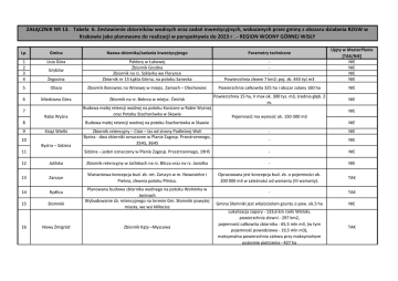 ZAŁĄCZNIK NR 13. Tabela 6. Zestawienie zbiorników wodnych oraz zadań inwestycyjnych, wskazanych przez gminy z obszaru działania RZGW w Krakowie jako planowane do realizacji w perspektywie do 2023 r . - REGION WODNY GÓRNEJ WISŁY Lp. Gmina Nazwa zbiornika/zadania inwestycyjnego Parametry techniczne 1 2 3 4 Lisia Góra Żegocina Poldery w Łukowej Zbiornik Grodna Zbiornik na rz. Szklarka we Florynce Zbiornik nr 15 Łąkta Górna, na potoku Sanecka Powierzchnia zlewni 7 km2; poj. zb. 443 tyś m3 Ujęty w MasterPlanie [TAK/NIE] NIE NIE NIE NIE 5 Obsza Zbiornik Borowiec na Wirowej w miejsc. Zamach – Olechowiec Powierzchnia całkowita 325 ha i obszar zalany 160 ha NIE 6 Miedziana Góra Zbiornik na rz. Bobrza w miejsc. Ćmińsk Powierzchnia 15 ha, V max ok. 300 tys. m3, średnia głęb. 2 m. NIE Grybów 7 Raba Wyżna 8 9 Budowa małej retencji wodnej na potoku Kosiczne w Rabie Wyżnej oraz Potoku Stachorówka w Skawie NIE Pojemność ma wynosić ok. 150-300 m3 Budowa małej retencji wodnej na potoku Stachorówka w Skawie Książ Wielki 10 Bystra – Sidzina 11 NIE Zbiornik retencyjny – Cisie – las od strony Podleśnej Woli Bystra - dwa zbiorniki oznaczone w Planie Zagosp. Przestrzennego, 35HS, 36HS - NIE - NIE Sidzina – jeden oznaczony w Planie Zagosp. Przestrzennego, 19HS - NIE 12 Jaśliska Zbiornik retencyjny w Jaśliskach na rz. Bilcza oraz na rz. Jasiołka - NIE 13 Zarszyn Wariantowa koncepcja bud. zb. ret. Zarszyn w m. Nowosielce i Pielnia, zlewnia potoku Pilnica. Opracowana jest koncepcja bud. zb. o pojemności ok. 200 000 m3 w zależności od wariantu (III warianty). TAK 14 Rydlica - TAK 15 Słomniki Gmina Słomniki jest właścicielem gruntu o pow. ok.5 ha NIE Lokalizacja zapory - 133,6 km rzeki Wisłoki, powierzchnia zlewni - 297 km2, pojemność całkowita zbiornika - 65,5 mln m3, (w tym pojemność powodziowa - 19,5 mln m3), maksymalna powierzchnia zalewu przy maksymalnym poziomie piętrzenia - 427 ha TAK 16 Nowy Żmigród Planowana budowa zbiornika wodnego na potoku Wolninka w Joninach Wybudowanie zb. retencyjnego na terenie Gm. Słomniki powyżej miasta, we wsi Miłocice Zbiornik Kąty –Myscowa 17 Grodzisko Dolne Pogłębienie i konserwacja istniejących zbiorników "małej retencji": zb. Wólka Grodziska (potok Leszczynka, pow. 0,41 ha), zb. Grodzisko Górne (potok Leszczynka, pow. 0,6 ha), zb. "Czyste" Grodzisko Dolne (potok Leszczynka, doprowadzalnik, pow. 8,05 ha) 18 Jarocin Budowa zbiornika retencyjnego w miejscowości Mostki - Jeże, zlokalizowanego przy prawym brzegu rzeki Gilówka Powierzchnia użytkowa ok.. 2,8 ha (odwód zb. 740 m, głębokość eksploatacyjna zb. 3,4m) NIE 19 Nowa Sarzyna Zbiornik retencyjny w miejscowości Jelna, na potoku Malinianka Powierzchnia ok. 3 ha NIE 20 21 Morawica Świlcza Budowa zbiornika wodnego w Bilczy Budowa zbiornika retencyjnego w Bratkowicach - NIE NIE Rozbudowa zbiornika wodnego Kowale w miejscowości Jeżowe - NIE Budowa zbiornika wodnego Sibigi w miejscowości Sibigi Drugi zbiornik wodny pitnej – Zagone – Kawcze (wodociągi Niepołomice) Zbiornik retencyjne indywidualne oraz suche zbiorniki jako zabezpieczenia przeciwpowodziowe Wykonanie studni przy ciekach powierzchniowych - Raba Budowa zbiorników retencyjnych wody pitnej 3 szt. Zbiornik wodny w miejscowości Jaworze Górne Zbiornik wodny w miejscowości Pilzno - NIE - NIE - NIE Pojemność 75 m3 Pojemność 1500 m3 NIE NIE NIE NIE - NIE 22 Jeżowe 23 24 Niepołomice 25 26 27 28 29 Mszana Dolna Zielonki Pilzno - NIE 30 Wiśniowa Na terenie gminy Wiśniowa planowana jest budowa zbiornika mokrego, zlokalizowanego przy ujściu Szufnarówki do Wisłoka, który jest ujęty w Syntezie Programu Małej Retencji Wodnej dla województwa podkarpackiego na lata 2000 - 2015, Główną jednostką odpowiedzialną za tą inwestycję jest Podkarpacki Zarząd Melioracji i Urządzeń Wodnych w Rzeszowie. 31 32 Narol Zbiornik retencyjny na cieku Krwawica Dwa zbiorniki na rzece Tanew Powierzchnia ok. 10 ha pojemość ok. 200000 m3 - NIE NIE 33 Raciechowice Zbiornik retencyjny na rzece Sawka Gmina posiada koncepcje przedmiotowego zbiornika. NIE 35 36 37 Harasiuki Jasło Zbiornik małej retencji na potoku Szczawnik w miejscowości Złockie Zbiornik małej retencji potoku Milik w miejscowości Milik Zbiornik retencyjny w Harasiukach przy rzece Tanew Zbiornik retencyjno –rekreacyjny ; Jasło 38 Skrzyszów Zbiornik retencyjny na potoku Korzeń w Skrzyszowie 34 Muszyna - NIE Rzeka Wisłoka Pow. - 45 ha, pojem. ok. 1 mln m3 NIE NIE NIE Teren przeznaczony pod w/w zbiornik wynosi 32,54 ha TAK 39 40 41 42 Zator Szerzyny Biłgoraj Budowa polderu w sołectwie Podolsze na potoku Łowiczanka Pojemność 145 000 m3 NIE Zbiornik w miejscowości Szerzyny Zbiornik w miejscowości Czermna Zbiornik wodny Brodziaki na Czarnej Ładzie Powierzchnia ok. 100 ha NIE NIE NIE 43 Łukowica Zbiornik w korytach potoków Słomka, Jarzębik, Łukowica oraz w terenach leśnych / Góra Ostra, Skiełek, Pępówka, Łyżka, Modyń Pojemność 100 m3 NIE 44 Strzyżów Zbiornik retencyjny na potoku Łętownia - NIE 45 m. Przeworsk Budowa zbiornika na granicy gminy Jawornik Polski i Kańczuga - NIE 46 Cieszanów Zbiornik retencyjny na rzece Brusienka w miejscowości Chotylub Powierzchnia 50 ha NIE Pojemność zb. 27600m3; pow. 2,3ha NIE - NIE Powierzchnia lustra wody ok. 50 ha Powierzchnia lustra wody ok. 15 ha Powierzchnia lustra wody ok. 20 ha NIE NIE NIE - NIE - NIE Pojemność ok. 70 tys. m3 - zasilenie z rzeki Mierzawa NIE 47 48 49 50 51 52 53 54 Zagospodarowanie zbiornika wodnego "'ANDRZEJÓWKA" na cieku wodnym Andrzejówka Budowa zbiornika retencyjnego na obszarze miejscowości Kolbuszowa Świerczów nazwa potoku Świerczówka Zbiornik retencyjny w miejscowości Żerniki Dolne Stopnica Zbiornik retencyjny w miejscowości Stopnica- Kąty Nowe Zbiornik retencyjny w miejscowości Czyżów Rekultywacja zbiorników istniejących w miejscowości Jerzmanowice - Przeginia Jerzmanowice i Gołkowice Budowa zbiornika małe