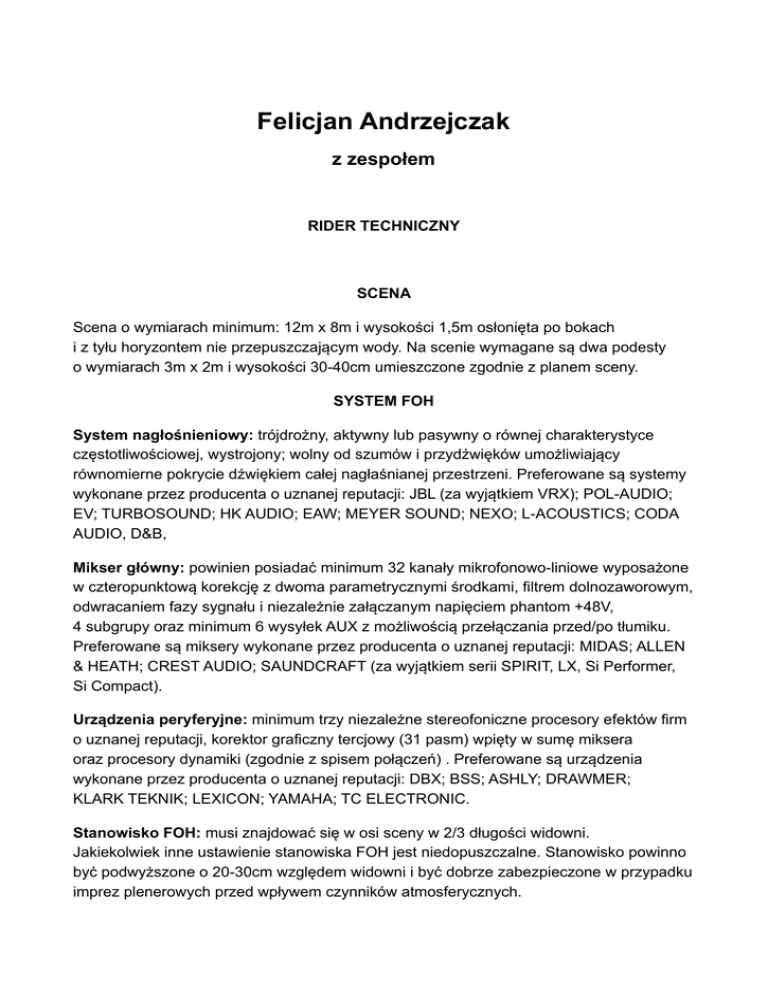 Felicjan Andrzejczak z zespołem RIDER TECHNICZNY SCENA Scena o wymiarach minimum: 12m x 8m i wysokości 1,5m osłonięta po bokach i z tyłu horyzontem nie przepuszczającym wody. Na scenie wymagane są dwa podesty o wymiarach 3m x 2m i wysokości 30-40cm umieszczone zgodnie z planem sceny. SYSTEM FOH System nagłośnieniowy: trójdrożny, aktywny lub pasywny o równej charakterystyce częstotliwościowej, wystrojony; wolny od szumów i przydźwięków umożliwiający równomierne pokrycie dźwiękiem całej nagłaśnianej przestrzeni. Preferowane są systemy wykonane przez producenta o uznanej reputacji: JBL (za wyjątkiem VRX); POL-AUDIO; EV; TURBOSOUND; HK AUDIO; EAW; MEYER SOUND; NEXO; L-ACOUSTICS; CODA AUDIO, D&B, Mikser główny: powinien posiadać minimum 32 kanały mikrofonowo-liniowe wyposażone w czteropunktową korekcję z dwoma parametrycznymi środkami, filtrem dolnozaworowym, odwracaniem fazy sygnału i niezależnie załączanym napięciem phantom +48V, 4 subgrupy oraz minimum 6 wysyłek AUX z możliwością przełączania przed/po tłumiku. Preferowane są miksery wykonane przez producenta o uznanej reputacji: MIDAS; ALLEN & HEATH; CREST AUDIO; SAUNDCRAFT (za wyjątkiem serii SPIRIT, LX, Si Performer, Si Compact). Urządzenia peryferyjne: minimum trzy niezależne stereofoniczne procesory efektów firm o uznanej reputacji, korektor graficzny tercjowy (31 pasm) wpięty w sumę miksera oraz procesory dynamiki (zgodnie z spisem połączeń) . Preferowane są urządzenia wykonane przez producenta o uznanej reputacji: DBX; BSS; ASHLY; DRAWMER; KLARK TEKNIK; LEXICON; YAMAHA; TC ELECTRONIC. Stanowisko FOH: musi znajdować się w osi sceny w 2/3 długości widowni. Jakiekolwiek inne ustawienie stanowiska FOH jest niedopuszczalne. Stanowisko powinno być podwyższone o 20-30cm względem widowni i być dobrze zabezpieczone w przypadku imprez plenerowych przed wpływem czynników atmosferycznych. SYSTEM MON System MON: wymagane jest osiem niezależnych torów odsłuchowych po dwa monitory typu wedge 12”+1” na każdy tor 1 i 2, pojedynczy monitor odsłuchowy na tor 3 oraz drumfill dla perkusisty, (w przypadku dużych scen wymagany jest system sidefill). System monitorowy powinien być wystrojony, wolny od sprzężeń, przydźwięków i zakłóceń, zapewniając tym samym pełną słyszalność na scenie dla wszystkich artystów przy maksymalnym wysterowaniu całego nagłośnienia (minimum 500W na pojedynczy monitor i minimum 1000W na odsłuch dla perkusisty). Akceptowalne są systemy odsłuchowe wykonane przez producenta o uznanej reputacji: JBL; POL-AUDIO; EV; TURBOSOUND; HK AUDIO; EAW; MEYER SOUND; NEXO; L-ACOUSTICS; CODA AUDIO. Stanowisko MON: musi znajdować się z boku sceny zapewniając realizatorowi ciągły kontakt z artystami. Niedopuszczalne jest ustawienie stanowiska MON na scenie lub w jej świetle. Wymagana jest obecność realizatora monitorowego biegle znającego cały przygotowany system FOH i MON oraz elektryka. Aparatura powinna być zainstalowana, uruchomiona, sprawdzona i skonfigurowana zgodnie z rider-em, a cały system przygotowany na około godzinę przed planowaną próbą dźwięku. Przed próbą zespołu scena musi być uprzątnięta, na scenie mogą znajdować się tylko urządzenia oraz osoby potrzebne do przeprowadzenia próby. Przed rozpoczęciem koncertu ze sceny muszą zostać usunięte wszystkie zbędne elementy techniki estradowej. Wymagany czas próby dźwięku wynosi 60 minut. UWAGI 1. Scena powinna być podwyższona w stosunku do widowni o minimum 1m; minimalne wymiary sceny powinny wynosić: 12m x 8m. Wymagane są dwa podesty pod perkusję i instrumenty klawiszowe, oba o wymiarach: 3m x 2m. 2. Cały system zasilania musi być prawidłowo uziemiony – dotyczy bezwzględnie wszystkich gałęzi zasilających! 3. W żadnym wypadku nie dopuszczalne jest używanie jakichkolwiek urządzeń i sprzętów wykonanych własnoręcznie. 4. Po zakończeniu próby dźwięku ustawienia instrumentów, mikrofonów i innych urządzeń scenicznych nie mogą być zmienione. 5. Rozmieszczenie sprzętu na scenie powinno być zgodne z planem sceny. 6. Firma zapewniająca nagłośnienie i zasilanie sprzętu muzyków na scenie ponosi pełną odpowiedzialność za bezpieczeństwo artystów, realizatorów, ekipy technicznej oraz sprzętu zespołu. 7. Jakiekolwiek zmiany w riderze prosimy uzgodnić z realizatorem! W przypadku większych scen, festiwali oraz koncertów event-owych zapotrzebowanie na sprzęt może ulec zmianie. Wymagana jest w takim przypadku konsultacja i zgoda realizatora dźwięku. Manager - Artur Przyszczypkowski tel. kontaktowy +48 602 234 494 [email protected] Koordynator koncertów - Tomasz Nagler tel. kontaktowy +48 601 135 214 [email protected]