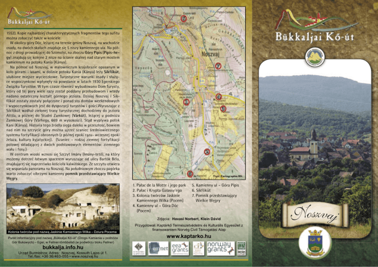1552). Kopie najbardziej charakterystycznych fragmentów tego sufitu można zobaczyć także w kościele. W okolicy góry Dóc, leżącej na terenie gminy Noszvaj, na wschodzie osady, na dwóch skałach znajduje się 5 niszy kamiennego ula. Na północ z drogi prowadzącej do Szomolyi, na zboczu Góry Pipis (Pipis-hegy) znajdują się kolejne 2 nisze na ścianie skalnej nad starym mostem kamiennym na potoku Kania (Kánya). Na północ od Noszvaj, w malowniczym krajobrazie opasanym w koło górami i lasami, w dolinie potoku Kania (Kánya) leży Síkfőkút, ulubione miejsce wycieczkowe. Turystyczne warunki osady i służące wypoczynkowi wpłynęły na powstanie w latach 1930 Egerskiego Związku Turystów. W tym czasie również wybudowano Dom Turysty, który od tej pory wiele razy został poddany przebudowom i wtedy nadano ostateczny kształt górnego jeziora. Dzisiaj Noszvaj i Síkfőkút zostały zostały połączone i ponad sto domów weekendowych i wypoczynkowych jest do dyspozycji turystów i gości.Wyruszając z Síkfőkút wzdłuż zielonej trasy turystycznej dochodzimy do jeziora Attila, a później do Studni Zamkowej (Várkút), leżącej u podnóża Zamkowej Góry (Várhegy, 669 m wysokości). Stąd wypływa potok Kani (Kánya). Historia tego źródła sięga daleko w przeszłość, bowiem nad nim na szczycie góry można ujrzeć szaniec średniowiecznego systemu fortyfikacji obronnych (z późnej epoki rązu- wczesnej epoki żelaza, kultury kyjatyckiej). (Szaniec – rodzaj ziemnej fortyfikacji polowej składającej z dwóch podstawowych elementów: ziemnego wału i fosy.) W centrum wioski wznosi się Szczyt Imány (Imány-tető), na który możemy dotrzeć łatwym spacerem wyruszając od ulicy Bartók Béla, znajdującej się naprzeciwko kościoła kalwińskiego. Ze szczytu otwiera się wspaniała panorama na Noszvaj. Na południowym zboczu pagórka warto zobaczyć olbrzymi kamienny pomnik przedstawiający Wielkie Węgry. Mapa: Cartographia Kft. 1. Pałac de la Motte i jego park 2. Pałac i Krypta Galassy’ego 3. Kolonia twórców Jaskinie Kamiennego Wilka (Pocem) 4. Kamienny ul – Góra Dóc (Pocem) 5. Kamienny ul – Góra Pipis 6. Síkfőkút 7. Pomnik przedstawiający Wielkie Węgry Zdjęcia: Havasi Norbert, Klein Dávid Kolonia twórców pod nazwą Jaskinie Kamiennego Wilka – Dziura Pocema Punkt informacyjny pod nazwą „Bükkaljai Kő-út” (Droga Kamienia u podnóża Gór Bukowych) – Eger, w Fellner-tömbbelső (w podwórzu bloku Fellner) bukkalja.info.hu Urząd Burmistrza; Adres: Noszvaj, Kossuth Lajos út 1. Tel./fax: +36 36/463-055 • www.noszvaj.hu Przygotował: Kaptárkő Természetvédelmi és Kulturális Egyesület z finansowaniem Norvég Civil Támogatási Alap www.kaptarko.hu Noszvaj N oszvaj leży 10 km od Egeru, na południowym zboczu Gór Bukowych, u podnóża Góry Zamku (Várhegy), w dolinie potoku Kania (Kánya). Pierwsze wzmianki o wiosce pochodzą z roku 1248 pod nazwą Nozuey. Wioska była własnością egerskiego biskupstwa do roku 1457, kiedy to biskup Rozgonyi Péter ofiarowł Noszvaj zakonnikom kartuzianom w zamian za co otrzymał wioskę Felsőtárkány i Bükkzsérc. W czasie oblężenia Egeru w roku 1552 Turcy zupełnie spalili Kościół Kalwiński w Noszvaju wioskę. Pod koniec panowania tureckiego, około roku 1680 wieś przeszła na własnośc egerskiego tureckiego handlarza, który z tego powodu przybrał nazwisko Noszvay Ferenc. W roku 1782 wioska dostała się w posiadanie baronowej Vécsey Anny (wdowy Almásy’ego Antala) i jej drugiego męża, markiza francuskiego pochodzenia, pułkownika cesarskiego de la Motte. Ostatnia przebudowa pałacu De la Motte w stylu prostego rokoko jest związana z ich nazwiskiem. Budowę pałacu zaczął Szepessy Sámuel między 1775 a 1779 rokiem, ale z powodu zadłużenia nie zdołał jej zakończyć. Po śmierci markiza de la Motte w roku 1800 budynek w drodze dziedziczenia przechodzi na 5 dzieci Vécsey Anny z jej pierwszego małżeństwa i został we władaniu rodziny Almásy’ego aż do roku 1852, gdy egerski handlowiec Steinhauser István go zakupił. Porzez małżeństwo córki Steinhausera, pałac dostał się we władanie rodziny Galassy’ego. Budynek będący dziś pod ochroną zabytków odnowiono między 1958 a 1960 rokiem. Pałac otacza 9 hektarowy angielski park, Pałac de la Motte Rząd piwnic w Noszvaju Część Dziury Pocema w którym możemy podziwiac nadzwyczajne gatunki drzew i ozdobne krzewy, np: cis, dąb szypułkowy „Fastigiata” i magnolia. Pałac Galassy’ego budowany w roku 1900 w stylu późno eklektycznym znajdujący się między Noszvajem i Szomolyą, który spłonął w roku 1953 ale w roku 1959 odbudowano go i uczyniono zeń dom wczasowy. Po drugiej stronie drogi, na wschód od budynku, w zboczu pagórka mieści się drążona w tufie krypta Galassy’ego. Osada jest nieodłącznym elementem historycznego egerskiego regionu winiarskiego. Okolice Noszvaj uważane są za jeden z najlepiej uprawianych obszarów winiarskich w okolicy Egeru. Wioska jest dumna z dwóch znanych winniarstw: jedną jest posiadłość rodziny Thummerera, gdzie mieści się ponad stuletni, dworski system piwnic o pow. 2000 m2, który poszerzono w roku 2004 o dalsze 2200 m2. Druga to będący pod ochroną zabytków dom gospodarczy hrabiowskiej rodziny Almásy’ego (piwnica i spichlerz) wybudowany w roku 1790. Stare piwnice winiarskie mieszkańcy do dnia dzisiejszego używają do celów gospodarczych. Piwnice te znajdują się w różnych częściach wioski. Te należące do bogatszych gospodarzy znajdują się na początku ulicy Szomolyai,w dwóch rzędach, podczas gdy będące własnością uboższych znajdują się w zachodnim i wschodnim zboczu pagórka Nagyimányi. W południowo-wschodniej części wioski znajdują się wydrążone w tufie mieszkania jaskiniowe. Obszar zanajdujący sie w bezpośrednim sąsiedztwie wzgórza nazywano w minionych wiekach Obszarem Kamiennego Wilka (Farkas
