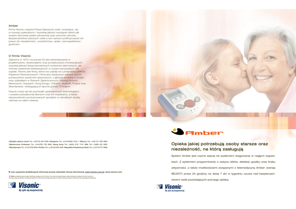Amber Firma Visonic wspiera Prawa Starszych osób i poświęca się w rozwoju opłacalnych i wysokiej jakości rozwiązań takich jak system domowej opieki zdrowotnej oraz ochronie zdrowia, bezpieczeństwa starszych osób a tym samym podtrzymywać ich prawo do niezależności, uczestnictwa, opieki, samospełnienia i godności. O firmie Visonic Założona w 1972 ma ponad 32 lata doświadczenia w projektowaniu, doskonaleniu oraz produkowaniu innowacyjnych, wysokiej jakości bezprzewodowych systemów alarmowych, jak również systemów lokalizacyjnych w czasie rzeczywistym dla szpitali. Visonic jest firmą, która ma udziały na Londyńskiej Giełdzie Papierów Wartościowych. Firma jest światowym liderem wśród producentów systemów alarmowych, z główną siedzibą w Izraelu oraz oddziałami w Stanach Zjednoczonych, Wielkiej Brytanii, Niemczech, Hiszpanii, Hong Kongu, Chinach, Australii, Polsce oraz Skandynawii, obsługujących łącznie ponad 70 krajów. Visonic może się też pochwalić sprawdzonymi technologiami i uwadze poświęconej klientom oraz ich wspieraniu, a także niezawodności produkowanych sprzętów w ośrodkach służby zdrowia na całym świecie. •Siedziba główna Izrael Tel.: (+972-3) 645 6789 •Hiszpania Tel.: (+34-91)659 3120 • •Niemcy Tel.: (+49) 211 600 6960 •Zjednoczone Królestwo Tel.: (+44-870) 730 0800 •Hong Kong Tel.: (+852) 2157 7147 USA Tel.: (+860) 243 0833 •Skandynawia Tel.: (+47) 6758 9843 •Polska Tel.: (+48-22) 639 3436 •Republika Południowej Afryki Tel.: (+27) 84 577 8668 Opieka jakiej potrzebują osoby starsze oraz niezależność, na którą zasługują System Amber jest czymś więcej niż systemem reagowania w nagłych wypadkach. Z systemem przypominania o zażyciu leków, detekcji upadku oraz braku aktywności, a także możliwościami związanymi z telemedycyną Amber (wersja W celu uzyskania dodatkowych informacji proszę odwiedzić stronę internetową: www.visonic.com.pl, www.visonic.com są zarejestrowanymi znakami handlowymi należącymi do firmy Visonic Ltd. Amber są zarejestrowanymi znakami handlowymi należącymi do firmy Visonic Ltd. Inne nazwy stanowią własność ich odnośnych właścicieli. Firma Visonic zastrzega sobie prawo do zmiany informacji lub danych technicznych bez uprzedniego powiadomienia. SELECT) przez 24 godziny na dobę 7 dni w tygodniu czuwa nad bezpieczeństwem osób pozostających pod jego opieką. Wspieranie bezpieczeństwa w starzejącym się świecie Społeczeństwo na świecie starzeje się. Już teraz na świecie jest 600 milionów ludzi powyżej 60 roku życia. Szacuje się, że liczba ta podwoi się do roku 2025 (Światowa Organizacja Zdrowia wyszła z inicjatywą by sprostać potrzebom gwałtownie starzejącej się ludności, 6 września 2004, Genewa). W samej Europie więcej niż 25 milionów ludzi osiągnęło wiek 80 lat w roku 2005, a do 2020 liczba ta wzrośnie prawie do 36 milionów (United Nation). Starzenie się ludności oznacza, że ludzie żyją dłużej, ich styl życia jest bardziej dynamiczny, ale im dłużej żyją tym bardziej jest prawdopodobne, że wystąpią u nich problemy związane z poruszaniem się, równowagą oraz pamięcią. Dodatkowo zwiększa się proporcja osób starszych nad pracującymi. Jeśli chcemy sprostać potrzebom osób starszych i potrzebujących teraz i w przyszłości, musimy znaleźć sposoby, by zadbać o ich bezpieczeństwo i zdrowie, a przy tym wziąć pod uwagę najbardziej ekonomiczne rozwiązanie. To dlatego wprowadzamy nowy projekt jakim jest Amber. Prezentowany przez firmę Visonic - lidera w branży security, oferuje opłacalny sposób pomocy osobom starszym by mogli cieszyć się dobrą opieką i niezależnością, na która zasługują. System pomocy w nagłych wypadkach ……. oraz dużo więcej: Ergonomiczny, atrakcyjny, łatwy w instalacji i utrzymaniu projekt niesie wiele istotnych korzyści: Detekcja upadku (eliminuje niebezpieczeństwo upadku przez powiadamianie odpowiedniej osoby) Przypomnienie o zażyciu leków (zmniejsza ryzyko przedawkowania lub niedoboru leków; powiadomienia głosowe punktualnie przypominają użytkownikom o zażyciu leków; `guzik kontrolny` rejestruje zgodność) Bezpieczeństwo w domu osobista ochrona dzięki detektorom dymu, zalania, czadu (zapobiega potencjalnym wypadkom przez wykrycie sytuacji zagrażających życiu) Wskaźnik zalania Szybkie wybieranie numeru (przechowuje do 3 numerów szybkiego wybierania) Detektor upadku Amber jest świetnym rozwiązaniem dla właścicieli ośrodków (służby) zdrowia, którzy ochraniają i dbają o osoby starsze: Opłacalny, niezawodny i bardzo tani w utrzymaniu Bardzo łatwy w instalacji Zaprojektowany by spełniać wiele funkcji – od detekcji w nagłych wypadkach do całkowitego nadzoru stanu Łatwo przystosowujący się do potrzeb każdego użytkownika Uaktualniany przez telefon, niepotrzebna wizyta technika Łatwość w użyciu Ambera i jego zdolności przystosowawcze sprawiają, iż jest on świetnym pomocnikiem w różnych otoczeniach takich jak Domy opieki, Domy pielęgnacyjne Sanatoria Szpitale Firmy monitorujące Szybkie połączenie z prywatnymi numerami Przycisk potwierdzenia Status LED Wezwanie pomocy Możliwość podłączenia urządzeń telemedycznych umożliwiających pomiar: ciśnienia krwi, tętna, poziomu cukru, cholesterolu (wersja SELECT) Całkowita ochrona domu (na miejscu lub na odległość – umożliwia użytkownikowi lub innym osobom otworzyć drzwi, odsłonić żaluzje, zapalić światła włączyć i wyłączyć urządzenia jedynie za pomocą naciśnięcia guzika) Wskaźnik dymu Łatwy w użyciu, funkcjonalny, niskie koszty utrzymania Dwukierunkowa komunikacja w której ręce są wolne Monitoring braku aktywności (monitoruje zaprogramowane czynności takie jak wstanie z łóżka lub poruszanie się, wysyła alarm jeśli taka aktywność nie wystąpi w określonym czasie, tym samym wskazuje na potrzebę interwencji) Wskaźnik gazu 