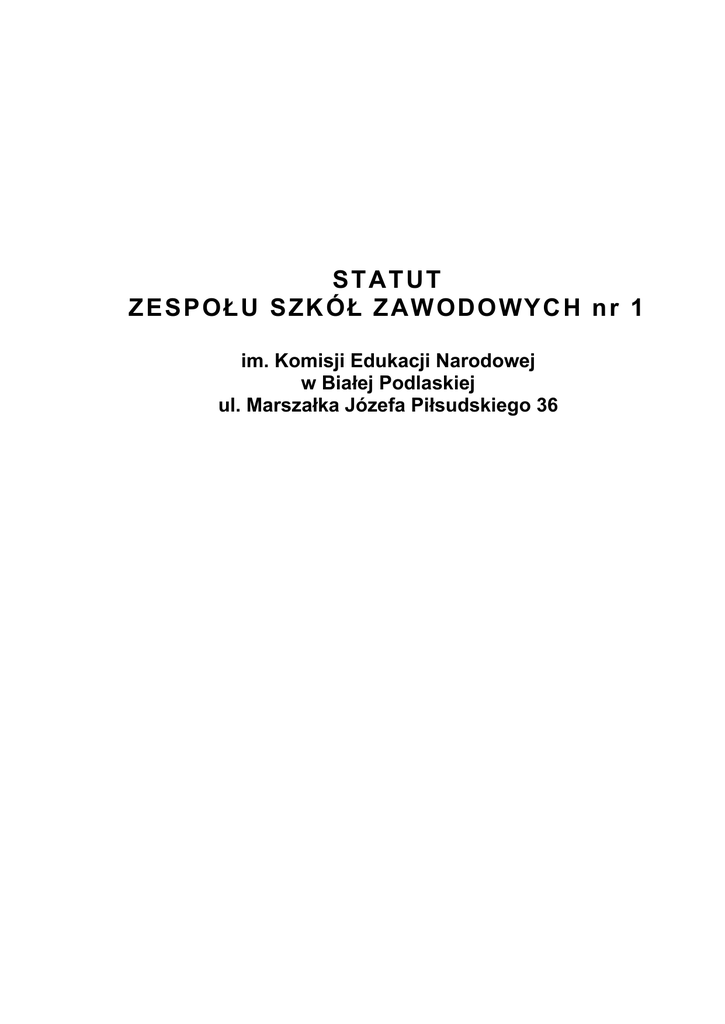 S TATUT Z ES P O ŁU S ZKÓ Ł ZAWO DO WY CH nr 1 im. Komisji Edukacji Narodowej w Białej Podlaskiej ul. Marszałka Józefa Piłsudskiego 36 Zespół Szkół Zawodowych nr 1 w Białej Podlaskiej STATUT SZKOŁY Podstawa prawna: 1. Ustawa z dnia 7 września 1991r. o systemie oświaty. /Dz. U. z 2016r. poz. 35, z późn. zm./ 2. Ustawa z dnia 26 stycznia 1982 r. – Karta Nauczyciela. /Dz. U. z 2016r. poz.668 z późn. zm./ 3. "Konwencja o Prawach Dziecka" przyjęta przez Zgromadzenie ONZ dnia 20 listopada 1989r. ratyfikowana przez Polskę 30 kwietnia 1991r. /Dz. U. z 1991r. Nr 120, poz. 526, z późn. zm./ 4. Rozporządzenie MEN z dnia 21 maja 2001r. w sprawie ramowych statutów publicznego przedszkola oraz publicznych szkół. /Dz. U. z 2007r. Nr 35, poz. 222, z późn. zm./ 5. Rozporządzenie MEN z dnia 10 czerwca 2015r. w sprawie szczegółowych warunków i sposobu oceniania, klasyfikowania i promowania uczniów i słuchaczy w szkołach publicznych. /Dz. U. z 2015r. poz. 843, z późn. zm./ 6. Rozporządzenie MEN z dnia 25 czerwca 2015r. w sprawie szczegółowych warunków i sposobu przeprowadzania sprawdzianu, egzaminu gimnazjalnego i egzaminu maturalnego. /Dz. U. z 2015r. poz. 959, z późn. zm./ 7. Rozporządzenie MEN z dnia 7 października 2009r. w sprawie wymagań wobec szkół i placówek. /Dz. U. z 2015r. poz. 1214/ 8. Rozporządzenie MEN z dnia 28 maja 2010r. w sprawie świadectw, dyplomów państwowych i innych druków szkolnych. /Dz. U. z 2015r. poz. 23, z późn. zm./ 9. Rozporządzenie MEN z dnia 30 kwietnia 2013r. w sprawie zasad udzielania i organizacji pomocy psychologiczno – pedagogicznej w publicznych przedszkolach, szkołach i placówkach. /Dz. U. z 2013r. poz. 532/ 10. Rozporządzenie MEN z dnia 27 sierpnia 2012r. w sprawie podstawy programowej wychowania przedszkolnego oraz kształcenia ogólnego w poszczególnych typach szkół. /Dz.U. z 2014r. poz. 803, z późn. zm./ 11. Rozporządzenie MEN z dnia 7 lutego 2012r. w sprawie podstawy programowej kształcenia w zawodach. /Dz. U. z 2012r., poz. 184, z późn. zm./ 12. Rozporządzenie MEN z dnia 7 lutego 2012r. w sprawie ramowych planów nauczania w szkołach publicznych. /Dz. U. z 2012r., poz 204, z późn. zm / 13. Rozporządzenie MEN z dnia 23 grudnia 2011r. w sprawie klasyfikacji zawodów szkolnictwa zawodowego. /Dz. U. z 2012r., poz 7, z późn. zm./ 14. Rozporządzenie MEN z dnia 11 stycznia 2012r. w sprawie kształcenia ustawicznego w formach pozaszkolnych. /Dz. U. z 2014r., poz 622, z późn. zm./ 2 Zespół Szkół Zawodowych nr 1 w Białej Podlaskiej STATUT SZKOŁY Spis treści Księga pierwsza. CZĘŚĆ OGÓLNA. Rozdział I Organizacja Zespołu Szkół Zawodowych nr 1. .......................... 4 Rozdział II Inne informacje o Zespole Szkół Zawodowych nr 1…………….5 Rozdział III Cele i zadania szkoły. ................................................................ 9 Rozdział IV Organy szkoły. ......................................................................... 15 Rozdział V Organizacja szkoły. .................................................................. 26 Rozdział VI Nauczyciele i inni pracownicy szkoły. ...................................... 34 Rozdział VII Uczniowie szkoły. .................................................................... 42 Rozdział VIII Szczegółowe warunki i sposób wewnątrzszkolnego oceniania 52 Rozdział IX Gospodarka finansowa. ........................................................... 82 Rozdział X Postanowienia końcowe. ......................................................... 83 Księga druga. ZAŁĄCZNIKI. Załącznik nr 1 Organizacja szkół dla dorosłych Załącznik nr 2 Formy opieki i pomocy materialnej dla uczniów Załącznik nr 3 Uchylony Załącznik nr 4 Uchylony Załącznik nr 5 Szczegółowa organizacja internatu Załącznik nr 6 Uchylony 3 Zespół Szkół Zawodowych nr 1 w Białej Podlaskiej STATUT SZKOŁY Rozdział I ORGANIZACJA ZESPOŁU SZKÓŁ ZAWODOWYCH NR 1 IM. KOMISJI EDUKACJI NARODOWEJ W BIAŁEJ PODLASKIEJ §1 1. Zespół działa pod nazwą: Zespół Szkół Zawodowych nr 1 im. Komisji Edukacji Narodowej w Białej Podlaskiej ul. Marszałka Józefa Piłsudskiego 36. 2. W skład Zespołu Szkół Zawodowych nr 1 im. Komisji Edukacji Narodowej w Białej Podlaskiej zwanego dalej „Zespołem Szkół Zawodowych nr 1” wchodzą następujące typy szkół: 1) 2) 3) 4) technikum, zasadnicza szkoła zawodowa, szkoła policealna, liceum ogólnokształcące. 3. Nazwy szkół wchodzących w skład Zespołu Szkół Zawodowych nr 1: 1) Technikum nr 1 w Zespole Szkół Zawodowych nr 1 im. Komisji Edukacji Narodowej w Białej Podlaskiej 2) Zasadnicza Szkoła Zawodowa nr 1 w Zespole Szkół Zawodowych nr 1 im. Komisji Edukacji Narodowej w Białej Podlaskiej 3) Zespół Szkół Zawodowych nr 1 im. Komisji Edukacji Narodowej Szkoła Policealna Zaoczna w Białej Podlaskiej 4) III Liceum Ogólnokształcące dla Dorosłych w Zespole Szkół Zawodowych nr 1 im. Komisji Edukacji Narodowej w Białej Podlaskiej 4. W skład zespołu wchodzi placówka pod nazwą Centrum Kształcenia Ustawicznego w Białej Podlaskiej, działająca na podstawie statutu nadanego uchwałą. 5. W Zespole Szkół Zawodowych nr 1 działają internat i warsztaty szkolne. 6. Dodatkowo organizację szkół dla dorosłych określa załącznik nr 1 do Statutu. 4 Zespół Szkół Zawodowych nr 1 w Białej Podlaskiej Rozdział II INNE STATUT SZKOŁY INFORMACJE O ZESPOLE SZKÓŁ ZAWODOWYCH NR 1 §2 Siedziba Zespołu Szkół Zawodowych nr 1 mieści się przy ulicy Marszałka Józefa Piłsudskiego 36 w Białej Podlaskiej. §3 Ilekroć w statucie jest mowa o szkole, należy rozumieć wszystkie szkoły wchodzące w skład Zespołu Szkół Zawodowych nr 1 - wymienione w §1. §4 W Zespole Szkół Zawodowych nr 1 kształci się młodzież w systemie stacjonarnym i zaocznym. §5 1. Organem prowadzącym szkoły ponadgimnazjalne jest Gmina Miejska Biała Podlaska miasto na prawach pow
