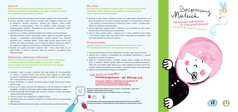 Zatrucie Plac zbaw Dzieci uwielbiają wkładać różne przedmioty do buzi. Im są starsze i bardziej samodzielne, łatwiej udaje im się sięgać i „smakować” rzeczy, które wyglądem przypominają im słodycze. Plac zabaw dla maluchów jest miejscem, gdzie zawierają swoje pierwsze znajomości. Ważne, żeby towarzyszyć dziecku w poznawaniu placu zabaw i nowych towarzyszy przygód. Trzymaj wszystkie leki zamknięte na klucz lub poza zasięgiem rąk i wzroku dziecka. Trzymaj wszystkie środki chemiczne wysoko poza zasięgiem dziecka lub, jeśli to konieczne, zamontuj bezpieczne zatrzaski przy drzwiach niskich szafek, w których je przechowujesz. Staraj się wybierać środki czyszczące, które zawierają gorzkie składniki. Nieprzyjemny smak pomoże w uchronieniu dziecka przed połknięciem ich zawartości. Upewnij się, że zakrętki i pokrywki nieużywanych butelek są mocno zakręcone. Zamontuj specjalne alarmy wykrywające tlenek węgla we wszystkich pomieszczeniach z urządzeniami wykorzystującymi otwarty płomień (np. bojlerami gazowymi) lub z otwartym ogniem. Tlenek węgla (inaczej zwany czadem) jest trucizną. Nie możesz go zobaczyć, nie ma smaku ani zapachu. Upewnij się również, że urządzenia są regularnie serwisowane, a wentylacja w domu jest drożna. Sprawdź swój ogród pod kątem trujących roślin i naucz swoje dzieci, by nie jadły niczego, co zerwą na zewnątrz, zanim nie zostanie to sprawdzone przez kogoś dorosłego. Skaleczenia, uderzenia i stłuczenia Dziecięca ciekawość otaczającego je świata nie ma granic. Elementem dorastania są małe skaleczenia, upadki czy stłuczenia – musimy jednak zabezpieczyć nasze mieszkanie tak, aby dziecko np. upadając nie wyrządziło sobie krzywdy. Zabezpiecz meble w swoim mieszkaniu tak, żeby dziecko ich nie przewróciło, np. zdejmij z parapetu kwiaty, które maluch może ściągnąć na siebie. Dbaj, by dziecko nie próbowało podciągać się przy półce na książki czy innych meblach, które może przewrócić na siebie. Używaj ochraniaczy na narożniki chroniących głowę Twojego dziecka przed ostrymi kantami mebli. Staraj się nie używać obrusów lub zabezpiecz je tak, by dziecko nie mogło ich pociągnąć – szczególnie wtedy, gdy na stole znajdują się gorące potrawy i napoje. Używaj specjalnego bezpiecznego szkła do szyb w drzwiach i oknach albo pokryj pok szyby warstwą zabezpieczającą. Trzymaj scyzoryki, noże i golarki poza zasięgiem dziecka. Zabezpiecz drzwi (np. specjalnym stoperem), by Twoje dziecko nie przytrzasnęło rzasnęło sobie palców. Zabezpiecz kontakty, by dziecko nie mogło w nie włożyć palców czy jakiś przedmiotów. miotów. Sprawdź, czy plac zabaw, z którego korzystasz, jest odpowiednio zabezpieczony: czy piasek w piaskownicy nie służy za toaletę zwierzętom, czy zamontowane huśtawki i inne sprzęty są modernizowane (te informacje możesz uzyskać u zarządcy placu zabaw, np. wspólnoty mieszkaniowej). Zawsze bądź obok swojego dziecka – obserwuj, czy nie próbuje np. zjeść piasku, kamieni, kasztanów znalezionych w piaskownicy. Jeśli już Twoje dziecko chodzi – towarzysz mu w czasie zwiedzania placu zabaw – jest jeszcze bardzo małe, więc starsze dzieci mogą łatwo je przewrócić, może też zostać uderzone huśtawką czy bujakiem. W samochodzie Zgodnie z prawem w czasie jazdy samochodem dzieci zawsze muszą być w specjalnych fotelikach – nawet podczas krótkich podróży. Zawsze używaj fotelika, który jest odpowiedni do wieku, wagi i wzrostu dziecka. Upewnij się, że fotelik w samochodzie jest prawidłowo zamocowany, a dziecko bezpiecznie przypięte do siedzenia. Nigdy nie umieszczaj fotelika, w którym dziecko siedzi, przodem do kierunku jazdy, na przednim siedzeniu pasażera, gdzie zamontowana jest poduszka powietrzna. Może ona zranić dziecko, kiedy otworzy się w czasie wypadku lub stłuczki. Zanim zainstalujesz fotelik lub gondolkę w samochodzie – przeczytaj uważnie instrukcję obsługi. Nigdy nie zostawiaj dziecka samego w samochodzie! : Jeśli doszło do wypadku wezwij pogotowie - tel. 999 lub 112 Zachęcamy rodziców i opiekunów do zapoznania się z zasadami udzielania pierwszej pomocy. Zapraszamy na stronę www.dobryrodzic.pl Wydawca: Fundacja Dzieci Niczyje w ramach programu „Dobry Rodzic – Dobry Start” Copyright © 2010 Fundacja Dzieci Niczyje Publikacja ja zost została dofinansowana ze środków Urzędu m.st. Warszawy Ulotka powstała na bazie ins inspiracji wydawcitwami Child Accident Preventi on Trust (2007). K Kon Konsultacje sultacje merytoryczne: Andrzej And Bocheński, Projekt graficzny: Ewa Brejnakowska–Jończyk Jak ochronić małe dziecko mii?? (0–3 lat) przed urazam Wskazówki dla ro dziców i opiekunów Małe dzieci są kruche i delikatne – każdego dnia wiele maluchów trafia do szpitala z powodu różnych urazów. Do wielu z nich dochodzi w domu, ponieważ to tam dzieci spędzają najwięcej czasu. Większości wypadków można uniknąć – dowiedz się, jak możesz uchronić swoje dziecko przed niebezpieczeństwem. Upadki Małe dzieci uczą się nowych rzeczy niezwykle szybko: wiercą się, kopią, przekręcają się z pleców na brzuszek, mogą sturlać się z łóżeczka czy z przewijaka. Uczą się raczkować, wspinać na różne rzeczy, ryzykując upadek. To naturalny proces, który pozwala im na rozwój i poznawanie otoczenia. Możesz zadbać o to, by Twój Maluch nie zrobił sobie krzywdy podczas tych podróży. Zmieniaj dziecku pieluszkę na podłodze. Dziecka poniżej 1. roku życia nie zostawiaj nawet na chwilę samego na łóżku, kanapie czy przewijaku, ponieważ może się z niego sturlać. Nie kładź dziecka w kołysce lub foteliku na stole lub kuchennym blacie – kołysząc się, może przesunąć się i spaść. Używaj tych sprzętów tylko na podłodze. Gdy dziecko zacznie raczkować, zainstaluj odpowiednie bramki zabezpieczające, aby zapobiec wspinaniu się dziec