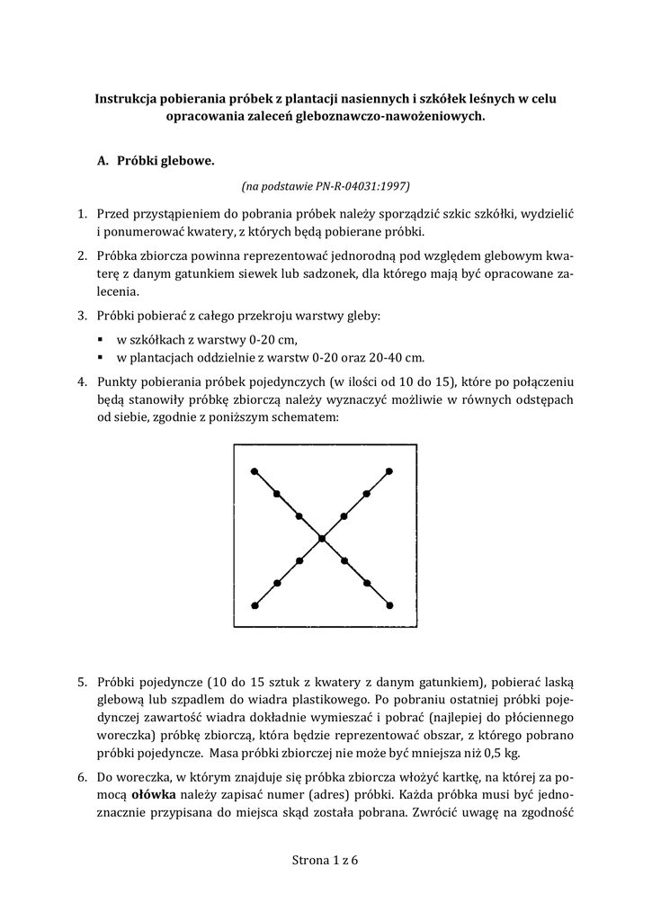 Instrukcja pobierania próbek z plantacji nasiennych i szkółek leśnych w celu opracowania zaleceń gleboznawczo-nawożeniowych. A. Próbki glebowe. (na podstawie PN-R-04031:1997) 1. Przed przystąpieniem do pobrania próbek należy sporządzić szkic szkółki, wydzielić i ponumerować kwatery, z których będą pobierane próbki. 2. Próbka zbiorcza powinna reprezentować jednorodną pod względem glebowym kwaterę z danym gatunkiem siewek lub sadzonek, dla którego mają być opracowane zalecenia. 3. Próbki pobierać z całego przekroju warstwy gleby: w szkółkach z warstwy 0-20 cm, w plantacjach oddzielnie z warstw 0-20 oraz 20-40 cm. 4. Punkty pobierania próbek pojedynczych (w ilości od 10 do 15), które po połączeniu będą stanowiły próbkę zbiorczą należy wyznaczyć możliwie w równych odstępach od siebie, zgodnie z poniższym schematem: 5. Próbki pojedyncze (10 do 15 sztuk z kwatery z danym gatunkiem), pobierać laską glebową lub szpadlem do wiadra plastikowego. Po pobraniu ostatniej próbki pojedynczej zawartość wiadra dokładnie wymieszać i pobrać (najlepiej do płóciennego woreczka) próbkę zbiorczą, która będzie reprezentować obszar, z którego pobrano próbki pojedyncze. Masa próbki zbiorczej nie może być mniejsza niż 0,5 kg. 6. Do woreczka, w którym znajduje się próbka zbiorcza włożyć kartkę, na której za pomocą ołówka należy zapisać numer (adres) próbki. Każda próbka musi być jednoznacznie przypisana do miejsca skąd została pobrana. Zwrócić uwagę na zgodność Strona 1 z 6 oznaczeń zawartych na kartce i na szkicu szkółki, na którym należy zaznaczyć miejsce pobrania próbki zbiorczej i wpisać jej numer. Uwaga: próbek nie należy pobierać: na obrzeżach pola do 5m w miejscach po stogach i kopcach w rowach, bruzdach, kretowiskach i żwirowiskach w zagłębieniach i ostrych wzniesieniach terenu(w razie potrzeby z tych miejsc pobrać dodatkowe próbki). 7. Próbki gleby należy zabezpieczyć tak, aby w czasie transportu lub przesyłki do laboratorium nie uległy uszkodzeniu, zanieczyszczeniu lub wzajemnemu wymieszaniu. 8. Próbki wraz z kopią szkicu, na którym zaznaczono miejsca ich pobrania oraz z protokołem pobierania próbek, stanowiącym załącznik nr 1, należy w jak najkrótszym terminie dostarczyć osobiście lub za pomocą kuriera na adres: Instytut Badawczy Leśnictwa Samodzielna Pracownia Chemii Środowiska Leśnego ul. Braci Leśnej 3 05-090 Sękocin Stary Tel. 22 715 05 10, 715 05 11, fax 22 715 05 39 Strona 2 z 6 B. Próbki materiału roślinnego (na podstawie Rautio P, Fürst A, Stefan K, Raitio H, Bartels U, 2010: Sampling and Analysis of Needles and Leaves. 19 pp. Manual Part XII. In: Manual on methods and criteria for harmonized sampling, assessment, monitoring and analysis of the effects of air pollution on forests, UNECE, ICP Forests Programme Co-ordinating Centre, Hamburg). Organy asymilacyjne drzew z plantacji nasiennych. 1. Przed przystąpieniem do pobrania próbek należy sporządzić szkic plantacji, wydzielić i ponumerować jednogatunkowe kwatery, z których będą pobierane próbki. 2. Na kwaterze plantacji nasiennej zajętej przez dany gatunek wybrać 5-10 drzew reprezentujących cały obszar. Wybrane drzewa zaznaczyć na szkicu plantacji. 3. Z wysokości 1/3 górnej części korony każdego wytypowanego drzewa pobierać tzw. próbki pojedyncze igieł bieżącego rocznika lub liści, zwracając uwagę, aby: pobierać organy asymilacyjne ze wszystkich czterech stron świata, pobierać tylko organy asymilacyjne rosnące przy dostępie do światła, w przypadku gatunków iglastych pobierać próbki z 7 – 15 okółka. 4. Termin pobierania próbek: z gatunków liściastych i Mo – druga połowa sezonu wegetacyjnego, ale przed początkiem jesiennego żółknięcia, z gatunków iglastych – okres spoczynku (późna jesień, zima). 4. Masa próbek pojedynczych powinna wynosić około 200 g świeżej masy. 5. Próbki pojedyncze połączyć w próbkę zbiorczą i umieścić ją w woreczku płóciennym lub w torbie papierowej, dołączając kartkę, na której za pomocą ołówka należy zapisać numer (adres) próbki. Każda próbka musi być jednoznacznie przypisana do miejsca skąd została pobrana. Zwrócić uwagę na zgodność oznaczeń zawartych na kartce i na szkicu plantacji, na którym należy zaznaczyć miejsce pobrania próbki zbiorczej i wpisać jej numer. 6. Próbki organów asymilacyjnych należy zabezpieczyć tak, aby w czasie transportu lub przesyłki do laboratorium nie uległy uszkodzeniu, zanieczyszczeniu lub wzajemnemu wymieszaniu. Siewki (sadzonki) ze szkółek leśnych. 1. W przypadku, gdy siewki (sadzonki) drzew w szkółce leśnej są w złej kondycji zalecenia gleboznawczo-nawożeniowe opracowuje się na podstawie badania próbek gleby oraz próbek siewek (sadzonek). 2. Przed przystąpieniem do pobrania próbek należy sporządzić szkic szkółki, wydzielić i ponumerować kwatery, z których będą pobierane próbki. Strona 3 z 6 3. Próbki siewek (sadzonek) należy pobierać, wybierając całe rośliny (razem z systemem korzeniowym), z miejsc gdzie obserwuje się objawy niedoboru lub nadmiaru składników pokarmowych oraz (jeżeli to możliwe) z miejsc gdzie rośliny nie wykazują takich objawów. 4. Po pobraniu próbki roślin umieścić w woreczku płóciennym lub w torbie papierowej, dołączając kartkę, na której za pomocą ołówka należy zapisać numer (adres) próbki oraz jej stan (sadzonki uszkodzone/sadzonki nieuszkodzone). Każda próbka musi być jednoznacznie przypisana do miejsca skąd została pobrana. Zwrócić uwagę na zgodność oznaczeń zawartych na kartce i na szkicu szkółki, na którym należy zaznaczyć miejsce pobrania próbki i wpisać jej numer. 5. Próbki należy zabezpieczyć tak, aby w czasie transportu lub przesyłki do laboratorium nie uległy uszkodzeniu, zanieczyszczeniu lub wzajemnemu wymieszaniu. 6. Próbki wraz z kopią 