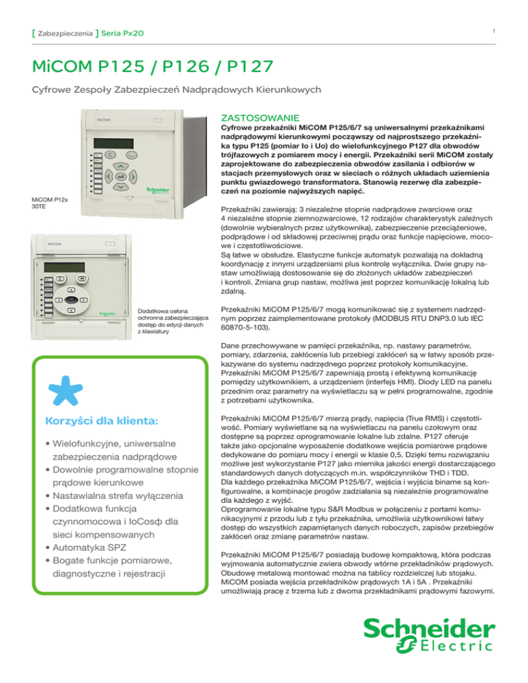 [ Zabezpieczenia ] Seria Px20 1 MiCOM P125 / P126 / P127 Cyfrowe Zespoły Zabezpieczeń Nadprądowych Kierunkowych ZASTOSOWANIE Cyfrowe przekaźniki MiCOM P125/6/7 są uniwersalnymi przekaźnikami nadprądowymi kierunkowymi począwszy od najprostszego przekaźnika typu P125 (pomiar Io i Uo) do wielofunkcyjnego P127 dla obwodów trójfazowych z pomiarem mocy i energii. Przekaźniki serii MiCOM zostały zaprojektowane do zabezpieczenia obwodów zasilania i odbiorów w stacjach przemysłowych oraz w sieciach o różnych układach uziemienia punktu gwiazdowego transformatora. Stanowią rezerwę dla zabezpieczeń na poziomie najwyższych napięć. MiCOM P12x 30TE Przekaźniki zawierają: 3 niezależne stopnie nadprądowe zwarciowe oraz 4 niezależne stopnie ziemnozwarciowe, 12 rodzajów charakterystyk zależnych (dowolnie wybieralnych przez użytkownika), zabezpieczenie przeciążeniowe, podprądowe i od składowej przeciwnej prądu oraz funkcje napięciowe, mocowe i częstotliwościowe. Są łatwe w obsłudze. Elastyczne funkcje automatyk pozwalają na dokładną koordynację z innymi urządzeniami plus kontrolę wyłącznika. Dwie grupy nastaw umożliwiają dostosowanie się do złożonych układów zabezpieczeń i kontroli. Zmiana grup nastaw, możliwa jest poprzez komunikację lokalną lub zdalną. Dodatkowa osłona ochronna zabezpieczająca dostęp do edycji danych z klawiatury Przekaźniki MiCOM P125/6/7 mogą komunikować się z systemem nadrzędnym poprzez zaimplementowane protokoły (MODBUS RTU DNP3.0 lub IEC 60870-5-103). Dane przechowywane w pamięci przekaźnika, np. nastawy parametrów, pomiary, zdarzenia, zakłócenia lub przebiegi zakłóceń są w łatwy sposób przekazywane do systemu nadrzędnego poprzez protokoły komunikacyjne. Przekaźniki MiCOM P125/6/7 zapewniają prostą i efektywną komunikację pomiędzy użytkownikiem, a urządzeniem (interfejs HMI). Diody LED na panelu przednim oraz parametry na wyświetlaczu są w pełni programowalne, zgodnie z potrzebami użytkownika. Korzyści dla klienta: • Wielofunkcyjne, uniwersalne zabezpieczenia nadprądowe • Dowolnie programowalne stopnie prądowe kierunkowe • Nastawialna strefa wyłączenia • Dodatkowa funkcja czynnomocowa i IoCosф dla sieci kompensowanych • Automatyka SPZ • Bogate funkcje pomiarowe, diagnostyczne i rejestracji Przekaźniki MiCOM P125/6/7 mierzą prądy, napięcia (True RMS) i częstotliwość. Pomiary wyświetlane są na wyświetlaczu na panelu czołowym oraz dostępne są poprzez oprogramowanie lokalne lub zdalne. P127 oferuje także jako opcjonalne wyposażenie dodatkowe wejścia pomiarowe prądowe dedykowane do pomiaru mocy i energii w klasie 0,5. Dzięki temu rozwiązaniu możliwe jest wykorzystanie P127 jako miernika jakości energii dostarczającego standardowych danych dotyczących m.in. współczynników THD i TDD. Dla każdego przekaźnika MiCOM P125/6/7, wejścia i wyjścia binarne są konfigurowalne, a kombinacje progów zadziałania są niezależnie programowalne dla każdego z wyjść. Oprogramowanie lokalne typu S&R Modbus w połączeniu z portami komunikacyjnymi z przodu lub z tyłu przekaźnika, umożliwia użytkownikowi łatwy dostęp do wszystkich zapamiętanych danych roboczych, zapisów przebiegów zakłóceń oraz zmianę parametrów nastaw. Przekaźniki MiCOM P125/6/7 posiadają budowę kompaktową, która podczas wyjmowania automatycznie zwiera obwody wtórne przekładników prądowych. Obudowę metalową montować można na tablicy rozdzielczej lub stojaku. MiCOM posiada wejścia przekładników prądowych 1A i 5A . Przekaźniki umożliwiają pracę z trzema lub z dwoma przekładnikami prądowymi fazowymi. [ Zabezpieczenia ] Seria Px20 2 Przekaźniki MiCOM P125/6/7 spełniają bardzo ważną rolę w przemyśle przy generowaniu i dystrybucji energii elektrycznej, stanowią rezerwę zabezpieczeń na poziomie najwyższych napięć. Oferują dodatkowe funkcje przydatne w wielu rodzajach aplikacji, w skład których wchodzą: • Zabezpieczenia • Pomiary i rejestracja • Sterowanie i diagnostyka • Narzędzia do analizy zakłóceń • Pomoc podczas ruchu NOWE FUNKCJE W P127 Dzięki sugestiom naszych klientów MiCOM P127 zyskał wiele nowych funkcji, które zwiększają jego atrakcyjność. Najważniejsze z nich to: • Zastosowanie karty pamięci Flash 20 MB do magazynowania danych rejestratorów (zwiększenie liczby danych do 250 zdarzeń i 25 zakłóceń) • Unifikacja napięć roboczych wejść binarnych (teraz Ur = 48 – 250 Vdc/Ac) • Nowe funkcje zabezpieczeniowe (6 stopni pod- nadczęstotliwościowych 81O/U oraz df/dt) • Nowe funkcje zabezpieczeniowe (2 stopnie nadmiarowe mocy czynnej 32F/R) • Blokowanie funkcji nadprądowych od drugiej harmonicznej • Rozbudowane funkcje logiczne • Synchronizacja czasu poprzez wejście binarne • 5 dodatkowych wejść binarnych (teraz P127 posiada 12 wejść i 9 wyjść) • Dodatkowy port RS485 pracujący jako łącze inżynierskie w standardzie Modbus • Możliwość synchronizacji zegara wewnętrznego poprzez nowy port IRIG-B z zewnętrznego źródła (sygnał GPS) • Wzbogacenie funkcji logicznych o nowe zwłoki czasowe dla każdego wejścia binarnego i nowe bramki logiczne • Unifikacja napięcia zasilającego (teraz Ux = 24 – 250 Vdc/Ac) • Nowe funkcje kontrolujące ciągłość obwodów napięciowych i prądowych • Zaawansowana diagnostyka wielkości mierzonych (prądy, napięcia, moce, energie) w oparciu o nowy moduł miernika jakości energii Główne zastosowanie to aplikacje przemysłowe łączące w sobie łatwość obsługi i niezbędne funkcje pomiarowe i zabezpieczeniowe. Przekaźniki P125/6/7 mogą być instalowane w następujących polach funkcyjnych rozdzielni SN: •Zasilającym • Odpływowym kablowym i napowietrznym • Baterii kondensatorów • Transformatora potrzeb własnych • Łącznika szyn Przekaźniki MiCOM P125/6/7 spełniają bardzo ważną rolę w przemyśle przy generowa