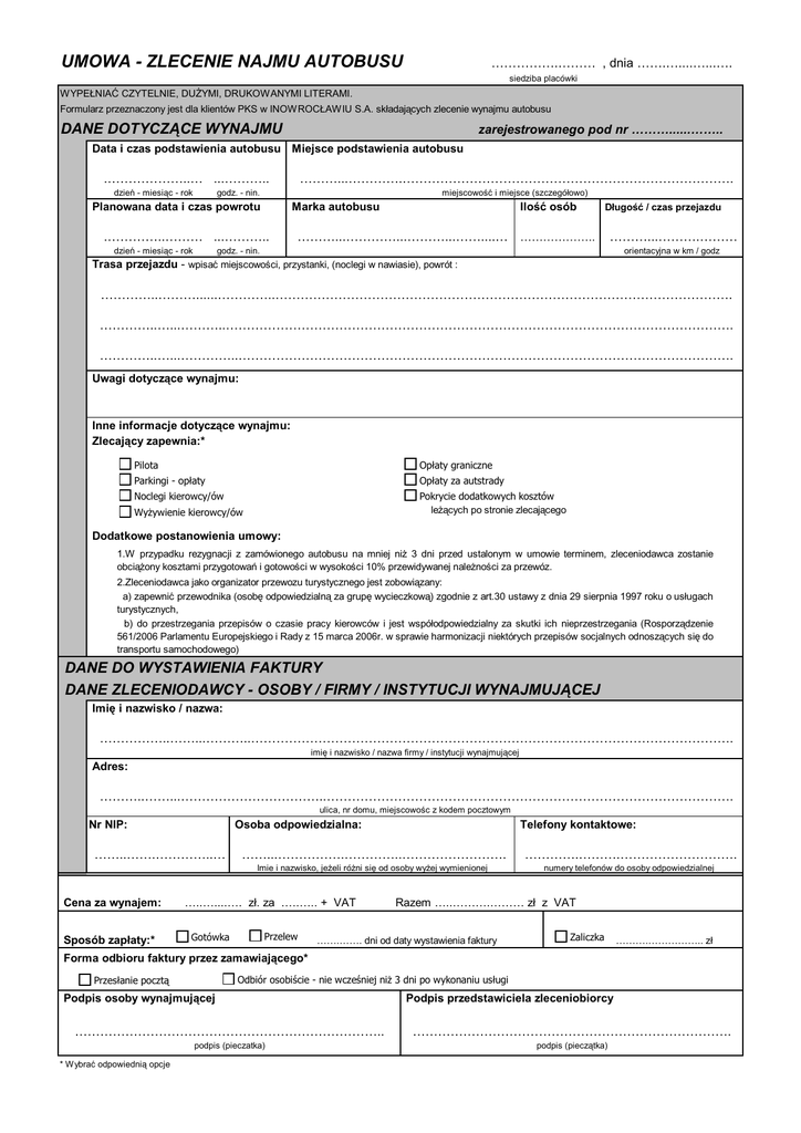 UMOWA - ZLECENIE NAJMU AUTOBUSU …………….……… , dnia …….…....…...…. siedziba placówki WYPEŁNIAĆ CZYTELNIE, DUŻYMI, DRUKOWANYMI LITERAMI. Formularz przeznaczony jest dla klientów PKS w INOWROCŁAWIU S.A. składających zlecenie wynajmu autobusu DANE DOTYCZĄCE WYNAJMU zarejestrowanego pod nr ………......…….. Data i czas podstawienia autobusu Miejsce podstawienia autobusu .………………..… ...……….. dzień - miesiąc - rok ………...………….……………………………………………………………………. godz. - nin. miejscowość i miejsce (szczegółowo) Planowana data i czas powrotu Marka autobusu .…………..……… ...……….. dzień - miesiąc - rok Ilość osób Długość / czas przejazdu ………...…………...………...……....… ……………….. ………...……….……… godz. - nin. orientacyjna w km / godz Trasa przejazdu - wpisać miejscowości, przystanki, (noclegi w nawiasie), powrót : …………..………......…………..………………………………………………………………………………………………. …………..…...………..…………………………………………………………………………………………………………. …………..…...…………..………………………………………………………………………………………………………. Uwagi dotyczące wynajmu: Inne informacje dotyczące wynajmu: Zlecający zapewnia:* Pilota Opłaty graniczne Parkingi - opłaty Opłaty za autstrady Noclegi kierowcy/ów Pokrycie dodatkowych kosztów leżących po stronie zlecającego Wyżywienie kierowcy/ów Dodatkowe postanowienia umowy: 1.W przypadku rezygnacji z zamówionego autobusu na mniej niż 3 dni przed ustalonym w umowie terminem, zleceniodawca zostanie obciążony kosztami przygotowań i gotowości w wysokości 10% przewidywanej należności za przewóz. 2.Zleceniodawca jako organizator przewozu turystycznego jest zobowiązany: a) zapewnić przewodnika (osobę odpowiedzialną za grupę wycieczkową) zgodnie z art.30 ustawy z dnia 29 sierpnia 1997 roku o usługach turystycznych, b) do przestrzegania przepisów o czasie pracy kierowców i jest współodpowiedzialny za skutki ich nieprzestrzegania (Rosporządzenie 561/2006 Parlamentu Europejskiego i Rady z 15 marca 2006r. w sprawie harmonizacji niektórych przepisów socjalnych odnoszących się do transportu samochodowego) DANE DO WYSTAWIENIA FAKTURY DANE ZLECENIODAWCY - OSOBY / FIRMY / INSTYTUCJI WYNAJMUJĄCEJ Imię i nazwisko / nazwa: ……………..……...………..……………………………………………………………………………………………………. imię i nazwisko / nazwa firmy / instytucji wynajmującej Adres: ………..……...……………………………..……………………………………………………………………………………. ulica, nr domu, miejscowośc z kodem pocztowym Nr NIP: Osoba odpowiedzialna: ……..…….…………..… Cena za wynajem: Sposób zapłaty:* ……...…………….…………..……………………. ………….……….………………………. Imie i nazwisko, jeżeli różni się od osoby wyżej wymienionej numery telefonów do osoby odpowiedzialnej …..…....…. zł. za .….….. + VAT Gotówka Telefony kontaktowe: Przelew Razem …..……….……… zł z VAT …….……. dni od daty wystawienia faktury Zaliczka ……….…………….. zł Forma odbioru faktury przez zamawiającego* Odbiór osobiście - nie wcześniej niż 3 dni po wykonaniu usługi Przesłanie pocztą Podpis osoby wynajmującej Podpis przedstawiciela zleceniobiorcy ……………………………………………………………….. …………………………………………………………………. podpis (pieczatka) podpis (pieczątka) * Wybrać odpowiednią opcje