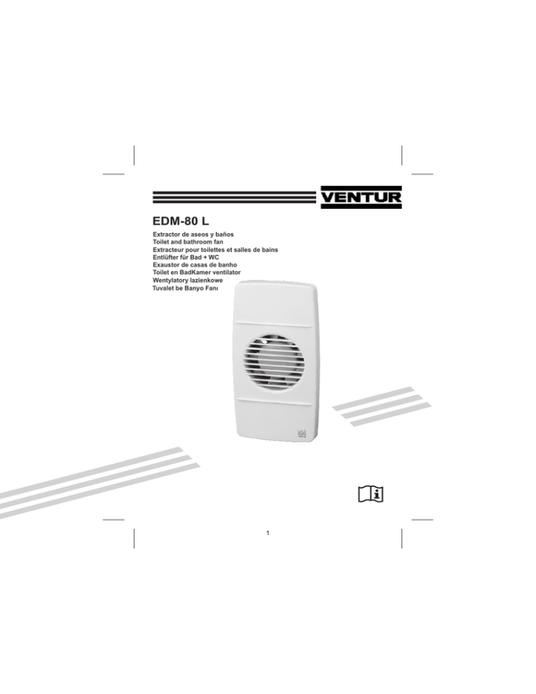 EDM-80 L Extractor de aseos y baños Toilet and bathroom fan Extracteur pour toilettes et salles de bains Entlüfter für Bad + WC Exaustor de casas de banho Toilet en BadKamer ventilator Wentylatory lazienkowe Tuvalet be Banyo Fani 1 Fig. 1 3 Fig. 4 Fig. 2 Fig. 3 4 a b Fig. 6 Fig. 5 Fig. 7 Fig. 8 5 Instrucciones de uso e instalación Rogamos compruebe el perfecto estado y funcionamiento del aparato al desembalarlo, ya que cualquier defecto de origen que presente está amparado por la garantía SP. a la pared, con los dos tornillos que también se suministran (Fig. 3), comprobando que el aparato no quede oprimido para evitar que se impida el giro de la hélice o se produzcan ruidos. Conexión eléctrica EDM-80 L es un extractor preparado para alimentarse de una red monofásica, con la tensión y frecuencia que se indica en su placa de características. Incorpora doble aislamiento eléctrico, por lo que no es una toma de tierra. En la instalación eléctrica deberá incluirse un interruptor omnipolar de una distancia de abertura entre contactos de al menos 3 mm. Para realizar la conexión hay que introducir el cable por el pasacables, tal como se indica en la Fig. 5b (en ningún caso como en la Fig. 5a), y pasarlo por la brida. La conexión se realizará de una u otra manera dependiendo del modelo. La rejilla del EDM-80 L (Fig. 4) dispone de varias muescas para facilitar el paso del cable. Escoja la muesca que más se ajuste a sus necesidades, agujereándola e introduzca en ella el pasacables. Instalación Muy importante: Antes de proceder a la instalación y conexión del aparato, asegurarse de desconectar el suministro eléctrico. El EDM-80 L es un extractor axial de presión, especialmente diseñado para adaptarse al mismo emplazamiento que la rejilla del sistema de ventilación comunitaria (Fig.1). Previamente a la instalación desenroscar el tornillo situado en la rejilla de protección del extractor y retirar ésta hacia afuera (Fig. 2). Para proceder a la instalación de seberá extraer la rejilla del sistema de ventilación comunitario e introducir la boca de salida del extractor, ajustándolo con la cinta adhesiva que se suministra junto con el aparato. Con el fin de asegurar una perfecta sujeción, fijar el extractor 6 EDM-80 L / LZ La conexión puede realizarse directamente al interruptor de la luz (Fig. 6), sistema más común cuando la instalación es un aseo o baño, o bien a un interruptor independiente (Fig. 7). EDM-80 LR / LRZ Modelo que incorpora un temporizador ajustable entre 1 y 30 minutos, que le permite permanecer en funcionamiento durante el tiempo fijado por la temporización, una vez desconectado el interruptor (Fig. 8). Le recomendamos no intente desmontar más piezas que las indicacas, ya que cualquier manipulación anularía automáticamente la garantía SP. Si detecta cualquier anomalía acuda a la amplia Red de Servicios oficiales SP. 7 When individual outlet ducting is used, standard 100 mm Ø diameter should be used. In this case, the self adhesive tape supplied should be used to seal the gap between the fan and the duct. Operating and installation instructions Please check that your unit is in perfect conditions when unpackaging it, as any defect of manufacturing is covered by the SP guarantee. Installation Important: be sure to switch off the power supply before installing and making the electrical connections Wiring The EDM-80 L is suitable for connection to a single phase supply at the voltage and frecuency indicated on the rating plate. This appliance has double (Class II) electrical insulation and therefore does not require earthing. Connection terminals are situated under the front cover. There should be a double pole isolating switch in the installation (with a contacting opening of at least 3 mm). For surface wiring pass the calbe through cable gland as shown in Fig. 5b (not as Fig. 5a) then under the cable anchorage secure. For recessed wiring, open membrane in fan back plate, pass cable through and secure with cable anchorage. The EDM-80 L is particularly suitable for ventilation of bathrooms, toilets, showers, etc. either discharging to outside, or through individual ducts and ducting systems, and has been specially designed for fitting in the same location as a standard builders wall vent. Before installation, remove the front grille by loosening the fixing screw (Fig. 2). A circular hole approximately 100 mm Ø diameter must be made in the wall or ceiling and the fan spigot inserted into the hole, fixing the fan casing by means of the wall plugs and screws supplied. Ensure that there are no obstructions to the airflow is discharge is to outside or into a communal ventilation system. 8 EDM-80 L / LZ The connection may be made in such a way that fan comes into operation when the light is switched on (Fig. 6), alternatively an independent switch may be used (Fig. 7). EDM-80 LR / LRZ Model fitted with an adjustable timer (1-30 min.) enables the extractor to continue running during the time delay, after the switch has been switched off (Fig. 8). We recommend you not to try and remove any more parts than those mentioned as any tampering would automatically cancel the SP guarantee. 9 Instructions d'installation et d'emploi Après l'avoir sorti de son emballage, nous vous prions de vérifier le parfait état de l'appareil, étant donné que tout éventuel défaut d'origine est couvert par la garantie SP. monophasé aux tension et fréquence indiquées sur la plaque caractéristique. Sa double isolation électrique classe II fait qu'il n'est pas nécessaire de raccorder la prise de terre. Pour l'installation électrique prévoir un interrupteur omnipolaire ayant une ouverture de contact d'au moins 3 mm. Pour réaliser le raccordement, introduire le câble par le passecâbles comme l'indique la Fig. 5b (jamais comme indiqué Fig. 5a) et le passer par la bride de serrage. La grille de l'EDM-80 L (Fig. 4) dispose de plusieurs encoches permettant le passa