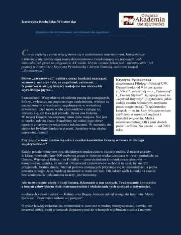 Katarzyna Bocheńska-Włostowska Zagubieni bo zaczatowani, zaczatowani bo zagubieni C oraz częściej i coraz więcej mówi się o uzależnieniu internetowym. Korzystający z Internetu nie zawsze dają wiarę doniesieniom o zwiększającej się populacji osób zniewolonych przez to osiągniecie XX wieku. O tym, czymże takim jest „zaczatowanie" już poniżej w rozmowie z Krystyną Pytlakowską i Jerzym Gomułą, autorami książki „Zaczatowani". Słowo „zaczatowani" nabiera coraz bardziej znaczącej wymowy, oznacza tyle, co zagubieni, zatraceni… A państwo w swojej książce nadajecie mu niezwykle wyrazistego piętna... I zaczadzeni. Wszystkie te określenia pasują do czatujących, którzy, zwłaszcza na etapie ostrego uzależnienia, właśnie są zaczadzonymi straceńcami, zagubionymi w wirtualnej przestrzeni. Być może wielu czatowników czytając to, obruszy się, ale taka jest prawda. Bywa ona bolesna. W naszej książce poświęcamy temu dużo miejsca. Nie jest to laurka, oda do czatu. Staraliśmy się oddać jego obraz zgodnie z naszymi przeżyciami i odczuciami. W stosunku do siebie też byliśmy bardzo krytyczni. Jesteśmy więc chyba usprawiedliwieni? Krystyna Pytlakowska — absolwentka Filologii Polskiej UW. Dziennikarka od 9 lat związana z „Vivą!", wcześniej — z „Panoramą" i „Twoim Stylem". Jej specjalność to „wywiad intymny" (o pytaniach, jakie zadaje swoim bohaterom, napisano prace magisterską). Współautorka książek — m.in. Lwy (nie)ujarzmione czyli żony o sławnych mężach i Szaszłyk po polsku. Matka osiemnastoletniej Oli i pani dwóch psów i królika. Na czacie — od 2001 roku. Czy popularność czatów wynika z zaniku kontaktów twarzą w twarz w dialogu międzyludzkim? Każdy podaje rożne powody, dla których spędza czas w świecie online. Z naszej ankiety, w której przebadaliśmy 300 osobową grupę w różnym wieku czatującą w trzech portalach: na Onecie, Wirtualnej Polsce i na Paltalku — amerykańskim komunikatorze głosowo — kamerowym, wynika, że niemal 100 procent czatowników wchodzi na czat, by znaleźć przyjaciela, bratnią duszę. Niemal połowa czatujących przyznaje się do nieśmiałości, a jedna czwarta do tego, że są bardziej nieśmiali w realu niż inni. Dla takich osób kontakt na czacie, bez konieczności odsłaniania twarzy, jest bezcenny. Ale to tworzenie ułudy i iluzji świata. Kłamanie o nas samych. Traktowanie kontaktów z innym człowiekiem dość instrumentalnie i obdzieranie tych spotkań z intymności. mielonych i dwóch córek — Kaliny oraz Bogny, którym odciął dostęp do Internetu. Motto życiowe: „Prawdziwa miłość nie potępia". O wiele łatwiej zwierzać się, rozmawiać w sieci niż w realnej rzeczywistości. Łatwiej też kreować siebie, swój wizerunek dopasowywać do własnych wyobrażeń o sobie i marzeń o tym, jakimi chcielibyśmy być. Wiele osób na czacie mija się z prawdą, czyli mówiąc wprost — kłamie. Łatwiej skłamać nie widząc twarzy rozmówcy, nie patrząc mu w oczy. Dialog międzyludzki przenosi się więc powoli do świata wirtualnego, właśnie dlatego, że nie musimy tam stawać realnie z kimś twarzą w twarz. A poza tym znacznie łatwiej, będąc anonimowym, wyrażać szczerze swoje potrzeby. Przytoczymy znowu liczby: 34 procent czatujących szuka tam miłości lub romansu, 12 procent - partnera na całe życie bądź na resztę życia, a 49 procent — cyberseksu. W realu nie powiesz komuś nieznajomemu, że chcesz się z nim kochać, albo że masz zamiar ułożyć sobie z kimś życie. Do takich rozmów dochodzi dopiero po dłuższym czasie. W sieci ten czas ulega znacznemu skróceniu. Takie tematy porusza się nierzadko już w pierwszej rozmowie. Pamiętajmy jednak, że czat też się zmienia, nowocześnieje. Dziś wielu nałogowców czatu dysponuje już kamerkami i mikrofonami. Trudno więc o nich powiedzieć, że nie stykają się z rozmówcami twarzą w twarz. Mogą jedynie ukryć tożsamość, podać inny wiek, inne miejsce zamieszkania. Są więc półanonimowi. Kontakty w realu są inwestycją, spotkanie w kawiarni kosztuje, przelot samolotem do kogoś na innym kontynencie jest również kosztowny itp. Można jednoczenie iść na randkę w cyberprzestrzeni z kilkoma osobami na privie. W realu to byłoby dość skomplikowane. I wiązałoby się z zaciągnięciem zobowiązań. Poza tym więcej ciekawych osób można spotkać w sieci w krótszym czasie niż w świecie offline. Kiedy jest się po raz pierwszy na czacie, to on odrzuca. Widzimy szereg zaszyfrowany informacji, wulgaryzmów, wyrażeń odnoszących się do intymnej sfery naszego życia… A mimo to wiele osób pojawia się tam każdego dnia... Jerzy Gomuła — absolwent Uniwersytetu Jagiellońskiego. Stażysta na uniwersytetach w Monachium, Leeds, Rzymie i Padwie. Filozof, informatyk, terapeuta. Zajmuje się testami psychologicznymi i terapią osób o specjalnych potrzebach. Jego pasją jest Znowu wracamy do kwestii anonimowości. To ona badanie sztucznej inteligencji i jej wyzwala agresje, brutalność, ponieważ ludzie ukryci pod nikami czują się bezkarni. Jan Kowalski zastosowania w systemach ekspertowych wspomagających diagnostykę w realu nie będzie używał obelżywych słów czy psychologiczną (współautor wielu np. obrażał kolegów z pracy, gdyż od razu zostałby publikacji na ten temat). Prawdziwym wykluczony z grona współpracowników. Na czacie uniwersytetem okazał się dla niego czat. pozwala sobie na dawanie upustu negatywnym „Obalił" na nim teorie Z. Freuda, że emocjom, odreagowując realne niepowodzenia, fruwanie we śnie oznacza seks. Jego stresy i kompleksy. Na czacie czuje się panem to surfowanie sieci. Prywatnie sytuacji. Poza tym zachowując się po chamsku szybciejzdaniem zostaje zauważony niżwktoś grzeczny, tiramisu, gruszek, kulturalny. A o to również chodzi, żeby choć w wirtualuwielbiciel być dostrzeganym. Znamy kotletów osoby, kt
