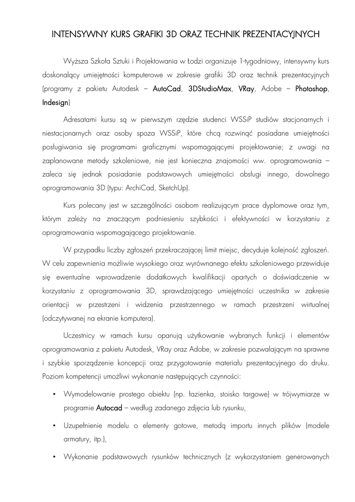 INTENSYWNY KURS GRAFIKI 3D ORAZ TECHNIK PREZENTACYJNYCH Wyższa Szkoła Sztuki i Projektowania w Łodzi organizuje 1-tygodniowy, intensywny kurs doskonalący umiejętności komputerowe w zakresie grafiki 3D oraz technik prezentacyjnych (programy z pakietu Autodesk – AutoCad, 3DStudioMax, VRay, Adobe – Photoshop, Indesign) Adresatami kursu są w pierwszym rzędzie studenci WSSiP studiów stacjonarnych i niestacjonarnych oraz osoby spoza WSSiP, które chcą rozwinąć posiadane umiejętności posługiwania się programami graficznymi wspomagającymi projektowanie; z uwagi na zaplanowane metody szkoleniowe, nie jest konieczna znajomości ww. oprogramowania – zaleca się jednak posiadanie podstawowych umiejętności obsługi innego, dowolnego oprogramowania 3D (typu: ArchiCad, SketchUp). Kurs polecany jest w szczególności osobom realizującym prace dyplomowe oraz tym, którym zależy na znaczącym podniesieniu szybkości i efektywności w korzystaniu z oprogramowania wspomagającego projektowanie. W przypadku liczby zgłoszeń przekraczającej limit miejsc, decyduje kolejność zgłoszeń. W celu zapewnienia możliwie wysokiego oraz wyrównanego efektu szkoleniowego przewiduje się ewentualne wprowadzenie dodatkowych kwalifikacji opartych o doświadczenie w korzystaniu z oprogramowania 3D, sprawdzającego umiejętności uczestnika w zakresie orientacji w przestrzeni i widzenia przestrzennego w ramach przestrzeni wirtualnej (odczytywanej na ekranie komputera). Uczestnicy w ramach kursu opanują użytkowanie wybranych funkcji i elementów oprogramowania z pakietu Autodesk, VRay oraz Adobe, w zakresie pozwalającym na sprawne i szybkie sporządzenie koncepcji oraz przygotowanie materiału prezentacyjnego do druku. Poziom kompetencji umożliwi wykonanie następujących czynności: • Wymodelowanie prostego obiektu (np. łazienka, stoisko targowe) w trójwymiarze w programie Autocad – według zadanego zdjęcia lub rysunku, • Uzupełnienie modelu o elementy gotowe, metodą importu innych plików (modele armatury, itp.), • Wykonanie podstawowych rysunków technicznych (z wykorzystaniem generowanych automatycznie rzutów i przekrojów) oraz ich zwymiarowanie i opisanie, przygotowanie do wydruku do pliku graficznego – z wykorzystaniem gotowych szablonów, • Prawidłowe powiązanie obiektów w oprogramowaniu Autocad i 3D Studio Max, umożliwiające dynamiczne uzgadnianie zmian wersji plików używanych w obu programach, • Przygotowanie tekstury w programie Photoshop, • Wykonanie teksturowania w programie 3D Studio Max, • Wykonanie oświetlenia sceny w 3D Studio Max z wykorzystaniem modeli 3D opraw oświetleniowych symulujących rzeczywiste rodzaje oświetlenia (światło bezpośrednie, pośrednie, kierunkowe, rozproszone, akcentujące, omywające, wallwasher) • Wykonanie wizualizacji (rendering) w programie VRay, z wykorzystaniem gotowych ustawień (tzw. presetów), • Obróbka wizualizacji w programie Photoshop, • Wykonanie planszy prezentacyjnej w programie Indesign oraz przygotowanie materiału do wydruku. W ramach kursu udostępnione zostaną biblioteki materiałów oraz obiektów, będzie można również skorzystać z pomocy prowadzących w instalacji i optymalizacji oprogramowania Autodesk w wersji edukacyjnej na posiadanym przez kursanta sprzęcie komputerowym. Przewiduje się ponadto, iż każdy uczestnik kursu otrzyma materiały w postaci wydrukowanego skryptu zawierającego treści prezentowane w trakcie omawiania kolejnych bloków tematycznych. Z uwagi na intensywny charakter kursu, wymagane będzie uczestnictwo we wszystkich zajęciach oraz realizacja zadanych ćwiczeń (pod opieką instruktora oraz w ramach pracy własnej) – należy wziąć pod uwagę konieczność zapewnienia sobie dodatkowego czasu na ich ewentualną realizację po godzinach zajęć (w zależności od stopnia zaawansowania uczestnika kursu). Terminy: 25 – 31 sierpnia 2013, 1 – 7 września 2013 Miejsce: Wyższa Szkoła Sztuki i Projektowania w Łodzi, ul. Targowa 65 Prowadzący: mgr inż. arch. Piotr Turkiewicz mgr Marek Golec Liczba uczestników jednej edycji: 7 osób Forma zajęć: Łączny wymiar czasu kursu: 7 dni × 8 godzin dziennie = 56 godzin Podział czasu dnia pracy: • 4 godziny zajęć z instruktorem (9.00-13.00), • przerwa obiadowa (obiad we własnym zakresie), • 4 godziny realizacji zadanych ćwiczeń instruktora/asystenta grupy (14.00-18.00), pod opieką • 2-4 godzin pracy własnej (możliwość korzystania ze sprzętu pracowni komputerowej WSSiP) Cena kursu: 800,- zł – dla studentów WSSiP 1150,- zł – dla osób spoza WSSiP W cenie kursu Organizatorzy zapewniają materiały kursowe. Zapisy: Zgłoszenia należy przesyłać na adres e-mail: [email protected], w temacie maila należy wpisać kurs grafiki 3D / imię i nazwisko Wpłaty: Wpłaty należy dokonać na konto bankowe WSSiP 25 1020 3352 0000 180200 110890 w terminie: • zaliczka w wysokości 200 zł – do 31.07.br. • pozostała kwota w wysokości 600 / 950 zł – najpóźniej do 7 dni roboczych przed rozpoczęciem kursu. Wpłacone kwoty nie podlegają zwrotowi